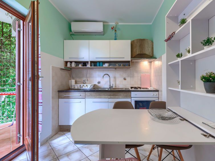 3-room apartment 45 m2, on the ground floor. 1 room with 1 x 2 bunk beds (90 cm, length 200 cm). 1 room with 1 french bed (160 cm, length 200 cm). Kitchen-/living room (2 hot plates, oven, kettle, freezer, electric coffee machine). Shower/WC. Forced-air heating. Balcony 5 m2. Balcony furniture.