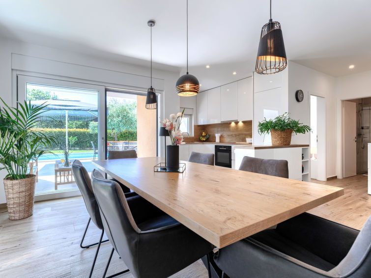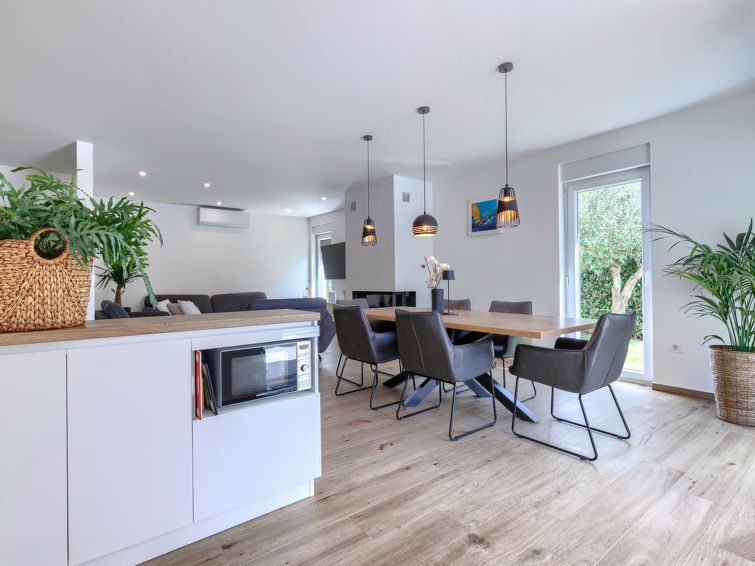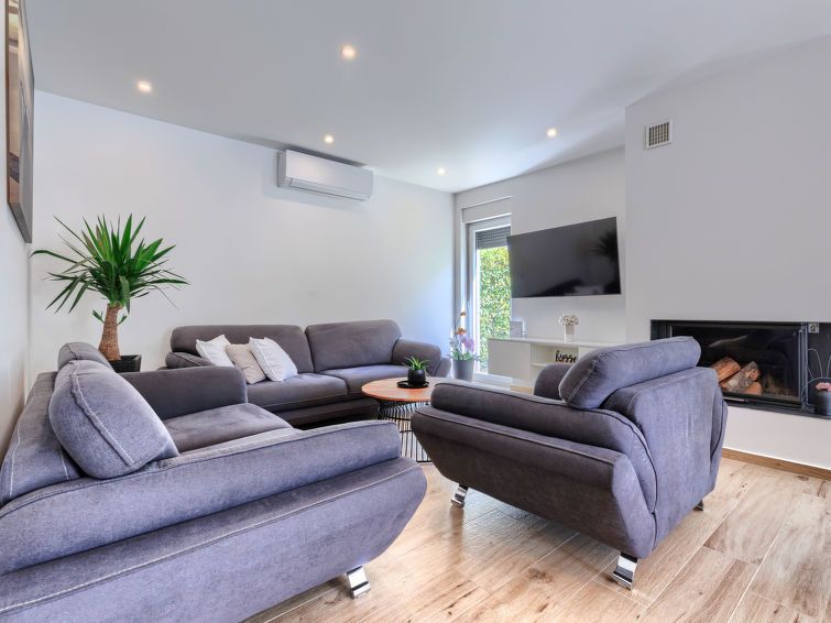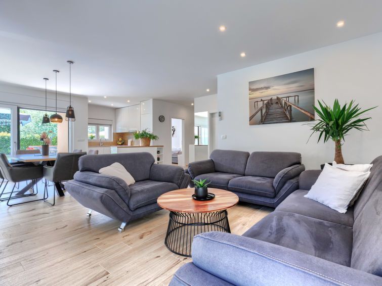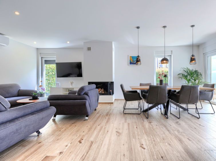5-room semi-detached house 140 m2 on 2 levels. Living/dining room with open-hearth fireplace (only for decoration), satellite TV (flat screen), air conditioning. Exit to the terrace, to the swimming pool. 1 room with 1 french bed (180 cm, length 200 cm), air conditioning. Open kitchen (oven, dishwasher, 4 induction hot plates, toaster, kettle, microwave, freezer, electric coffee machine).