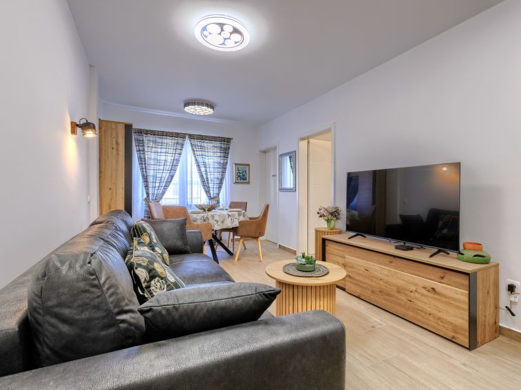 "Darja", 2-room apartment 38 m2 on 2nd floor. Renovated in 2024, beautiful and cosy furnishings: living/dining room with 1 sofabed (140 cm, length 190 cm), TV. 1 room with 1 french bed (160 cm, length 200 cm), TV and air conditioning. Open kitchen (2 hot plates, oven, dishwasher, toaster, kettle, microwave, electric coffee machine).
