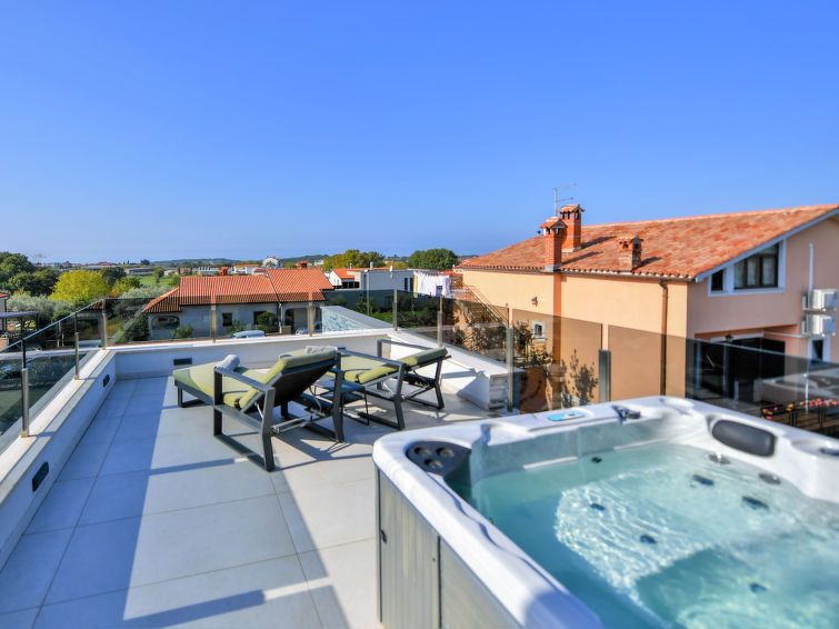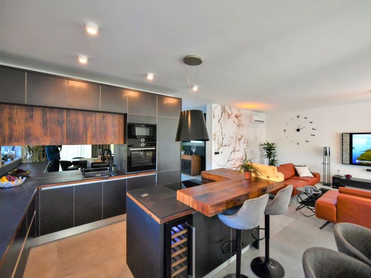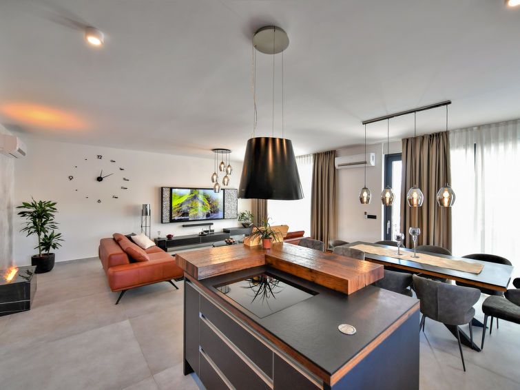 5-room villa 240 m2. Spacious, tasteful furnishings: living/dining room with satellite TV and air conditioning. Exit to the terrace. 1 room with 1 french bed (180 cm, length 200 cm), shower/bidet/WC, satellite TV and air conditioning. Exit to the swimming pool. Open kitchen (oven, dishwasher, 4 induction hot plates, toaster, kettle, microwave, freezer, electric coffee machine).