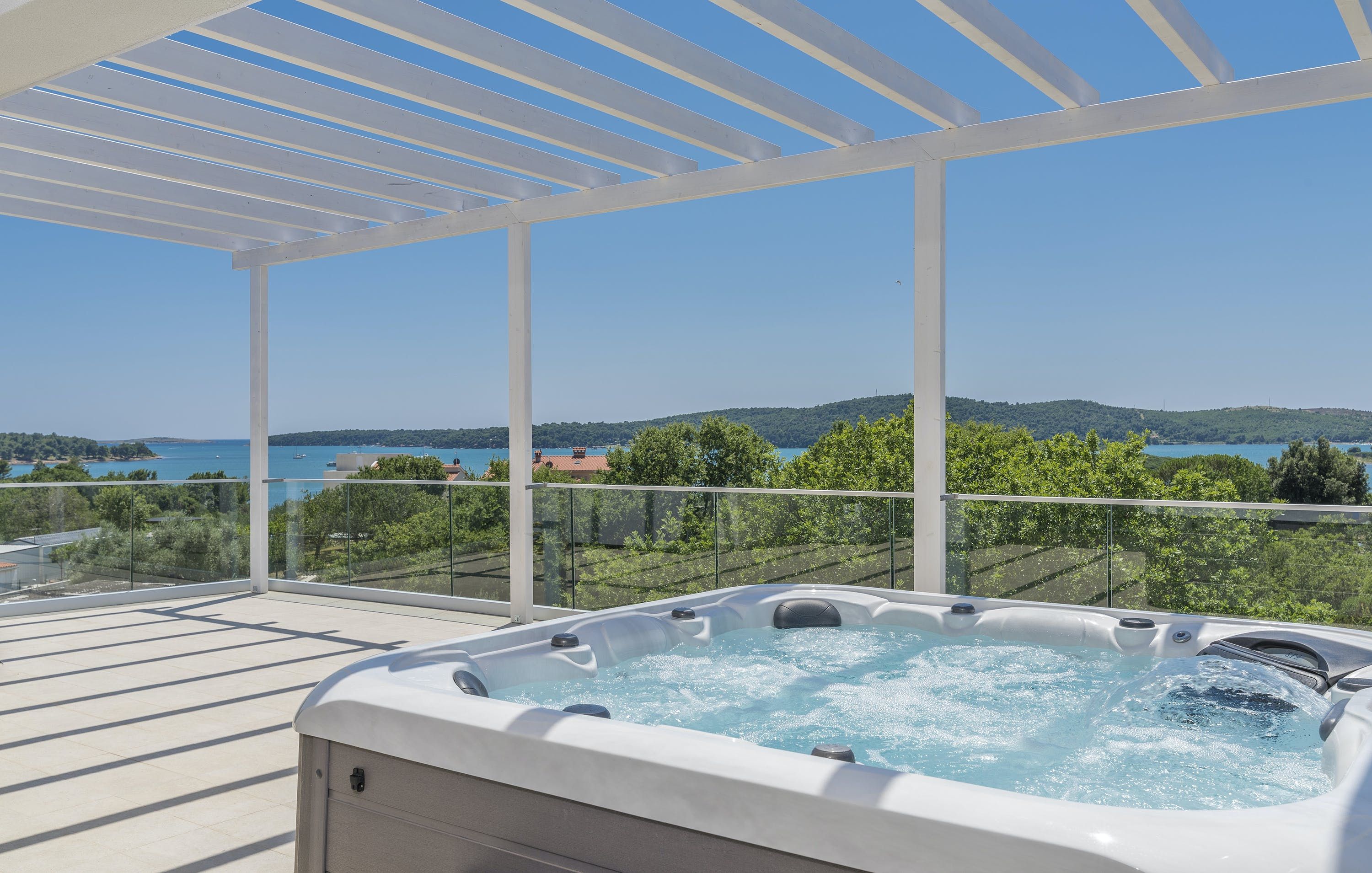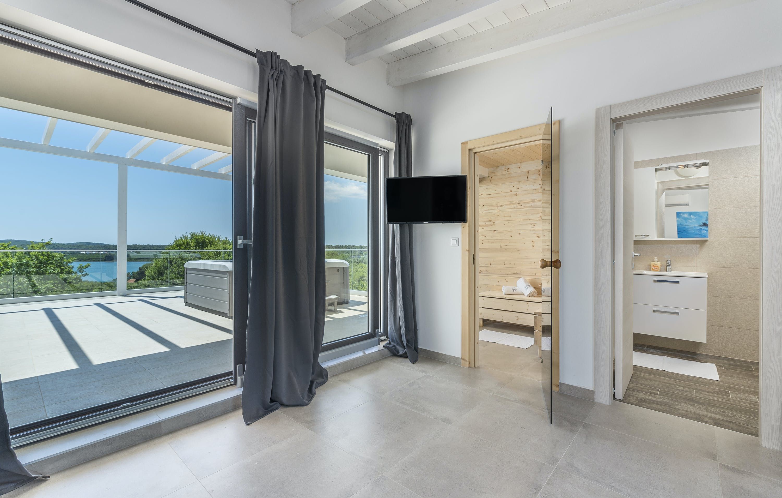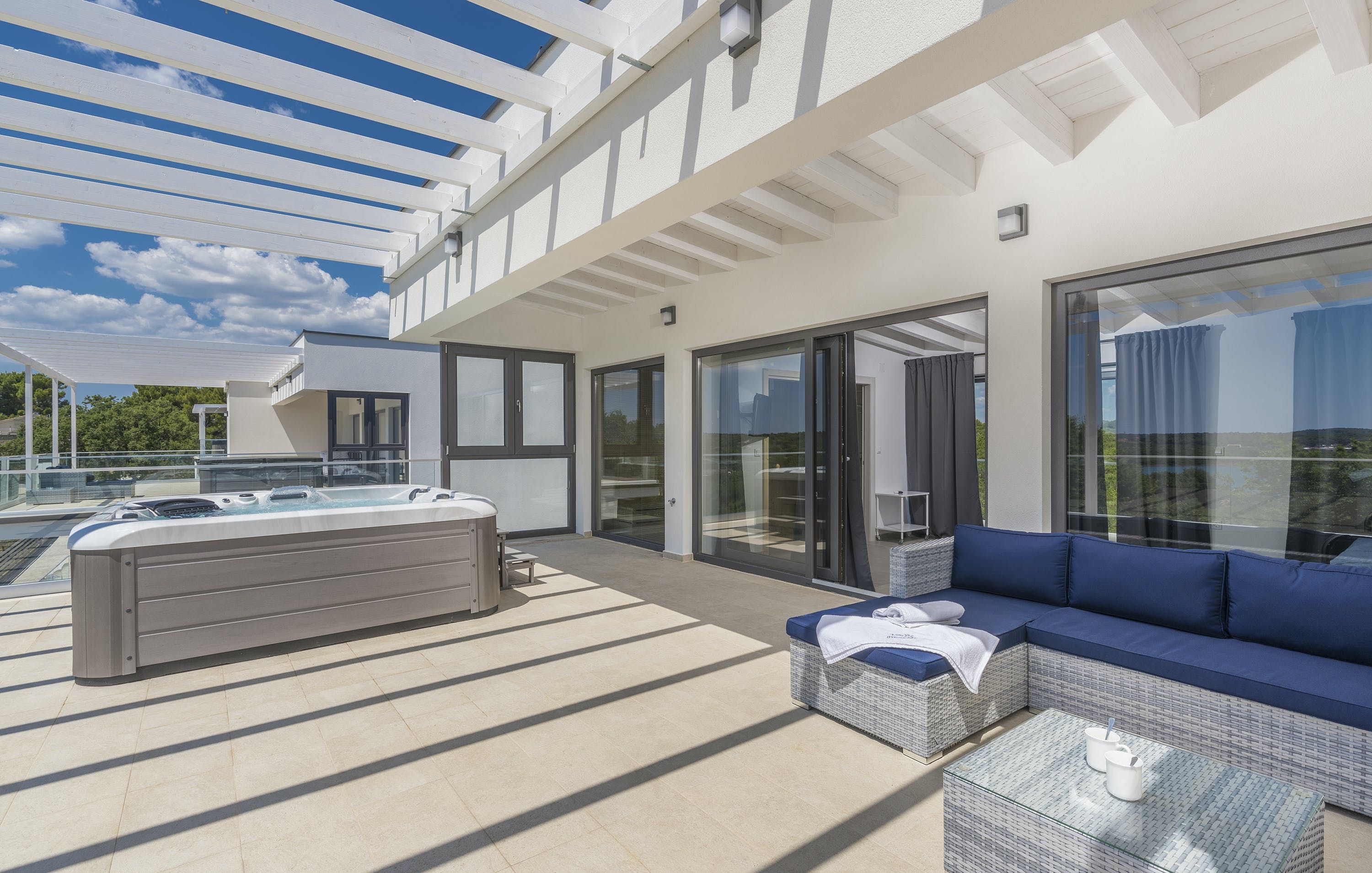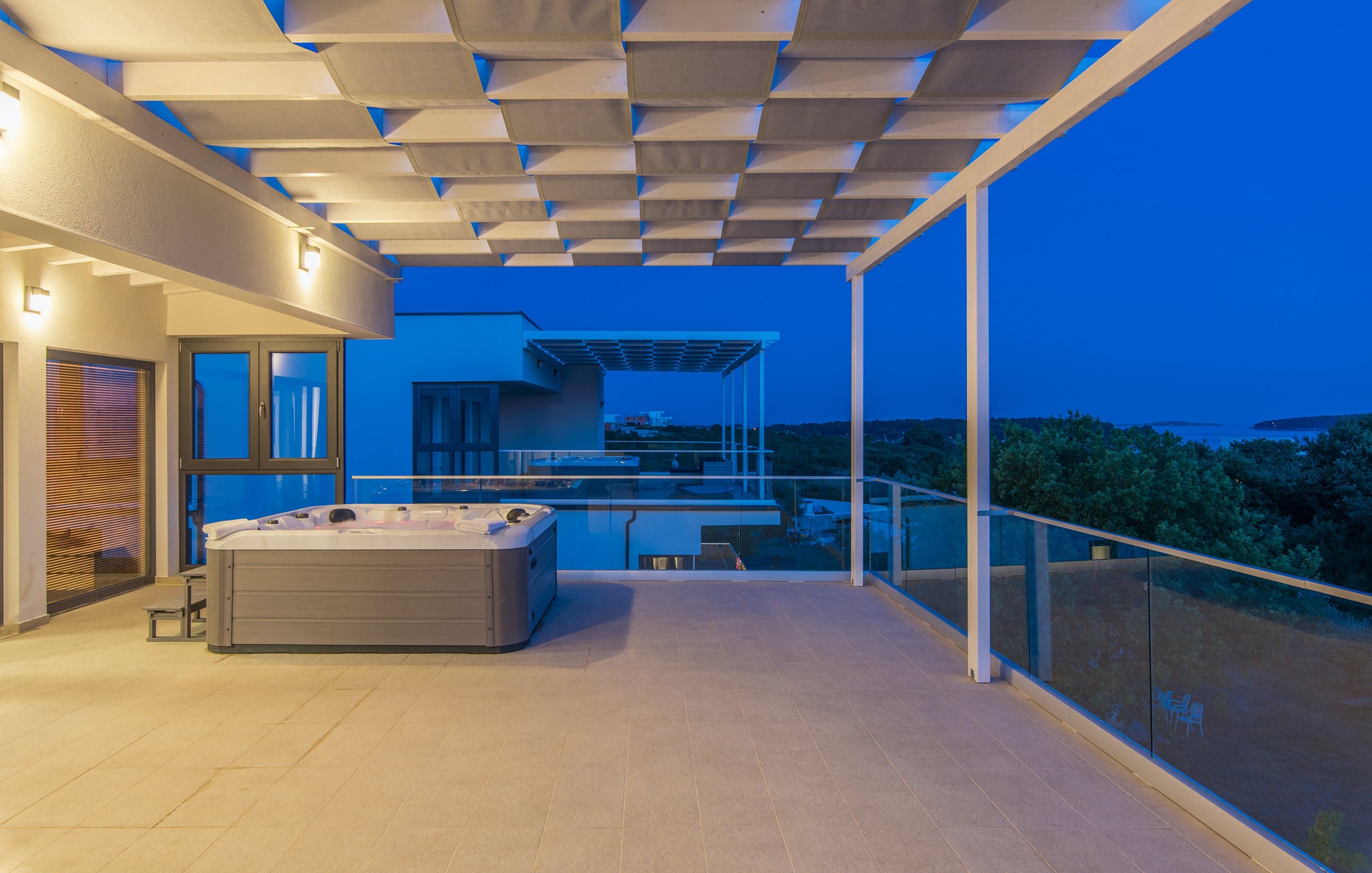 This villa is a stunning, modern vacation home located just 300 meters from the sea in the southern region of Istria. This luxurious property offers a range of exclusive amenities, including multiple terraces and balconies with stunning views, a 36m² pool, and a whirlpool for ultimate relaxation. The well-kept grounds offer privacy despite having direct neighbors. The open-plan living/dining and kitchen area is spacious and ultra-modern, with a trendy white look. The villa features six air-conditioned bedrooms, each with a modern bathroom en suite. Highlights include the sauna with a view of the roof terrace and a small fitness area. With its proximity to Pula and Medulin, guests can enjoy cultural and entertainment options while adventure lovers will appreciate the nearby "Kap Kamenjak" Nature Park in Premantura. The nearest airport in Pula is just 20 minutes away by car. This home is perfect for luxurious vacations with friends or several families seeking quality time in an exclusive location by the sea.