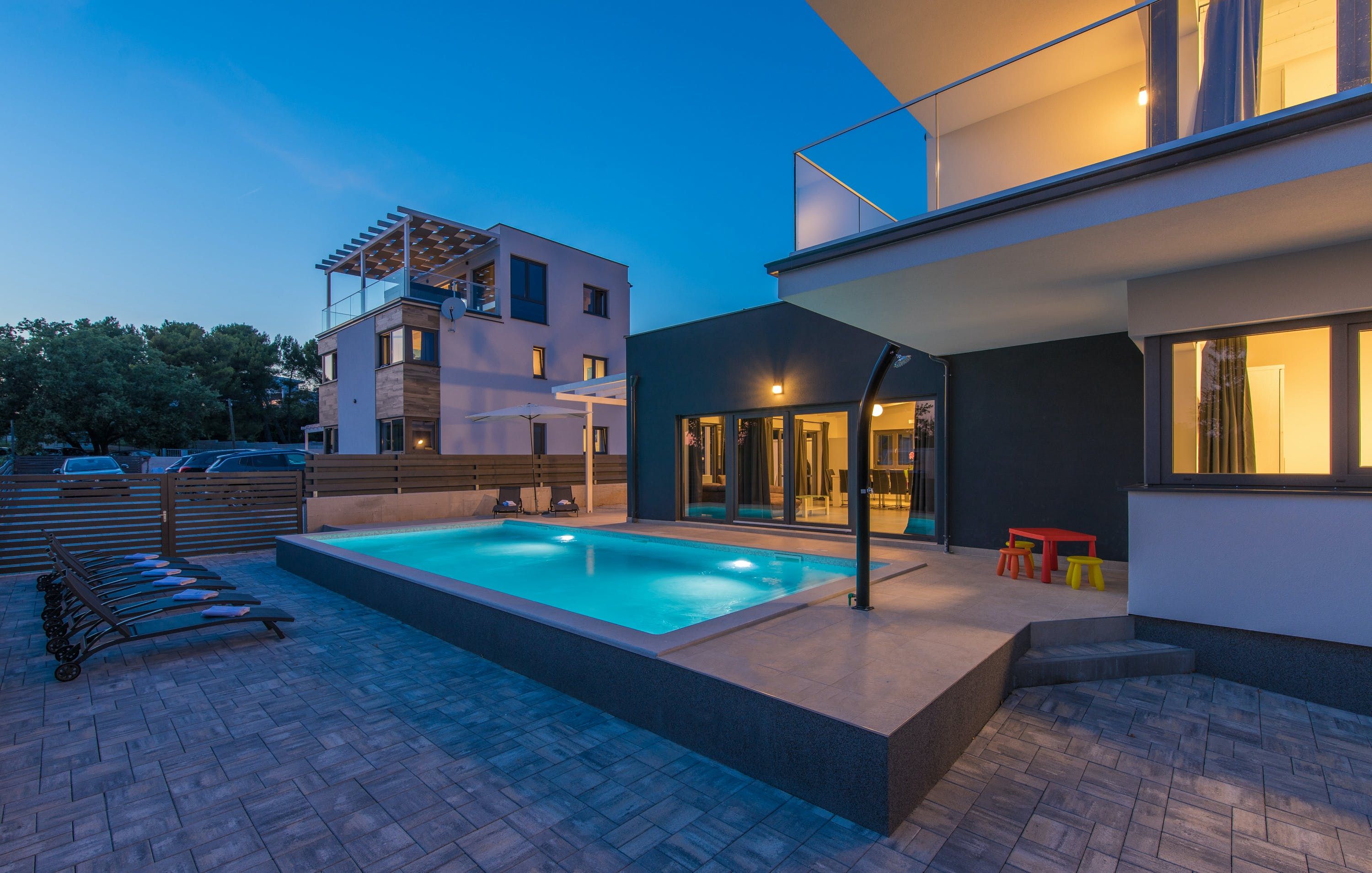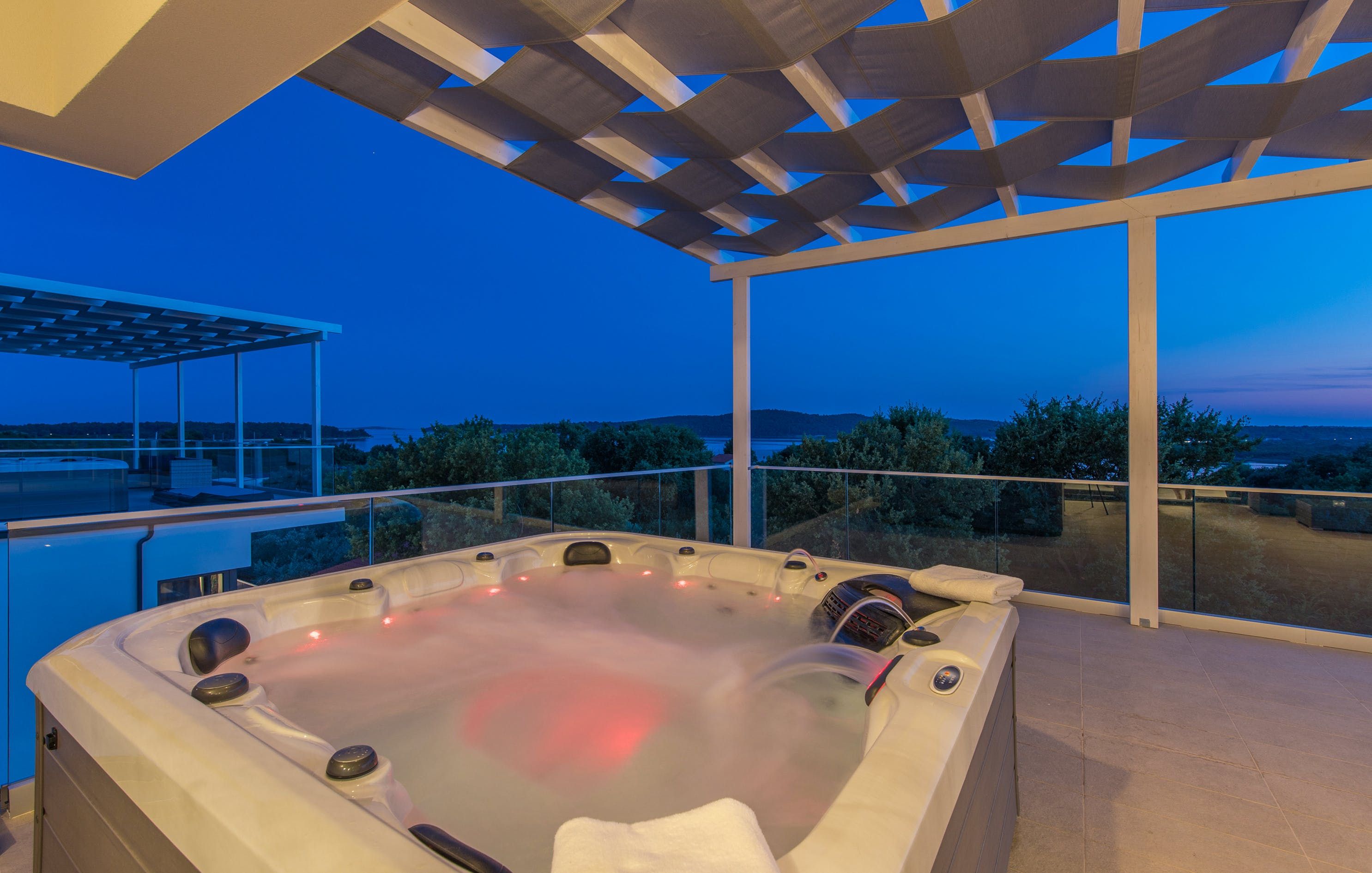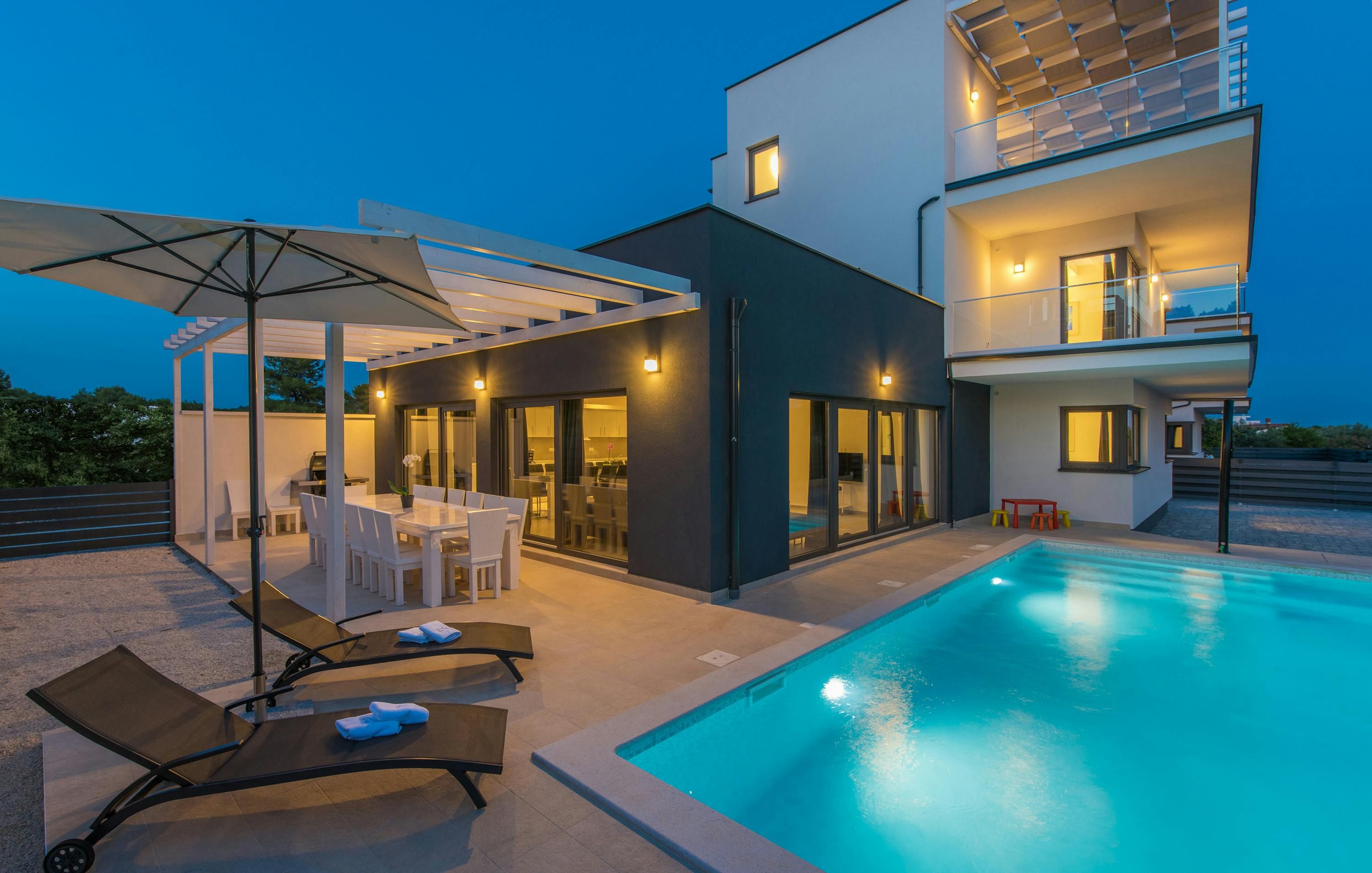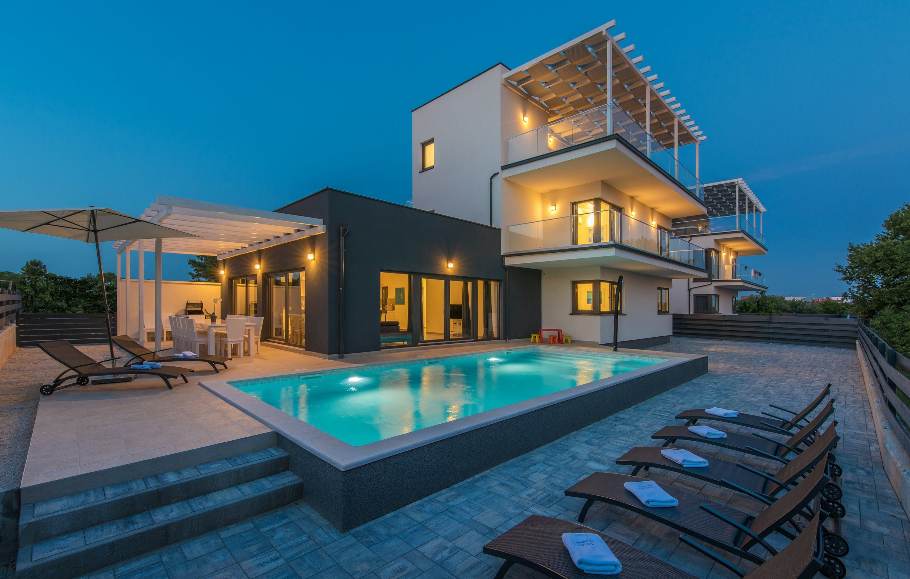 This villa is a stunning, modern vacation home located just 300 meters from the sea in the southern region of Istria. This luxurious property offers a range of exclusive amenities, including multiple terraces and balconies with stunning views, a 36m² pool, and a whirlpool for ultimate relaxation. The well-kept grounds offer privacy despite having direct neighbors. The open-plan living/dining and kitchen area is spacious and ultra-modern, with a trendy white look. The villa features six air-conditioned bedrooms, each with a modern bathroom en suite. Highlights include the sauna with a view of the roof terrace and a small fitness area. With its proximity to Pula and Medulin, guests can enjoy cultural and entertainment options while adventure lovers will appreciate the nearby "Kap Kamenjak" Nature Park in Premantura. The nearest airport in Pula is just 20 minutes away by car. This home is perfect for luxurious vacations with friends or several families seeking quality time in an exclusive location by the sea.