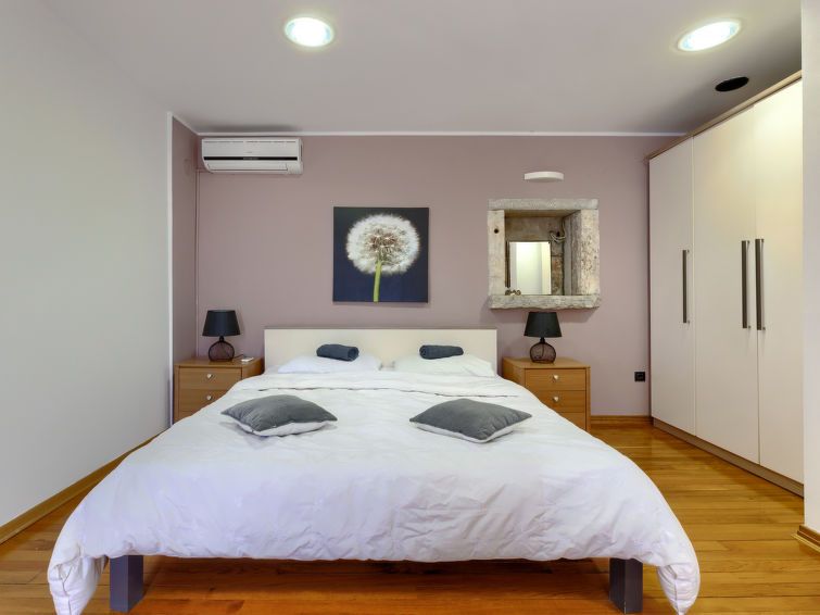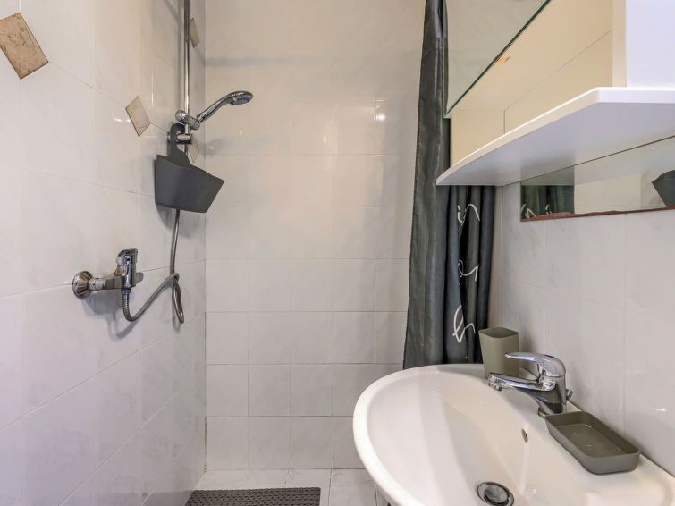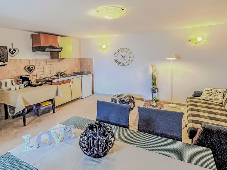 2-room terraced house 42 m2 on 2 levels. Living/dining room with satellite TV and air conditioning. Exit to the terrace. Open kitchen (2 hot plates, oven, toaster, kettle, electric coffee machine). Shower/WC. Upper floor: (steep stair), 1 room with 1 bed, 1 double bed and air conditioning.