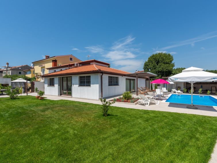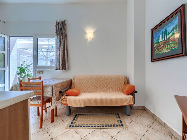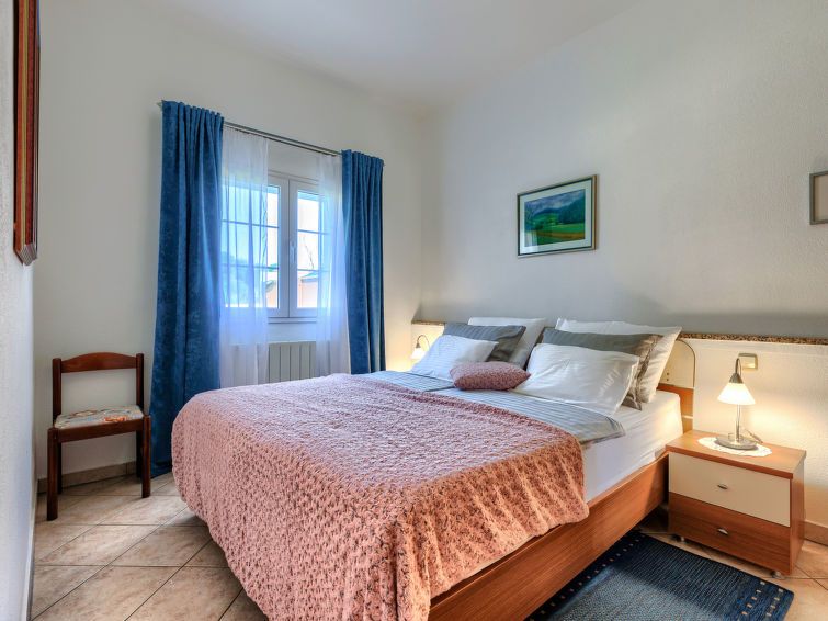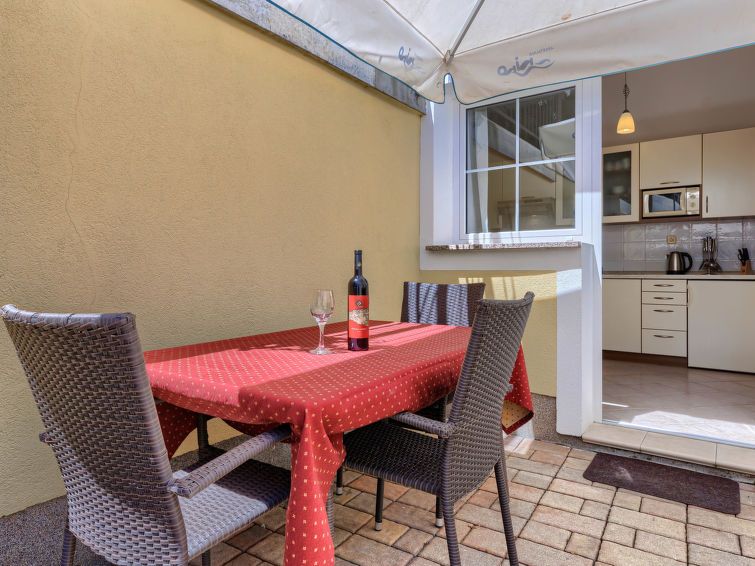 2-room apartment 32 m2, on the ground floor. Living/dining room with satellite TV and air conditioning. Exit to the garden, to the terrace. 1 room with 1 double bed (2 x 90 cm, length 200 cm). Open kitchen (4 hot plates, microwave). Shower/bidet/WC. Terrace 15 m2. Terrace furniture.