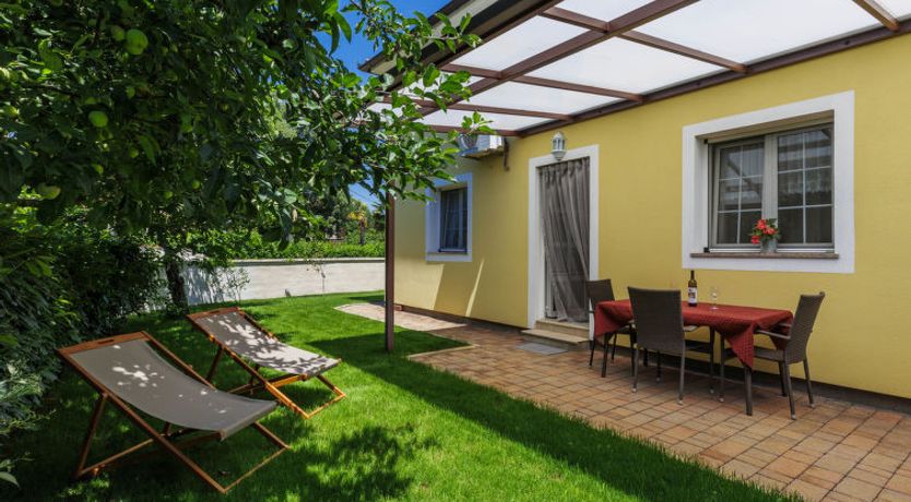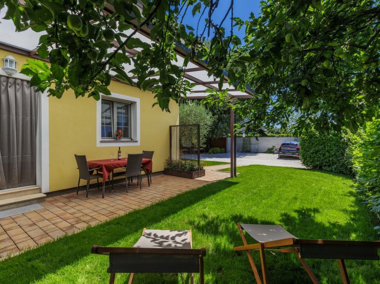 2-room apartment 32 m2, on the ground floor. Living/dining room with satellite TV and air conditioning. Exit to the garden, to the terrace. 1 room with 1 double bed (2 x 90 cm, length 200 cm). Open kitchen (2 hot plates, microwave). Shower/bidet/WC. Terrace 15 m2. Terrace furniture.