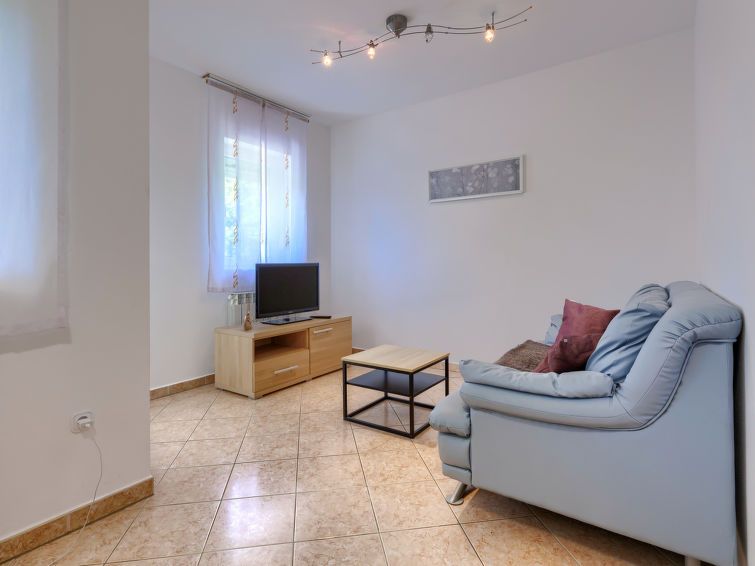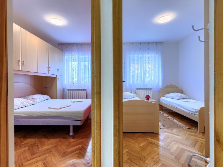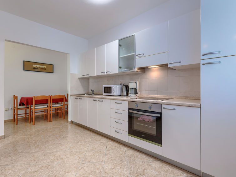 3-room apartment 55 m2, on the ground floor. Comfortable furnishings: living/dining room with satellite TV (flat screen). Exit to the terrace. 1 room with 1 french bed (180 cm, length 200 cm). 1 room with 2 beds (90 cm, length 200 cm). Entrance hall with air conditioning. Open kitchen (4 hot plates, oven, kettle, microwave, freezer, electric coffee machine).
