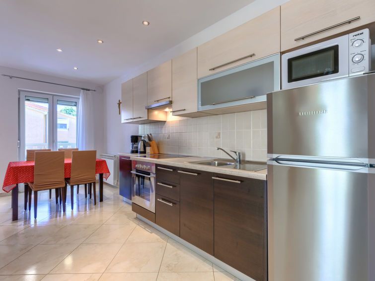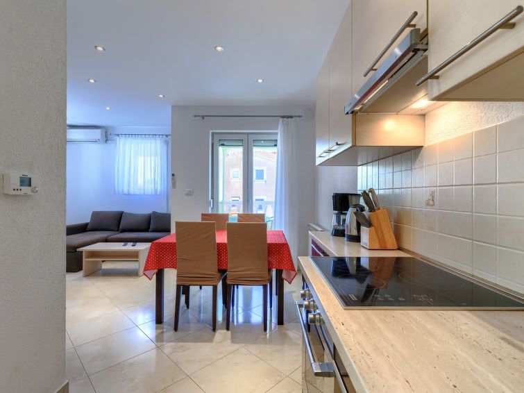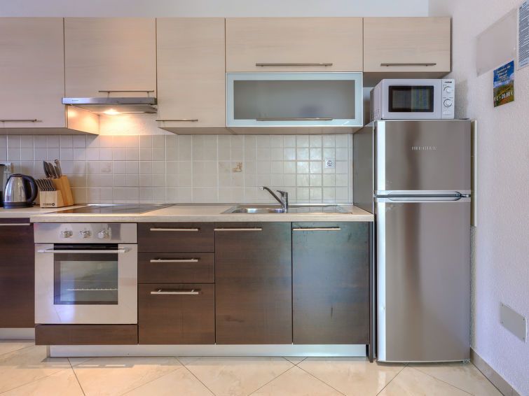 3-room apartment 55 m2 on 1st floor. Comfortable furnishings: living/dining room with satellite TV (flat screen), air conditioning. Exit to the terrace. 1 room with 1 french bed (180 cm, length 200 cm). 1 room with 2 beds (90 cm, length 200 cm). Open kitchen (4 hot plates, oven, kettle, microwave, freezer, electric coffee machine).