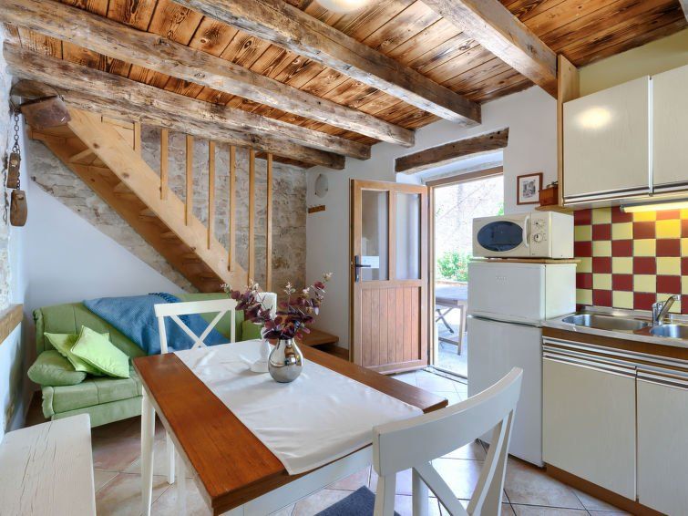 "Pinia I", 2-room terraced house 33 m2 on 2 levels. Living/dining room with 1 sofabed and satellite TV. Open kitchen (1 hot plate, oven, dishwasher, 3 gas rings, toaster, kettle, electric coffee machine). Upper floor: (steep stair) entrance hall with air conditioning. 1 room with 1 double bed.