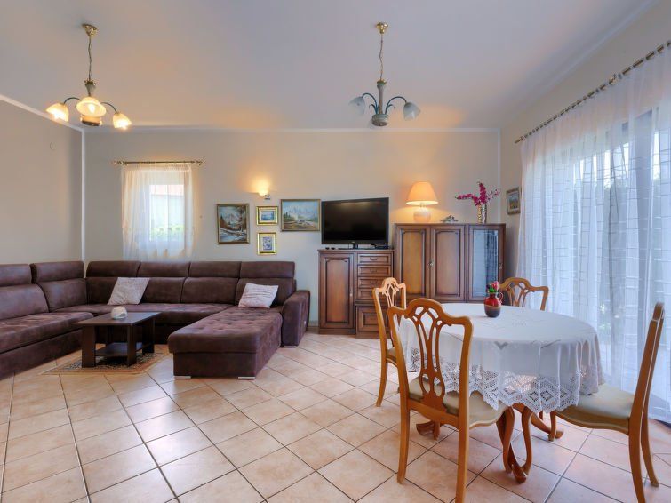 7-room house 320 m2 on 2 levels. Living/dining room with satellite TV. Exit to the terrace, to the swimming pool. Open kitchen (oven, 5 gas rings, toaster, kettle, microwave, freezer, electric coffee machine). Sep. WC. Upper floor: (exterior staircase) walk-through room with 1 double bed (2 x 80 cm, length 200 cm), satellite TV and air conditioning.