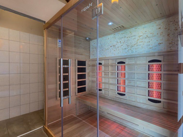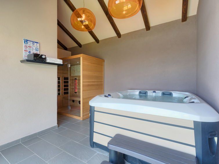4-room villa 170 m2 on 2 levels. Living/dining room with open-hearth fireplace and satellite TV (flat screen). Exit to the terrace. 1 room with 1 double bed (2 x 90 cm, length 200 cm), satellite TV (flat screen), air conditioning. Open kitchen (oven, dishwasher, 4 ceramic glass hob hotplates, microwave, freezer, electric coffee machine).
