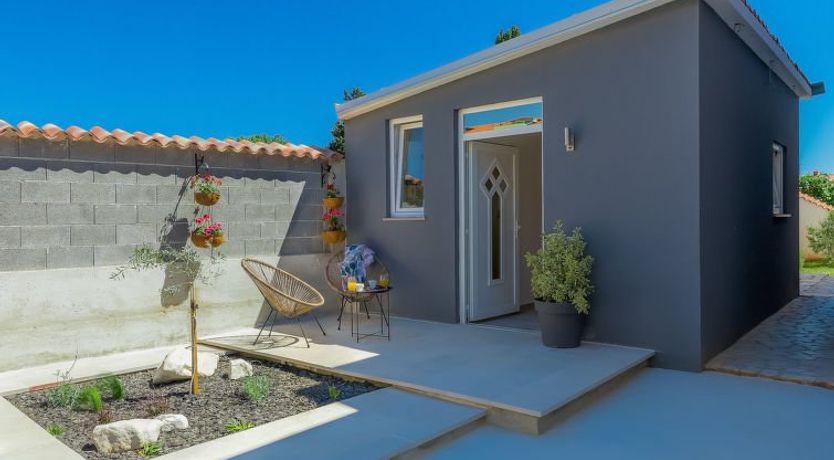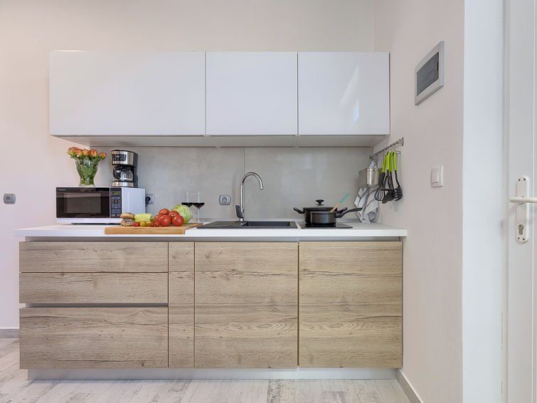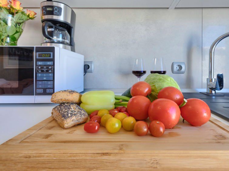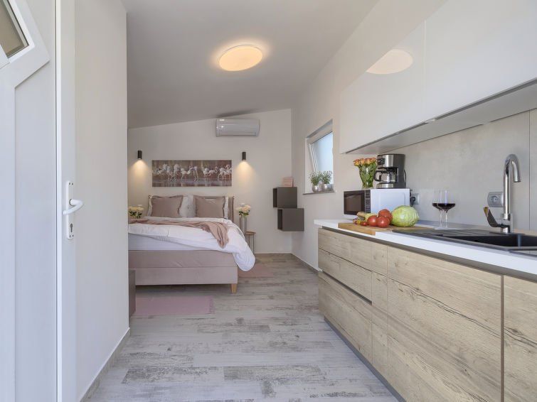 1-room house 20 m2. Beautiful furnishings: living/sleeping room with 1 french bed (140 cm, length 200 cm), dining table and satellite TV (flat screen), air conditioning. Exit to the terrace. Open kitchen (2 ceramic glass hob hotplates, microwave, freezer, electric coffee machine).