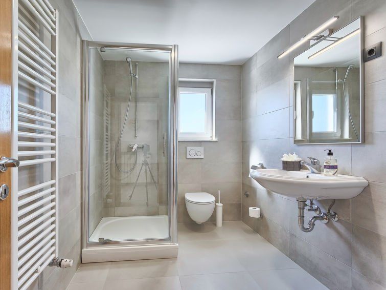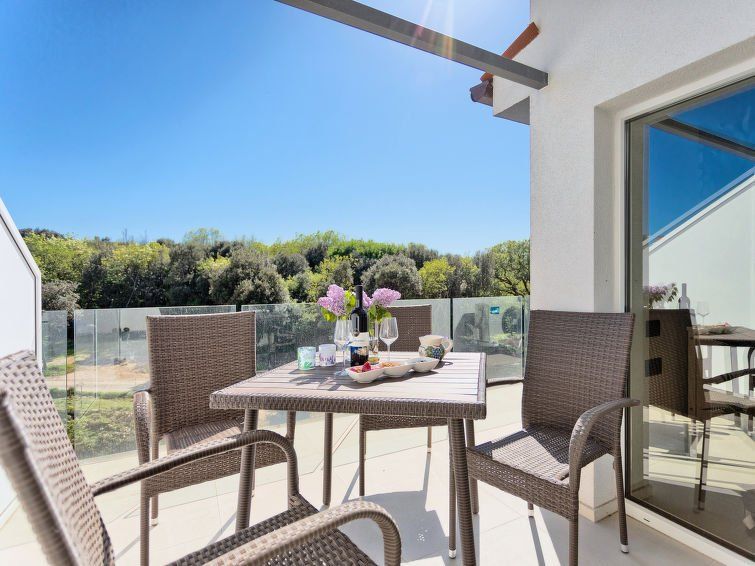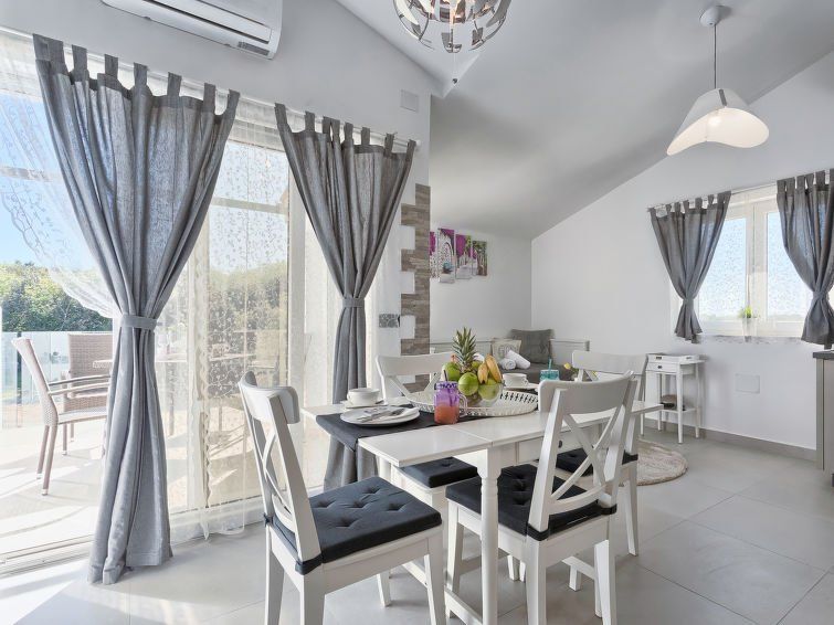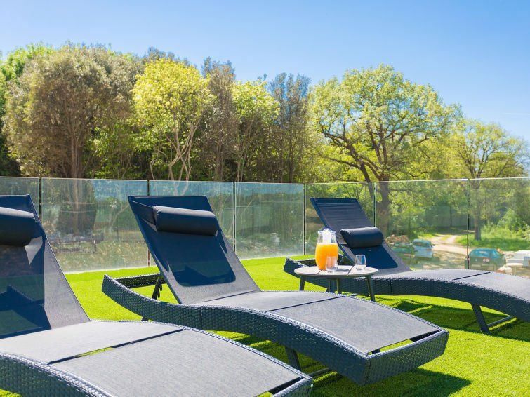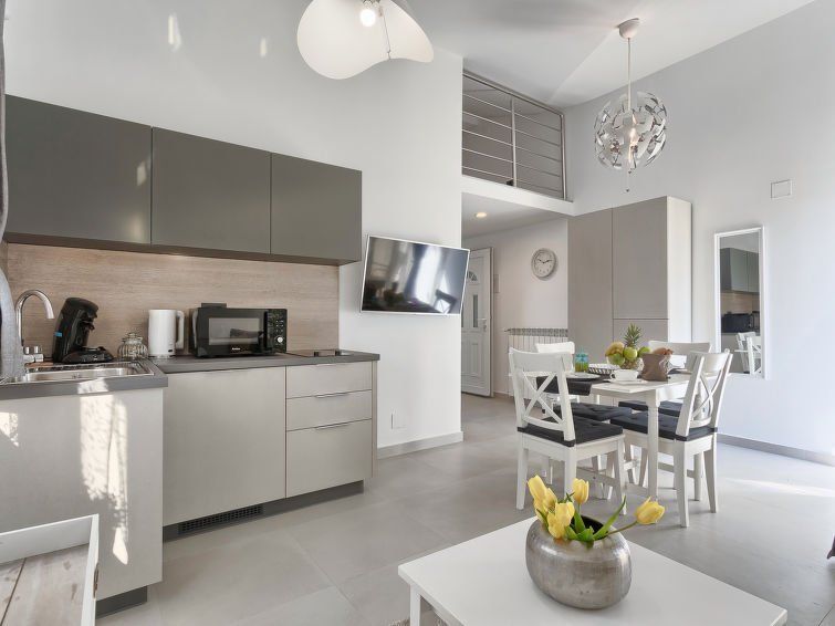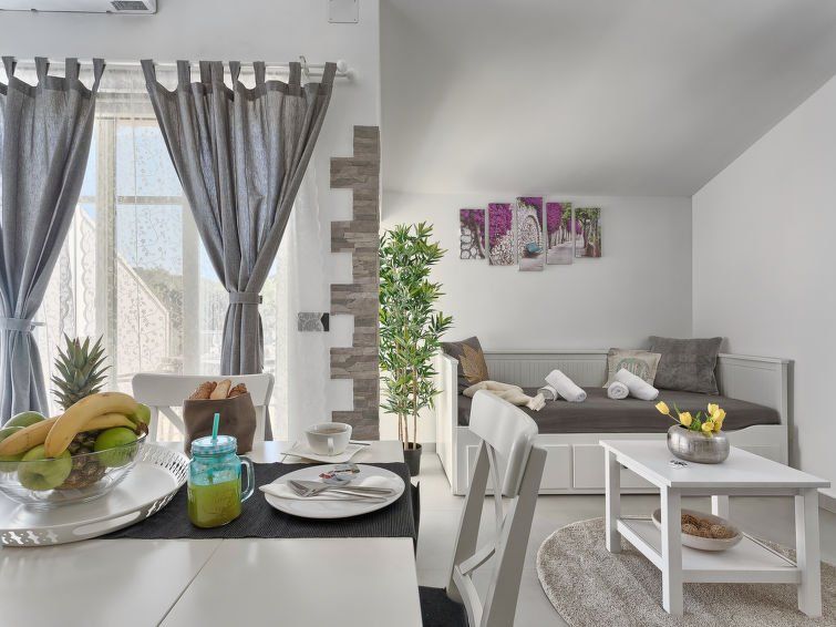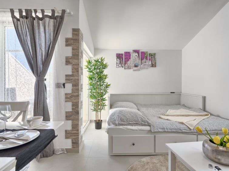 1-room apartment 35 m2 on 1st floor. Studio with 1 pull-out bed (2 pers. 2 x 80 cm, length 200 cm), satellite TV (flat screen), air conditioning. Exit to the terrace. Open kitchen (2 ceramic glass hob hotplates, microwave, electric coffee machine) with dining table. Shower/WC. Forced-air heating.