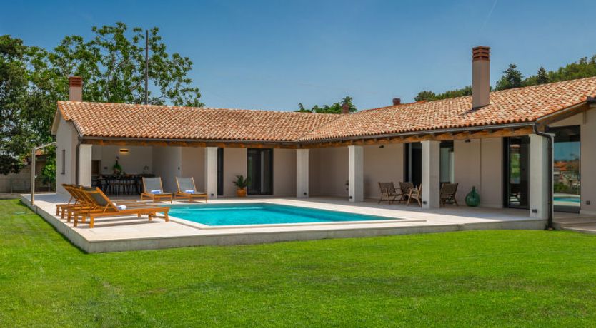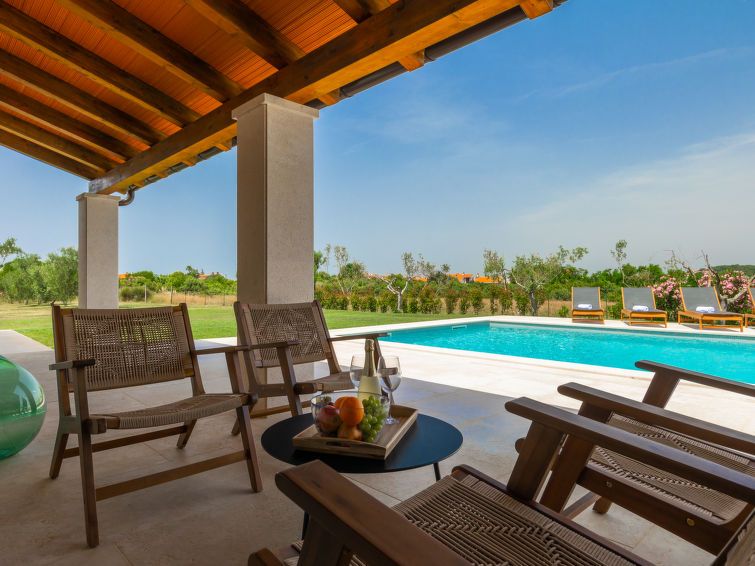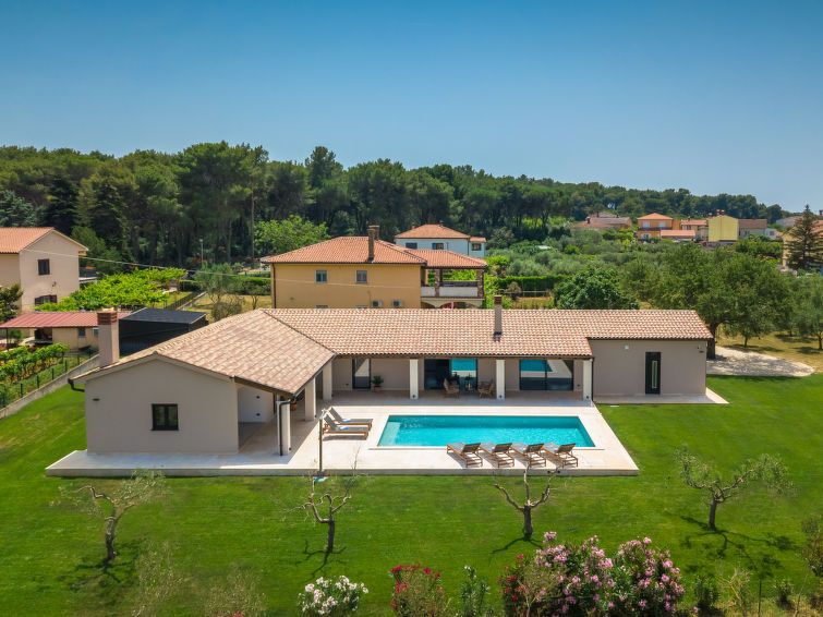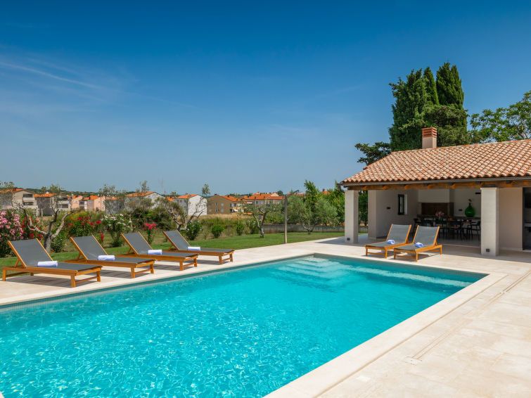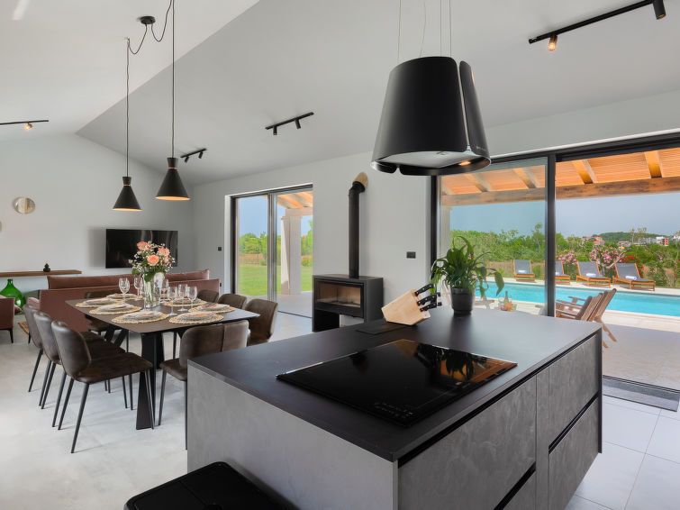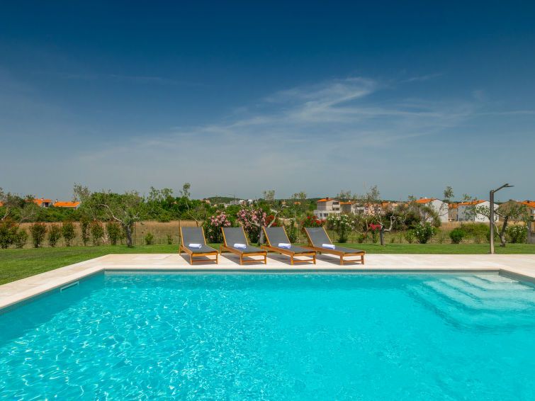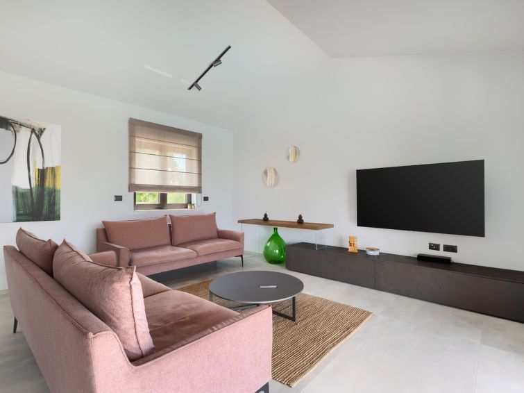 4-room villa 170 m2. Modern and luxurious furnishings: living/dining room with satellite TV and flat screen. Exit to the terrace, to the swimming pool. 3 rooms, each room with 1 double bed (160 cm, length 200 cm), shower/WC and satellite TV (flat screen). Open kitchen (oven, dishwasher, 4 ceramic glass hob hotplates, toaster, kettle, microwave, freezer, electric coffee machine).