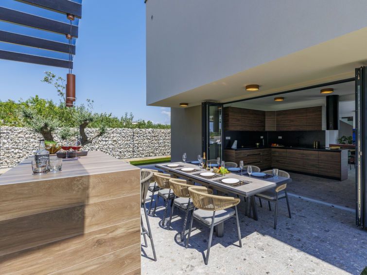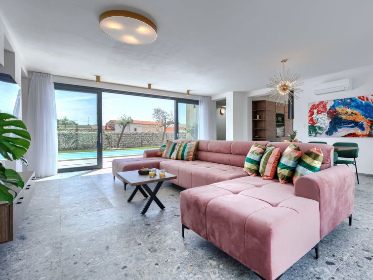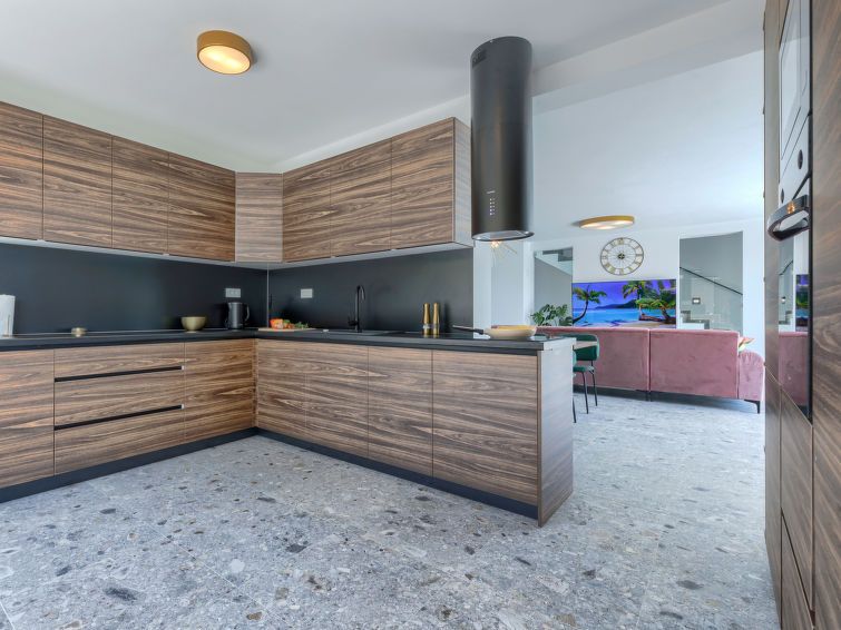 5-room villa 150 m2 on 2 levels. Beautiful and tasteful furnishings: living/dining room 65 m2 with satellite TV (flat screen), air conditioning. Exit to the swimming pool. Open kitchen (oven, dishwasher, 4 ceramic glass hob hotplates, toaster, kettle, microwave, freezer, electric coffee machine).