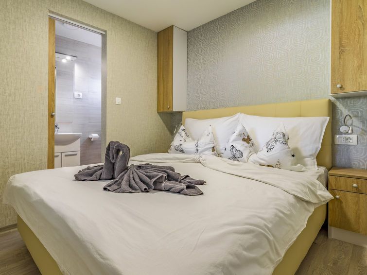 "Mobile home Superior", 3-room mobile home 40 m2. Living/dining room with 1 double sofabed (160 cm, length 200 cm), satellite TV (flat screen), air conditioning. Exit to the terrace. 2 rooms, each room with 1 french bed (160 cm, length 200 cm), shower/WC. Open kitchen (dishwasher, 4 ceramic glass hob hotplates, microwave, freezer, electric coffee machine).