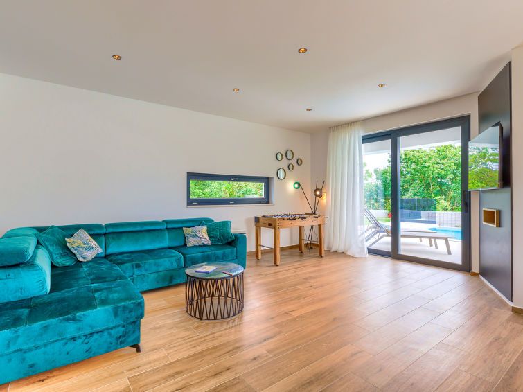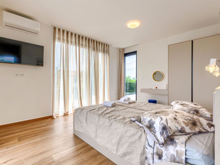4-room villa 160 m2 on 2 levels. Living/dining room with satellite TV (flat screen), air conditioning. Exit to the swimming pool. 1 room with 1 french bed (160 cm, length 200 cm), shower/WC and satellite TV (flat screen), air conditioning. Exit to the garden. Open kitchen (oven, dishwasher, 4 ceramic glass hob hotplates, microwave, freezer, electric coffee machine).