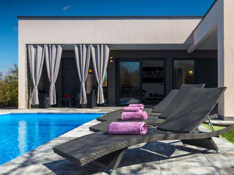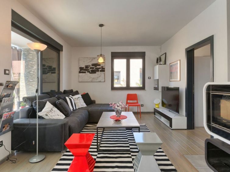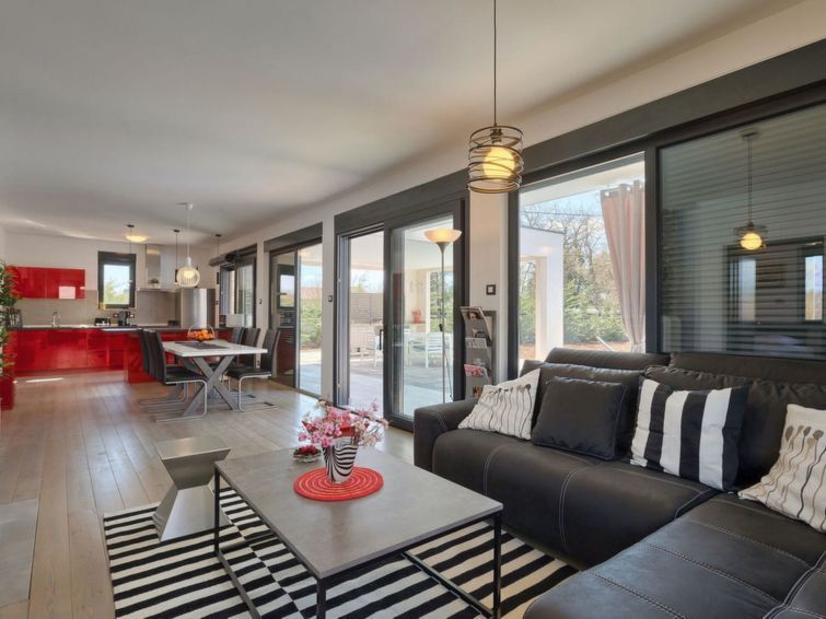 3-room house 90 m2. Cosy furnishings: living/dining room with 1 sofabed (150 cm, length 200 cm), satellite TV (flat screen). Exit to the terrace, to the swimming pool. 1 room with 1 french bed (160 cm, length 200 cm), shower/WC. 1 room with 2 beds (90 cm, length 200 cm). Open kitchen (oven, dishwasher, 4 ceramic glass hob hotplates, toaster, kettle, microwave, freezer, electric coffee machine).