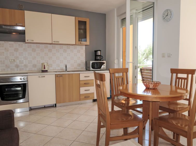 "Magnolia", 2-room apartment 40 m2, on the ground floor. Living/dining room with 1 double sofabed (150 cm, length 200 cm), satellite TV and air conditioning. Exit to the terrace. 1 room with 1 french bed (180 cm, length 200 cm). Open kitchen (oven, 4 ceramic glass hob hotplates, toaster, kettle, microwave, electric coffee machine).