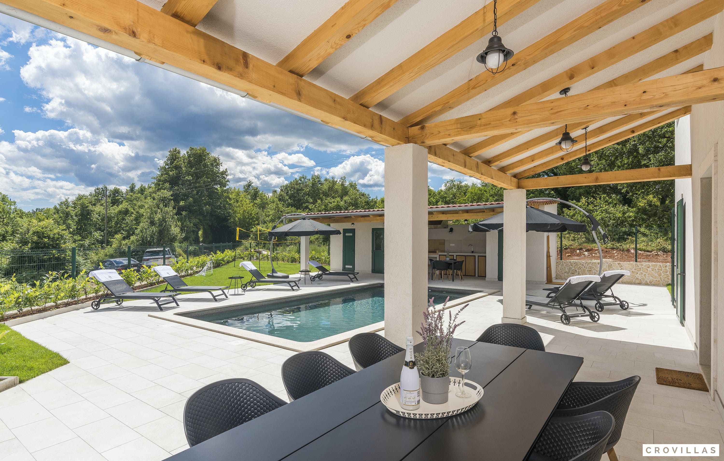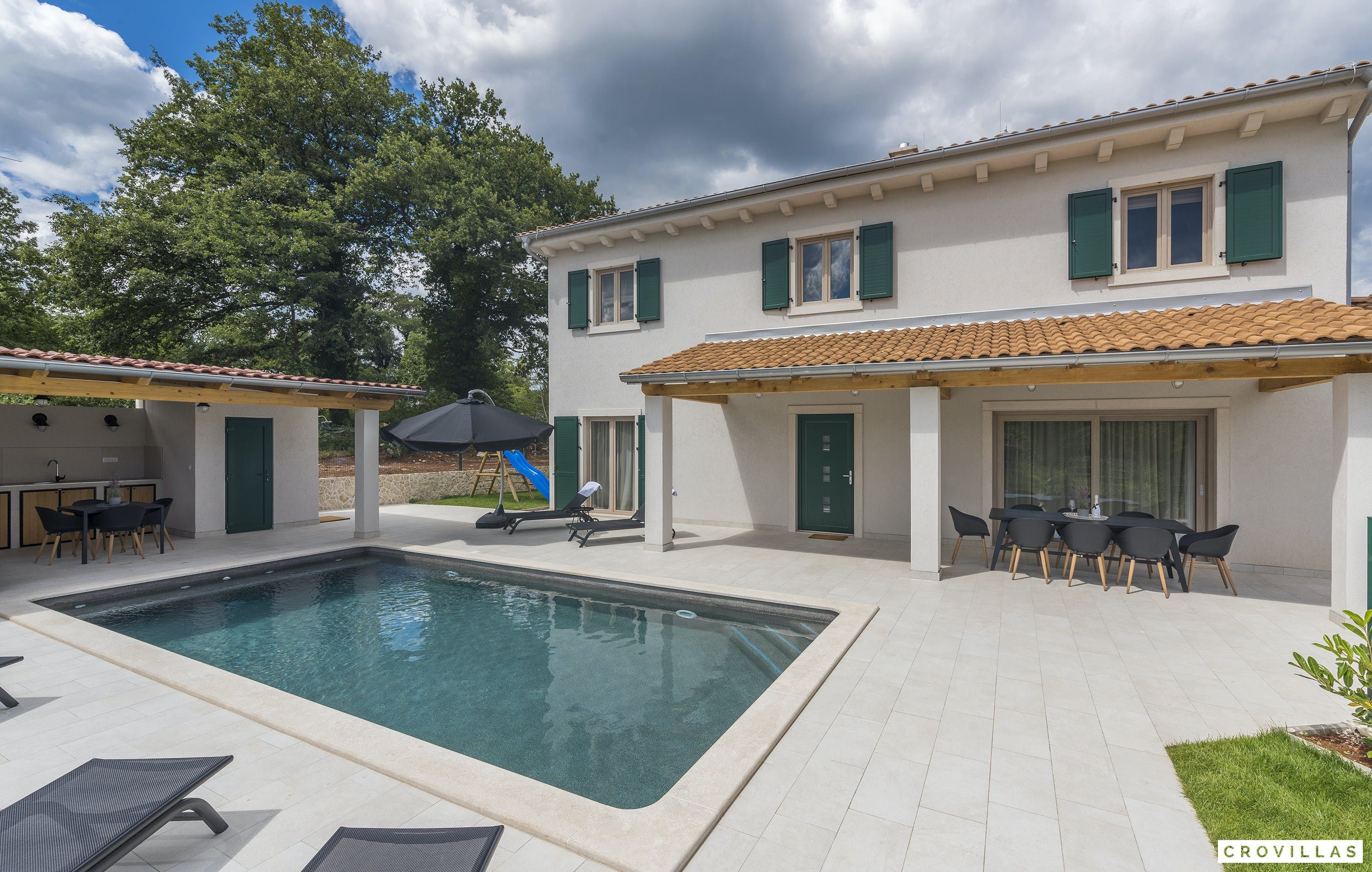 This charming villa in the picturesque village of Rojnici offers privacy and luxury for friends, couples or families. The fully-equipped villa features a beautiful terrace with a 32 m² saltwater pool that can be heated on request, an outdoor kitchen with grill, and comfortable loungers. Guests can enjoy a steam sauna, outdoor toilet, and shower. The open living area has direct access to the covered terrace and features a comfortable sofa bed for two people, TV, and fireplace. The fully-equipped kitchen is half-open and separated from the living zone by a pretty dining table. The three bedrooms each have an en-suite bathroom and are spread across the lower and upper floors. Underfloor heating and air conditioning guarantee perfect comfort temperatures all year round. The villa is located in central Istria, within easy reach of beautiful villages such as Barban, Svetvinčenat or Žminj, and just 30 km from Pula airport. Don't miss out on a day at the beautiful beaches of the Istrian peninsula.