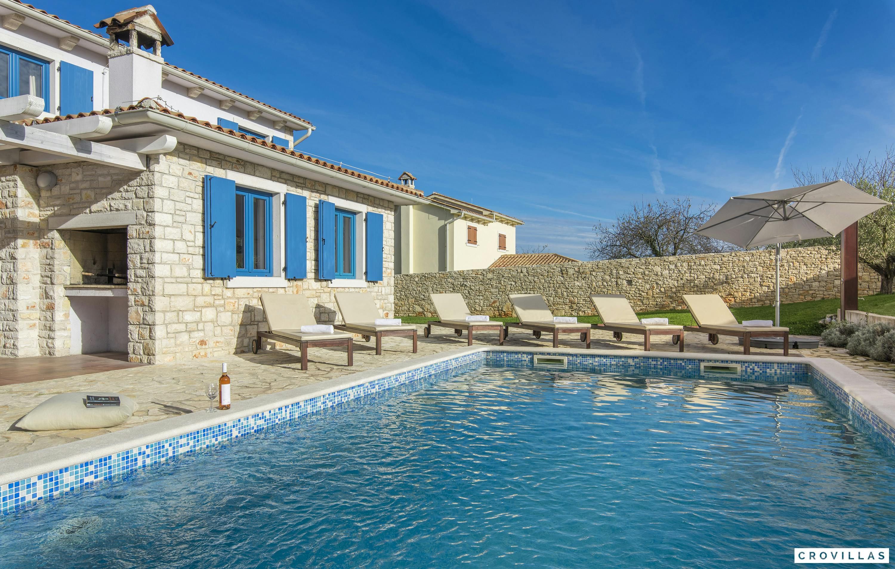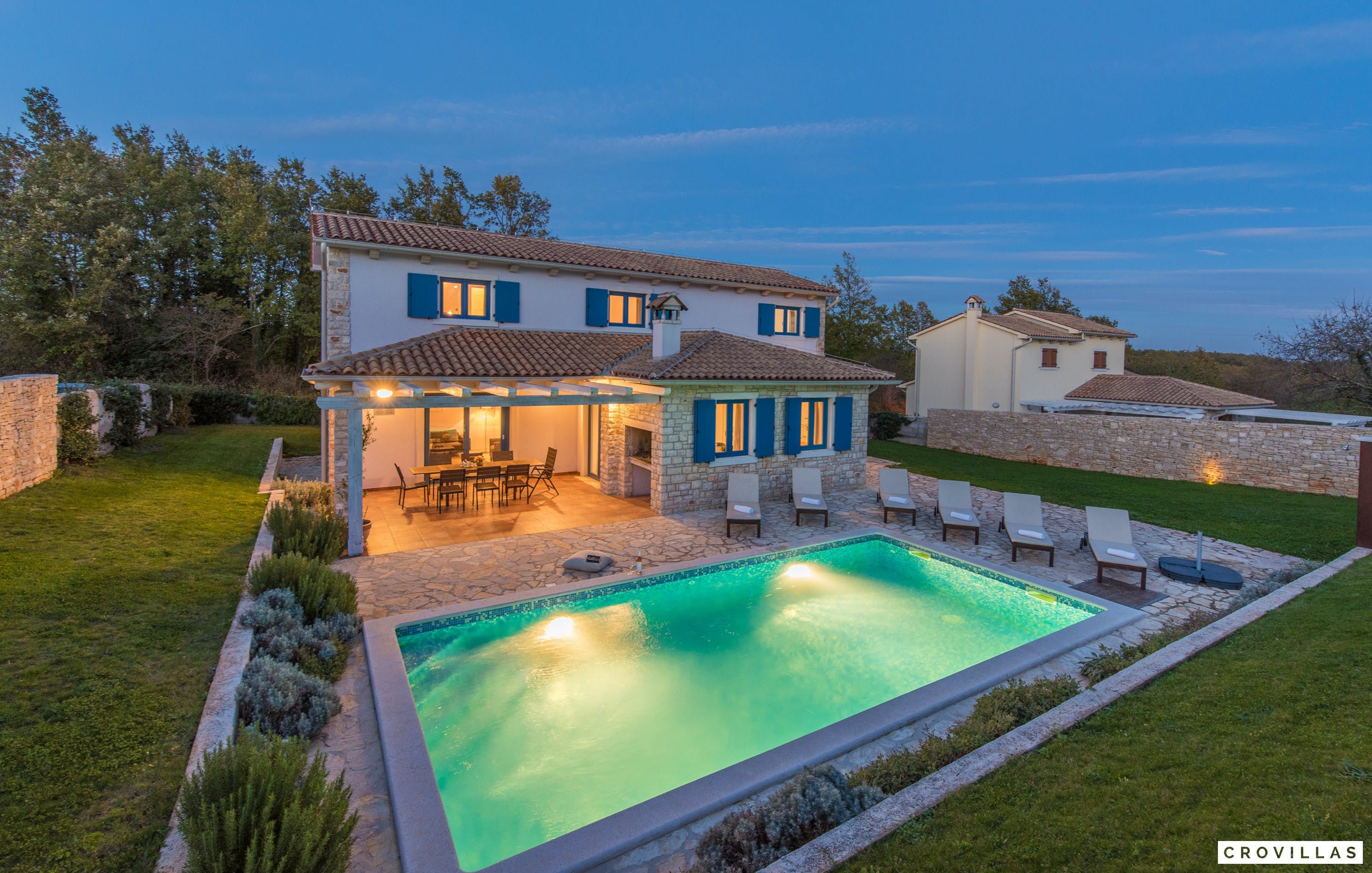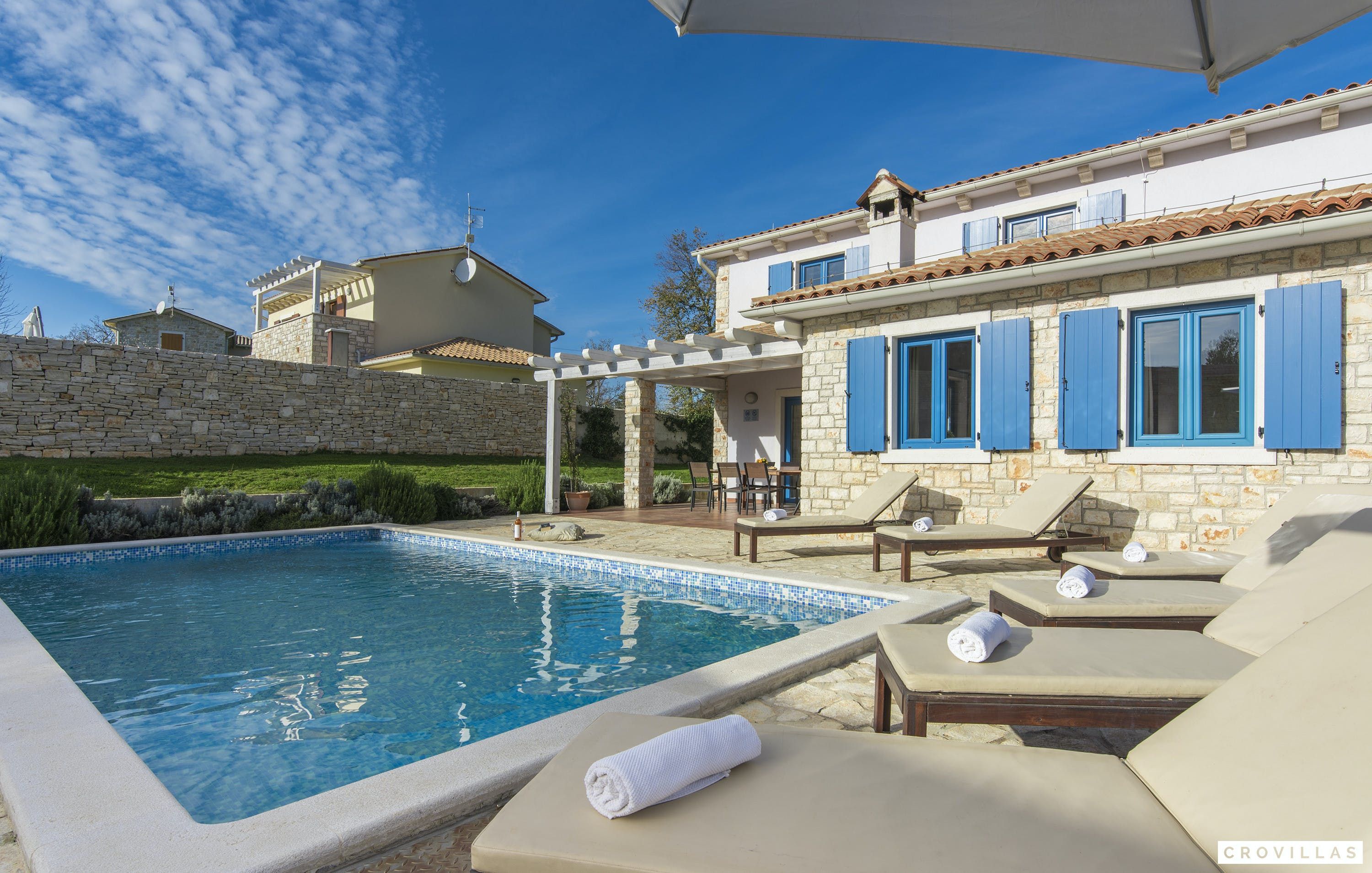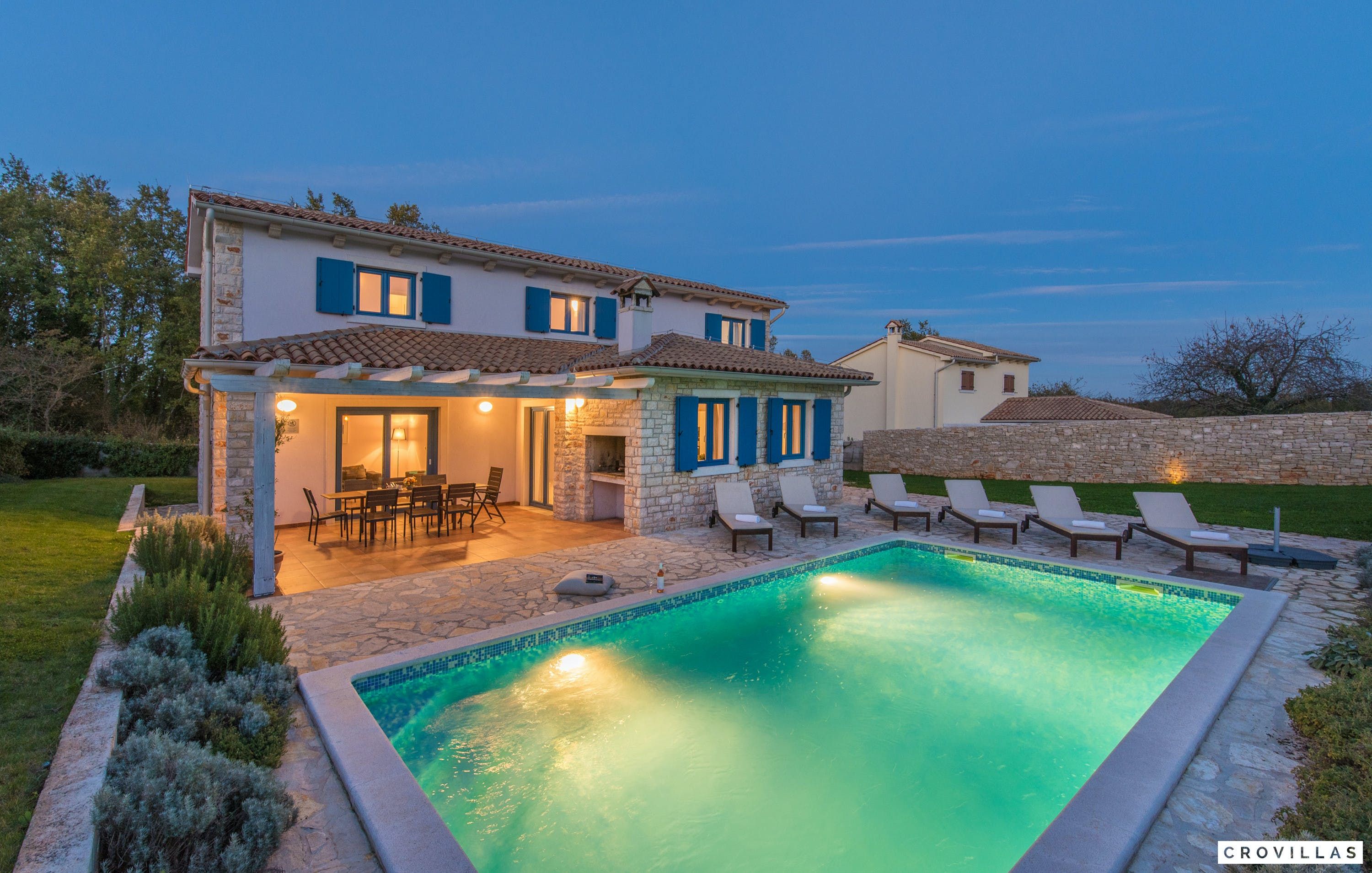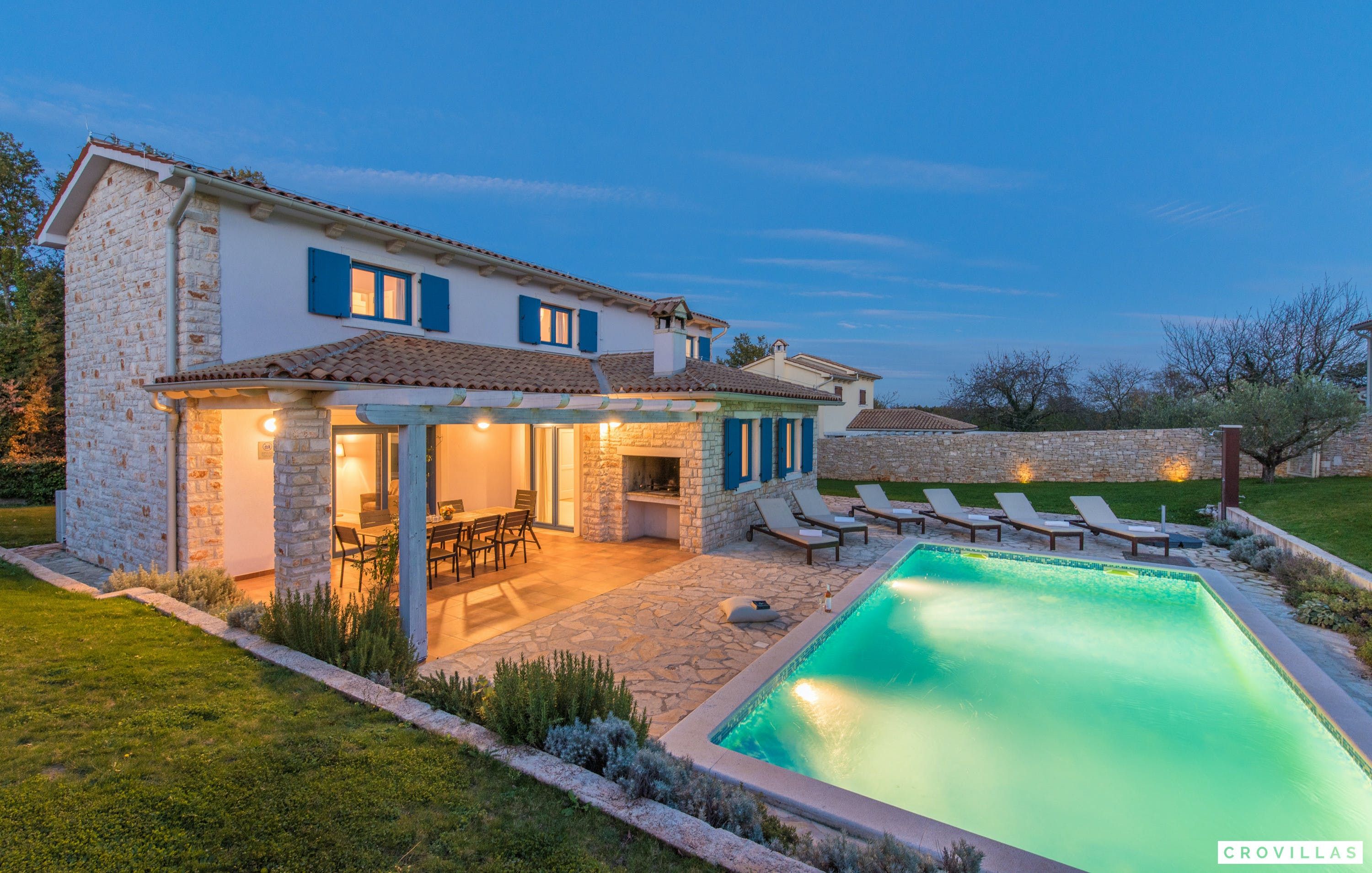 This is a beautiful and affordable vacation home made of natural building materials such as stone and wood, while still meeting modern standards of luxury and comfort. Visitors can enjoy a private pool with a depth of 1.40m, Finnish sauna, and outdoor shower. The villa has four bedrooms with en-suite bathrooms, LCD TVs, ample storage space, and air conditioning. The common living and dining area features large-format cream tiles, light-colored walls, cosy sofa area, and contemporary art on the walls. The white country kitchen in the open area is fully equipped with modern appliances. There is also a covered terrace at the house with a brick barbecue for BBQ evenings or as a fireplace. Visitors can park their rental cars on the property. The villa is located only 30 km from Pula airport, but visitors should have a rental car to explore the surrounding areas of Istria, which offer enchanting nature, rich natural sights, spectacular views, historical places to visit such as Barban, Pazin, Svetvinčenat or Motovun, theatre or jazz festivals against a historical backdrop and authentic village festivals.