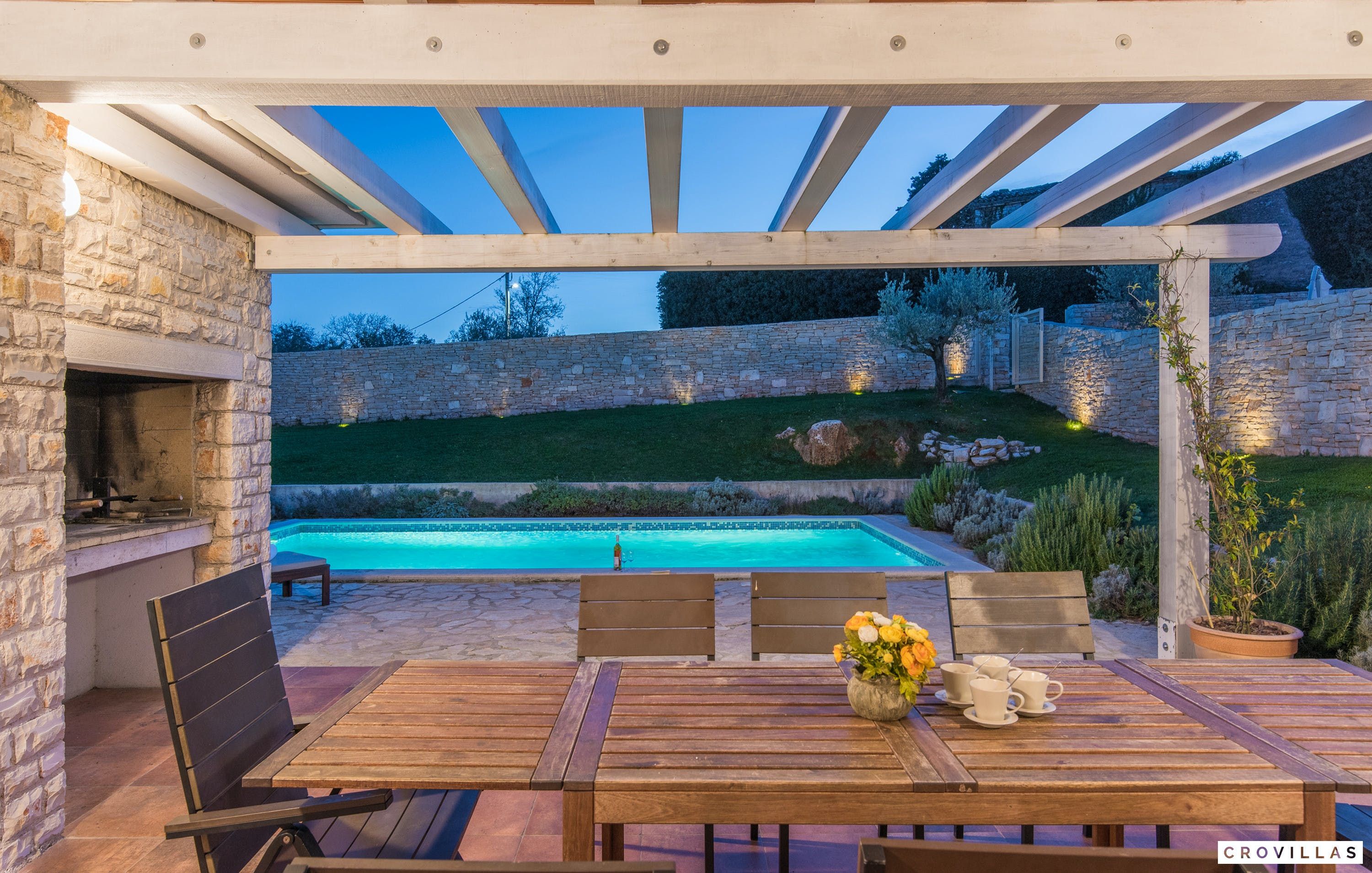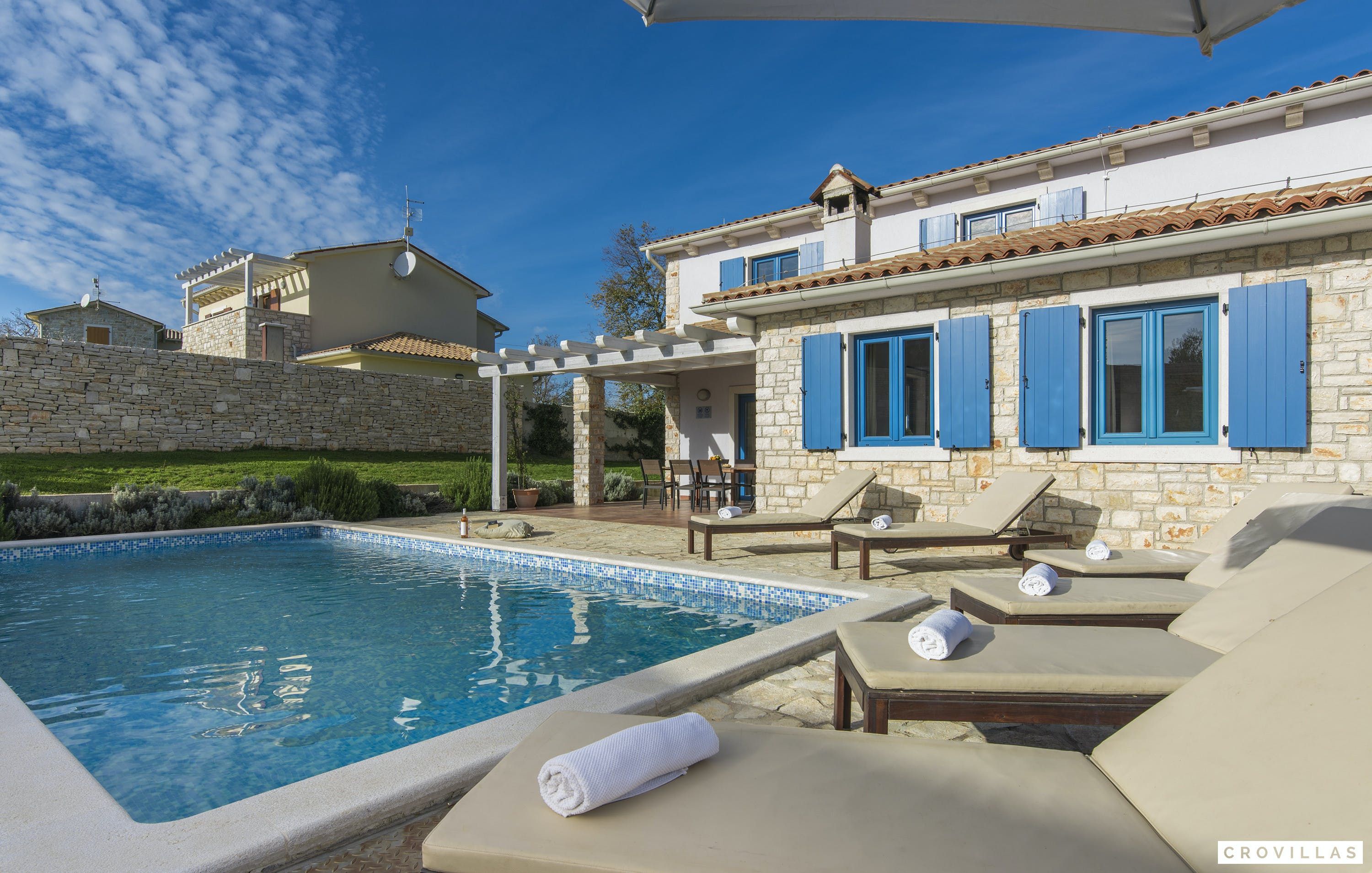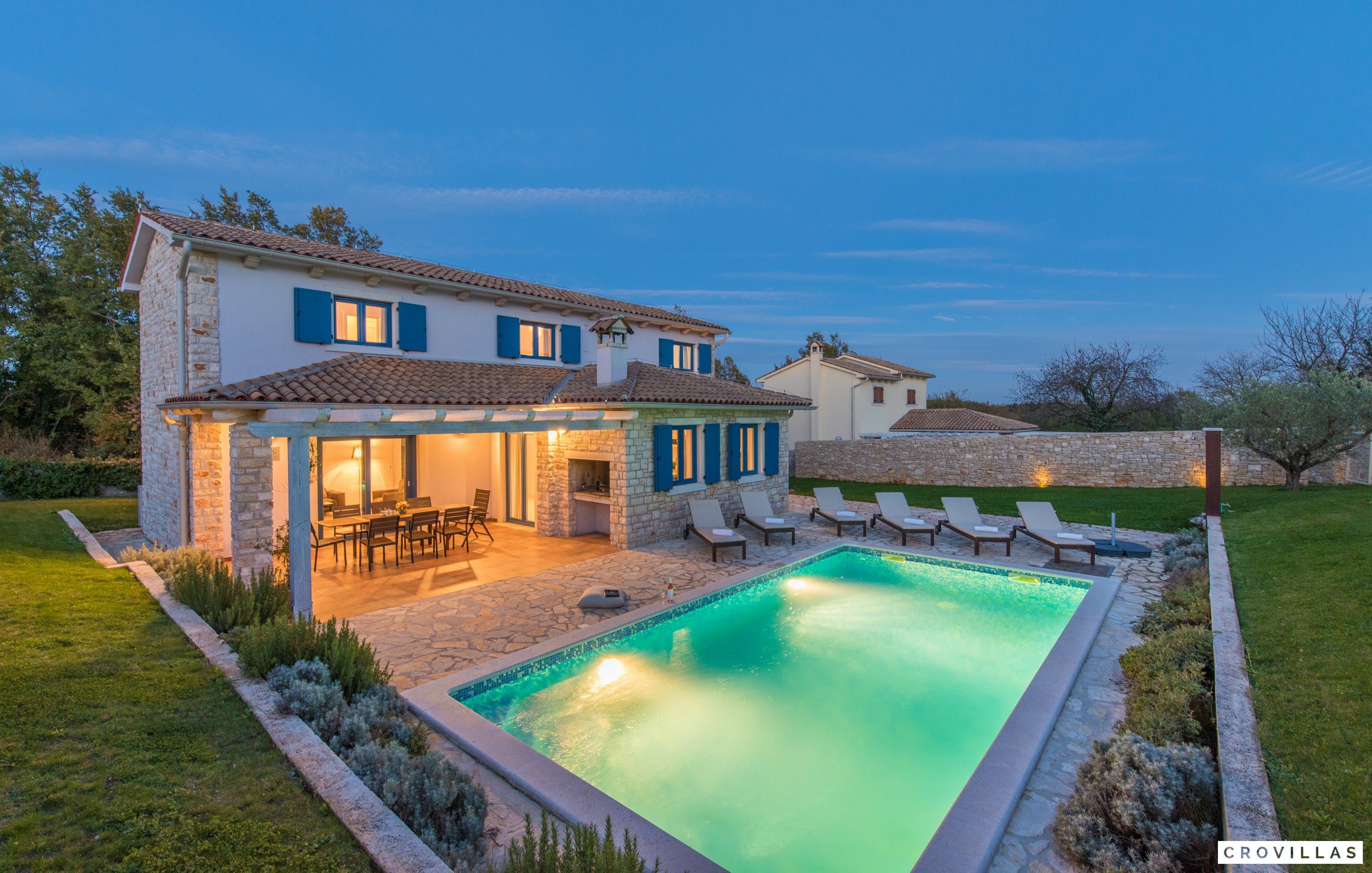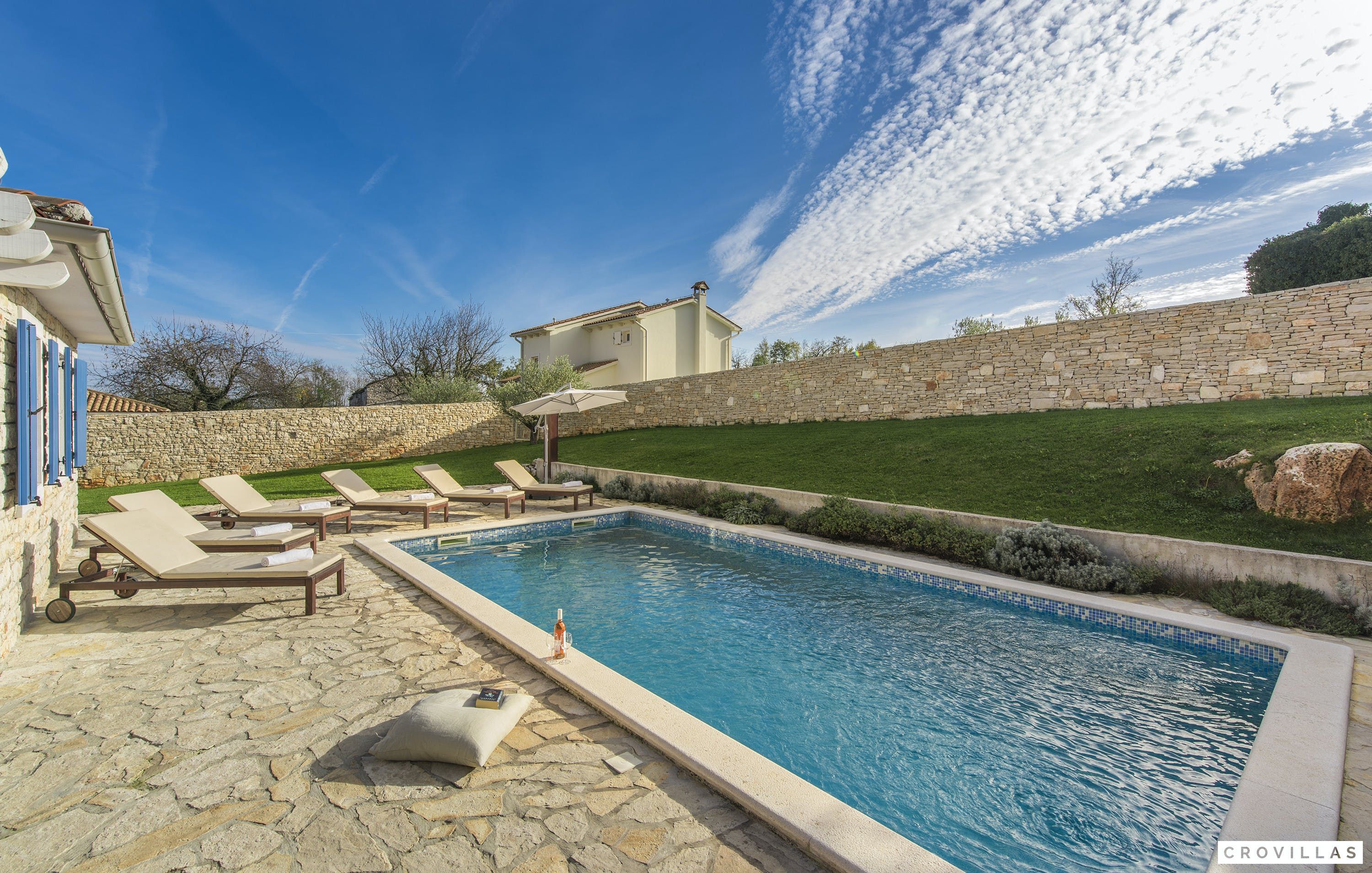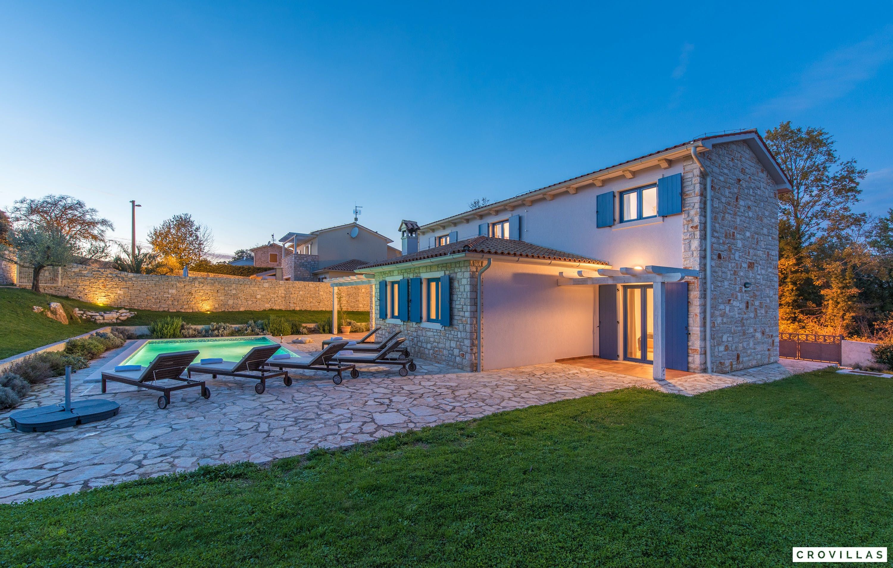 This is a beautiful and affordable vacation home made of natural building materials such as stone and wood, while still meeting modern standards of luxury and comfort. Visitors can enjoy a private pool with a depth of 1.40m, Finnish sauna, and outdoor shower. The villa has four bedrooms with en-suite bathrooms, LCD TVs, ample storage space, and air conditioning. The common living and dining area features large-format cream tiles, light-colored walls, cosy sofa area, and contemporary art on the walls. The white country kitchen in the open area is fully equipped with modern appliances. There is also a covered terrace at the house with a brick barbecue for BBQ evenings or as a fireplace. Visitors can park their rental cars on the property. The villa is located only 30 km from Pula airport, but visitors should have a rental car to explore the surrounding areas of Istria, which offer enchanting nature, rich natural sights, spectacular views, historical places to visit such as Barban, Pazin, Svetvinčenat or Motovun, theatre or jazz festivals against a historical backdrop and authentic village festivals.