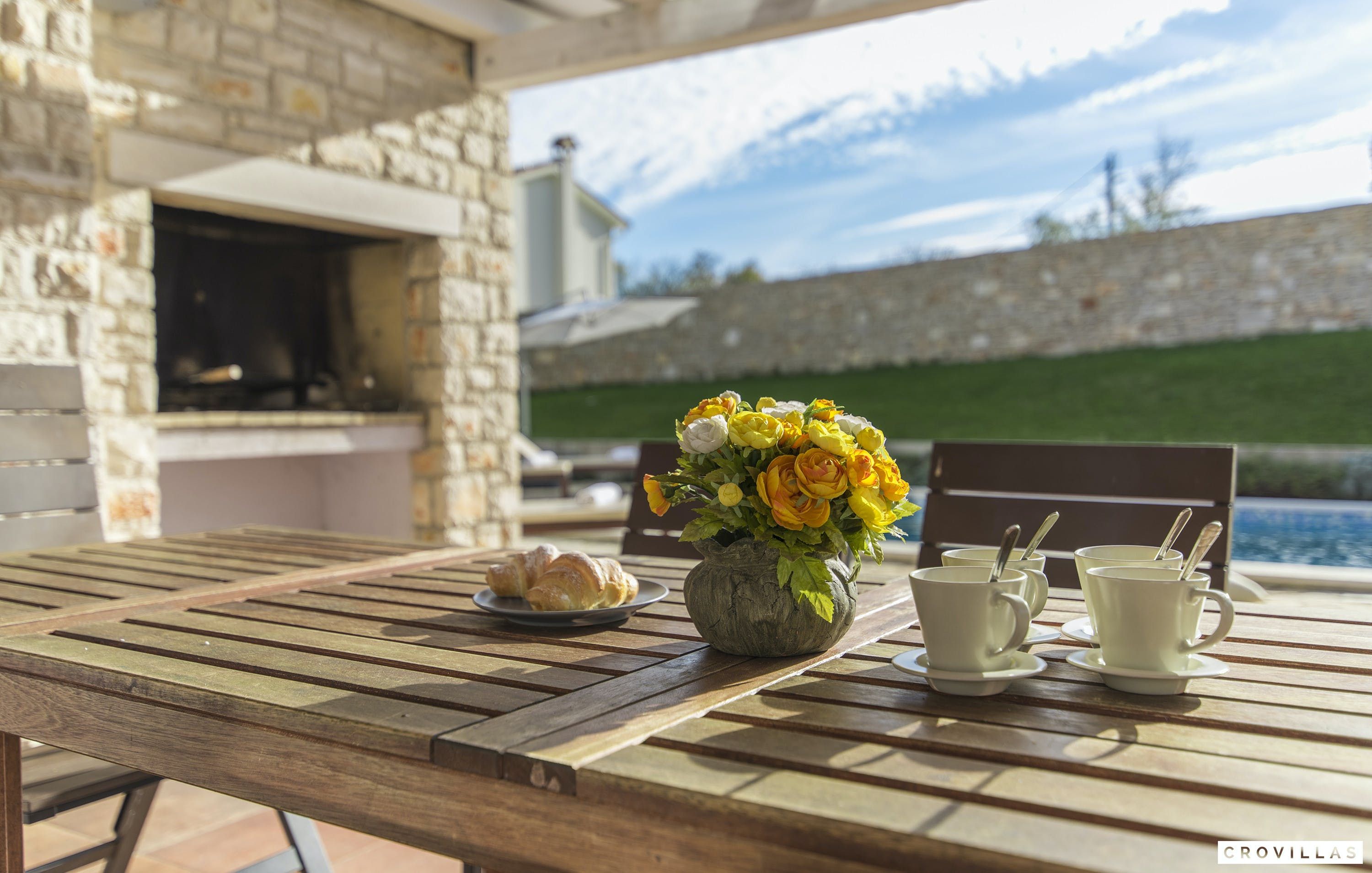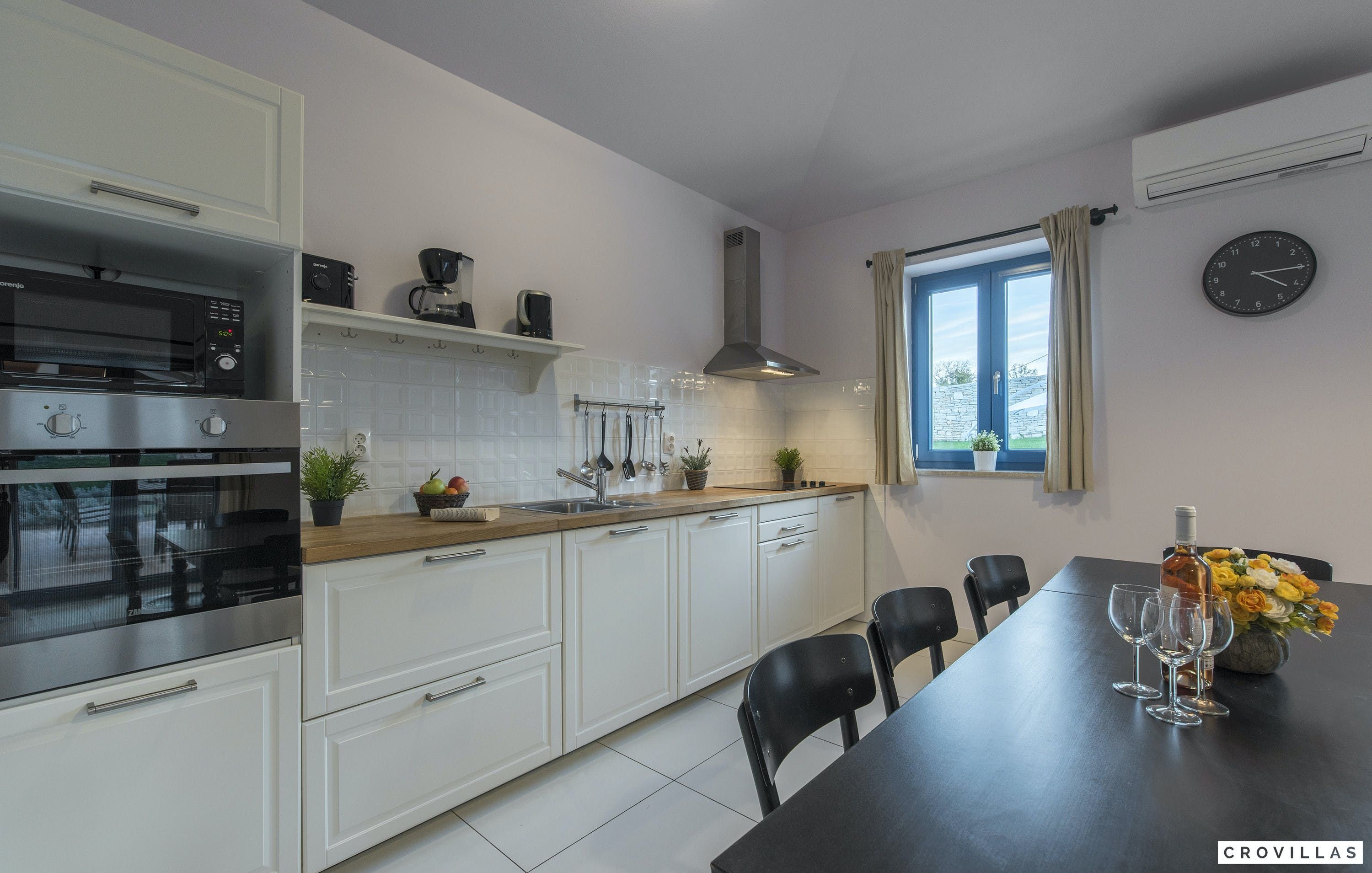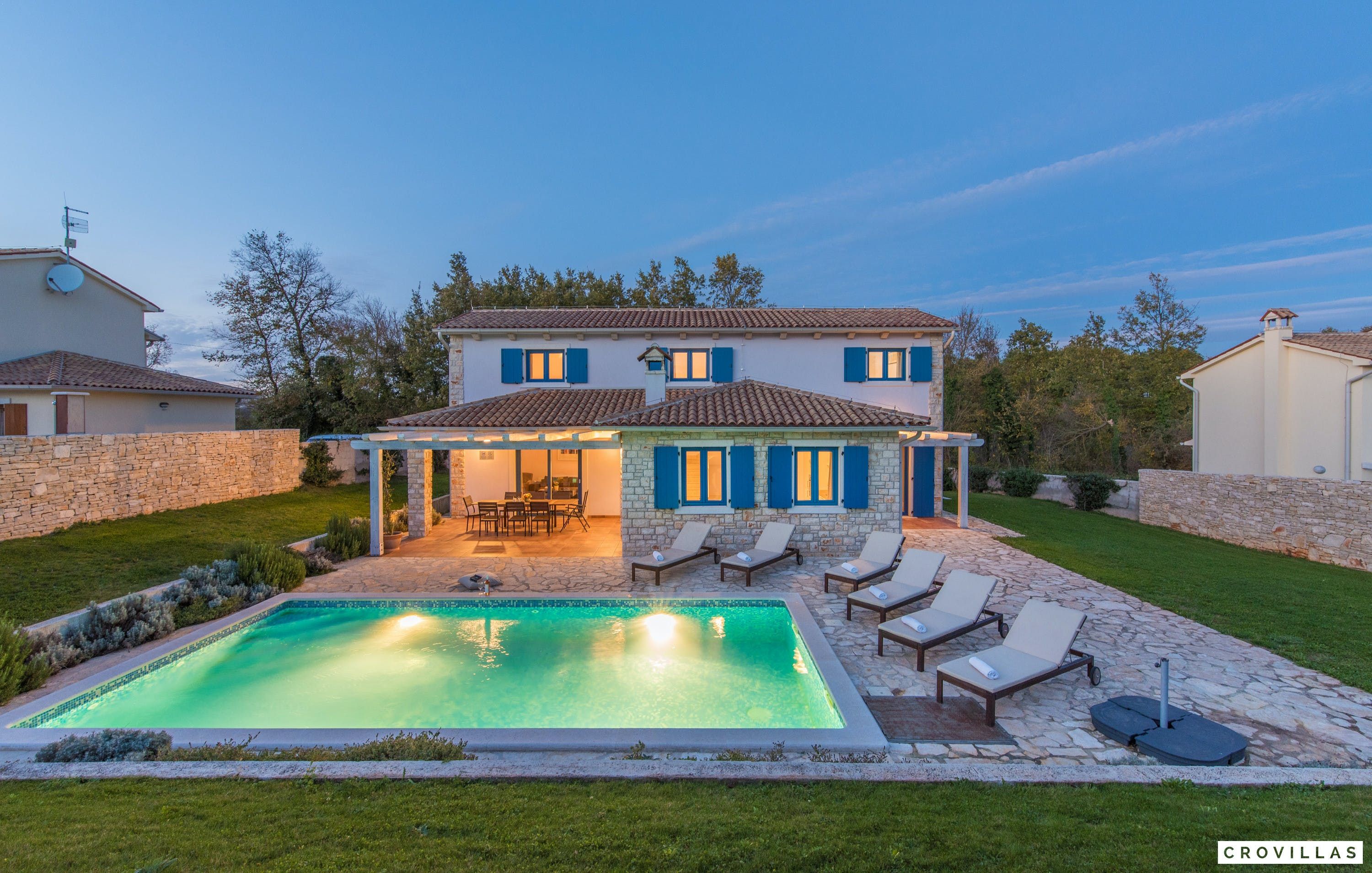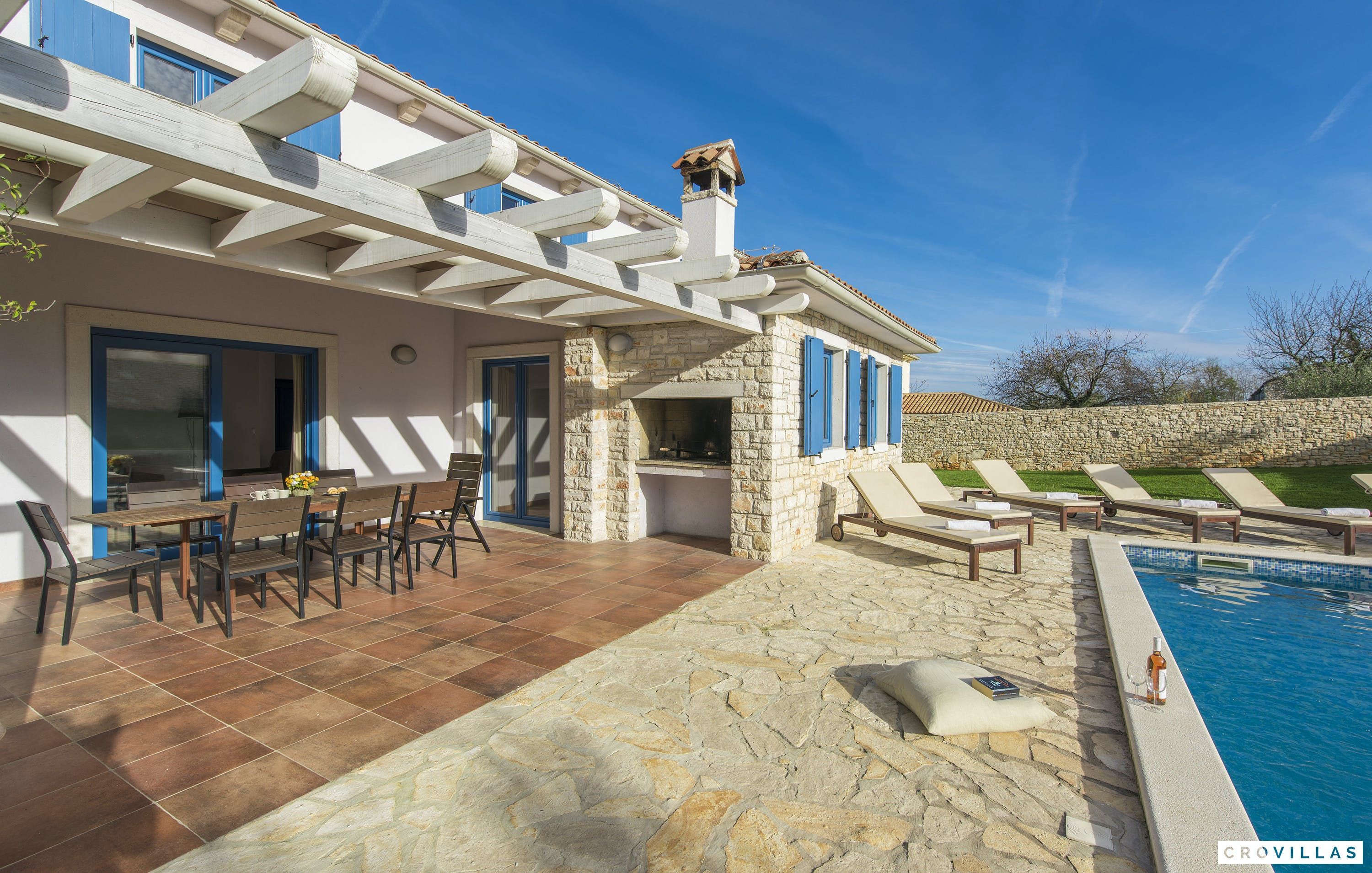 This is a beautiful and affordable vacation home made of natural building materials such as stone and wood, while still meeting modern standards of luxury and comfort. Visitors can enjoy a private pool with a depth of 1.40m, Finnish sauna, and outdoor shower. The villa has four bedrooms with en-suite bathrooms, LCD TVs, ample storage space, and air conditioning. The common living and dining area features large-format cream tiles, light-colored walls, cosy sofa area, and contemporary art on the walls. The white country kitchen in the open area is fully equipped with modern appliances. There is also a covered terrace at the house with a brick barbecue for BBQ evenings or as a fireplace. Visitors can park their rental cars on the property. The villa is located only 30 km from Pula airport, but visitors should have a rental car to explore the surrounding areas of Istria, which offer enchanting nature, rich natural sights, spectacular views, historical places to visit such as Barban, Pazin, Svetvinčenat or Motovun, theatre or jazz festivals against a historical backdrop and authentic village festivals.