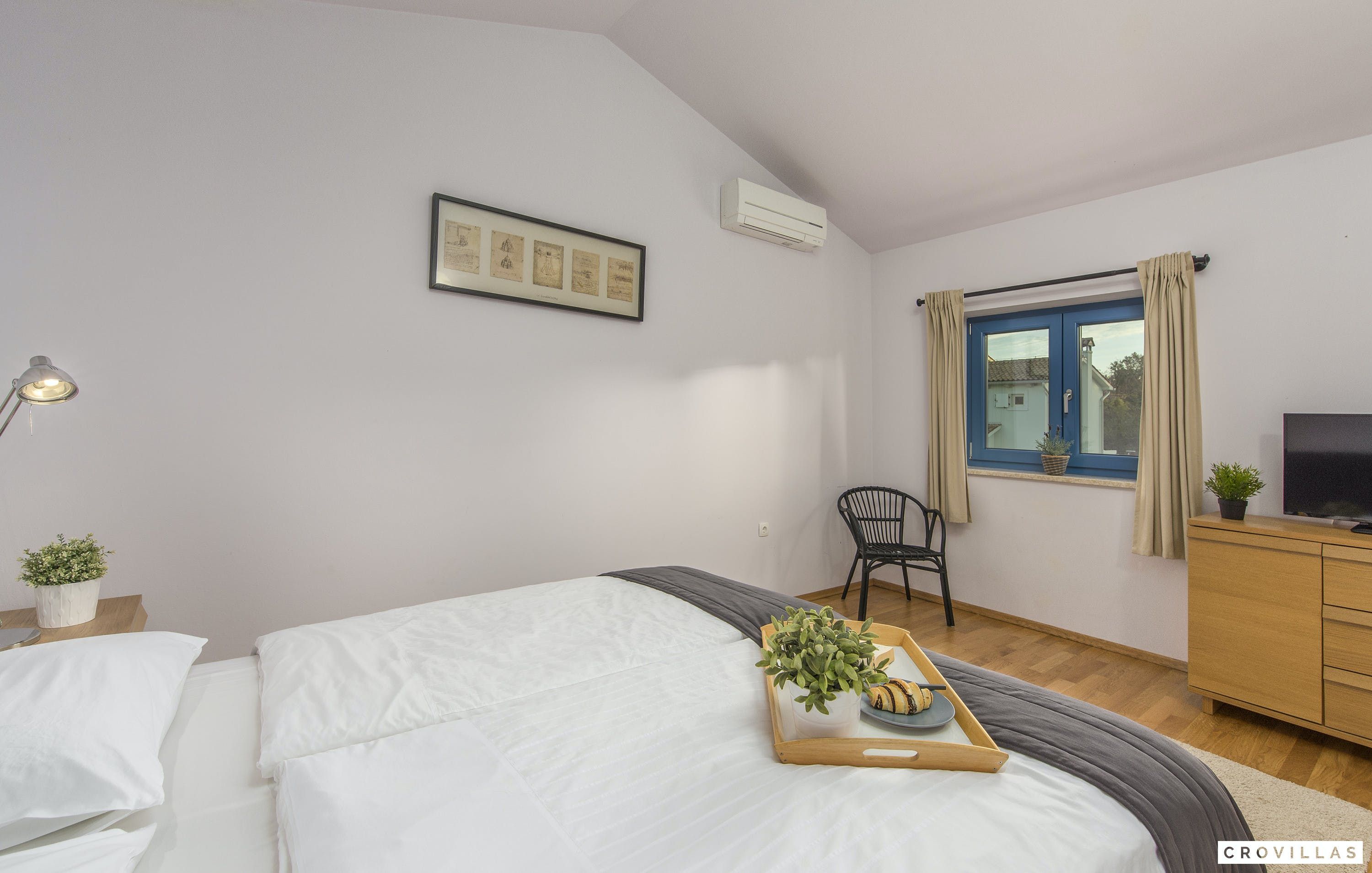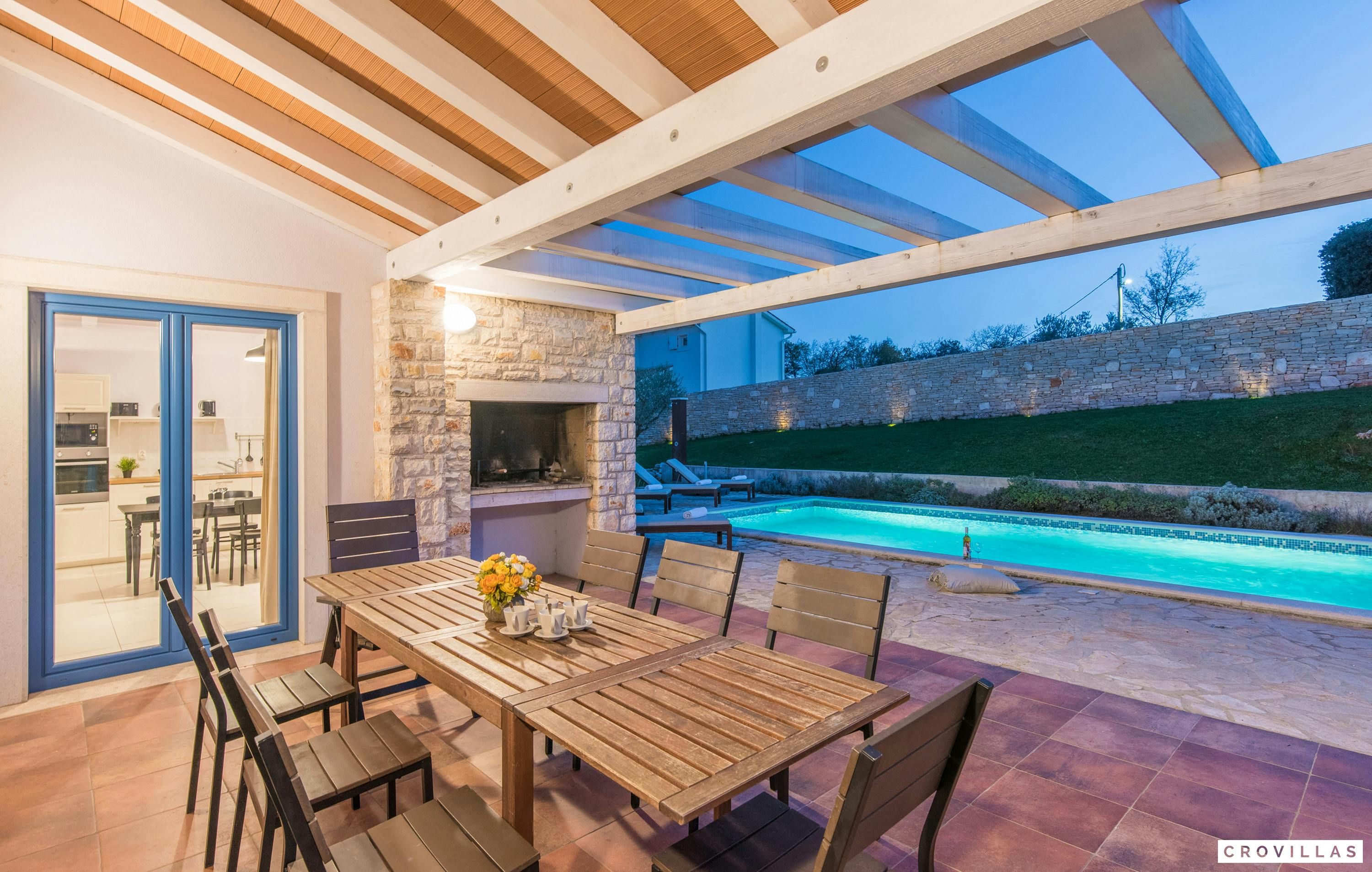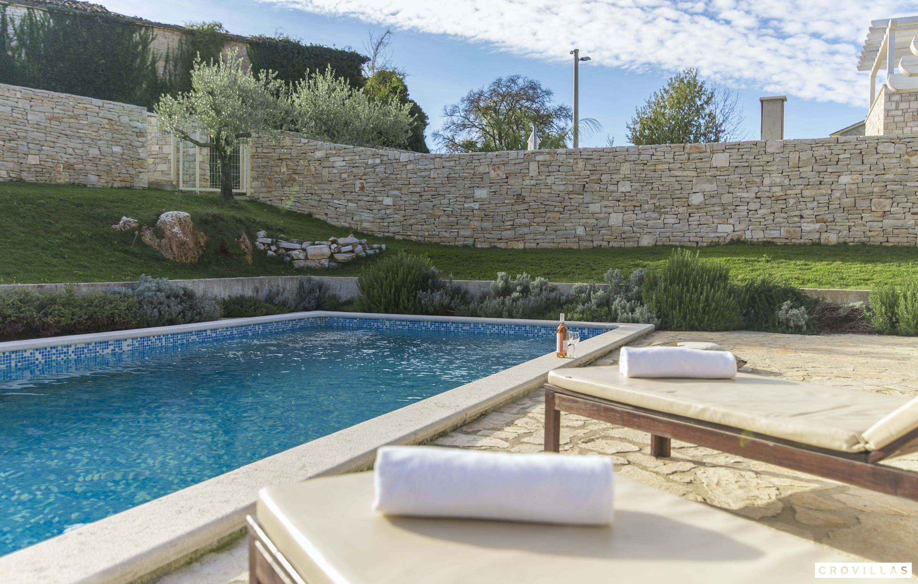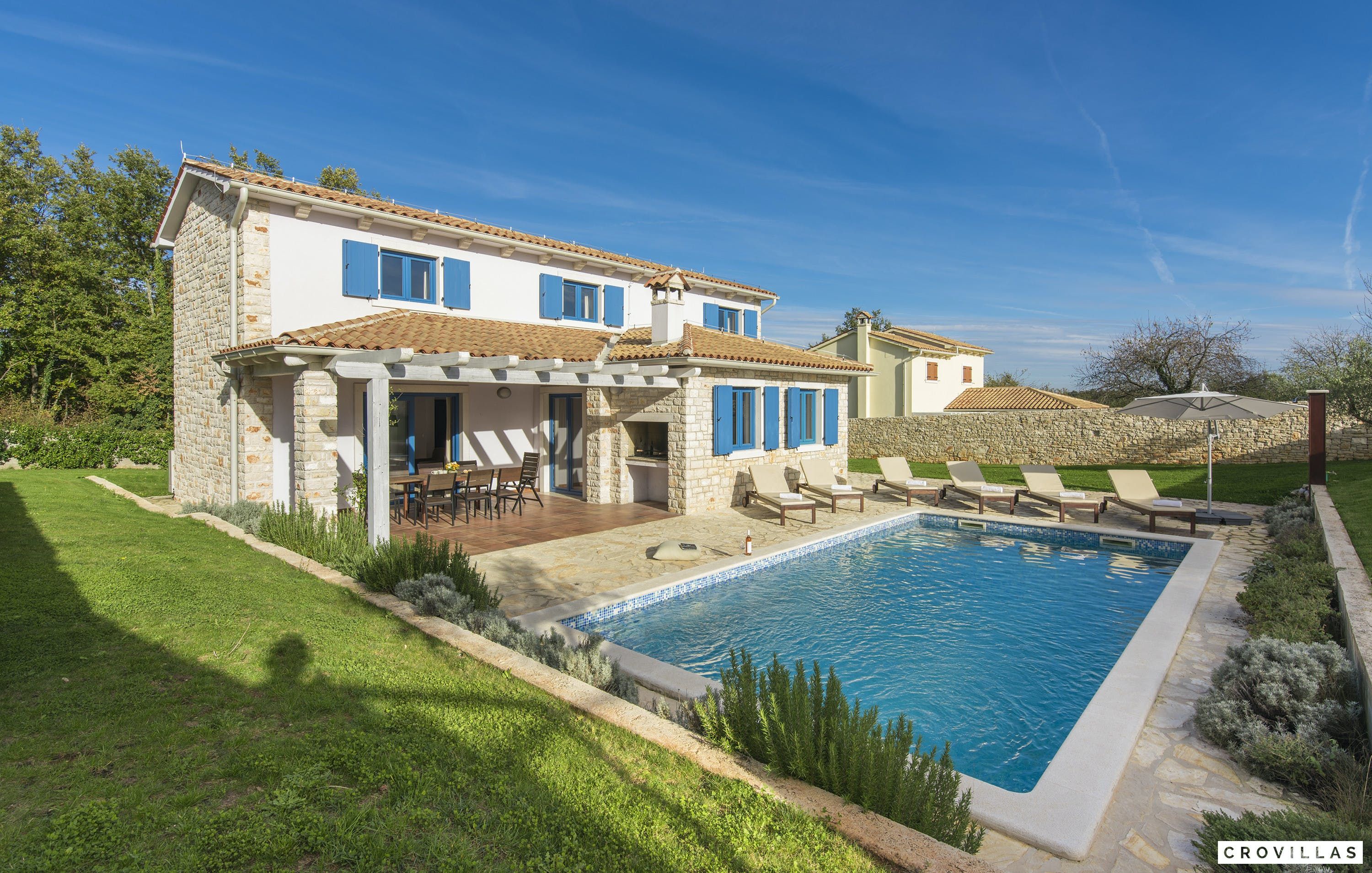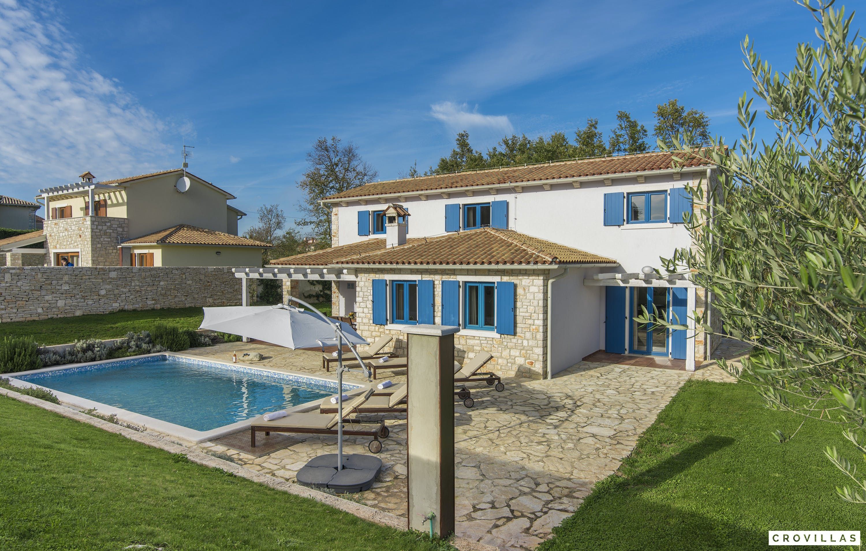 This is a beautiful and affordable vacation home made of natural building materials such as stone and wood, while still meeting modern standards of luxury and comfort. Visitors can enjoy a private pool with a depth of 1.40m, Finnish sauna, and outdoor shower. The villa has four bedrooms with en-suite bathrooms, LCD TVs, ample storage space, and air conditioning. The common living and dining area features large-format cream tiles, light-colored walls, cosy sofa area, and contemporary art on the walls. The white country kitchen in the open area is fully equipped with modern appliances. There is also a covered terrace at the house with a brick barbecue for BBQ evenings or as a fireplace. Visitors can park their rental cars on the property. The villa is located only 30 km from Pula airport, but visitors should have a rental car to explore the surrounding areas of Istria, which offer enchanting nature, rich natural sights, spectacular views, historical places to visit such as Barban, Pazin, Svetvinčenat or Motovun, theatre or jazz festivals against a historical backdrop and authentic village festivals.