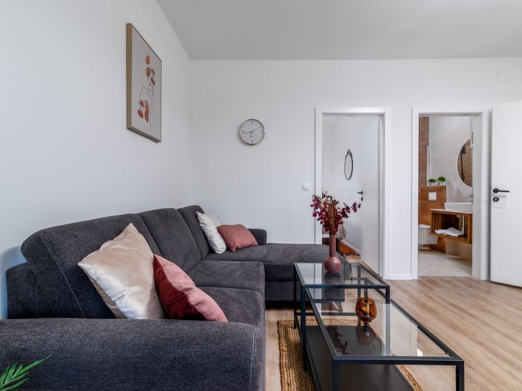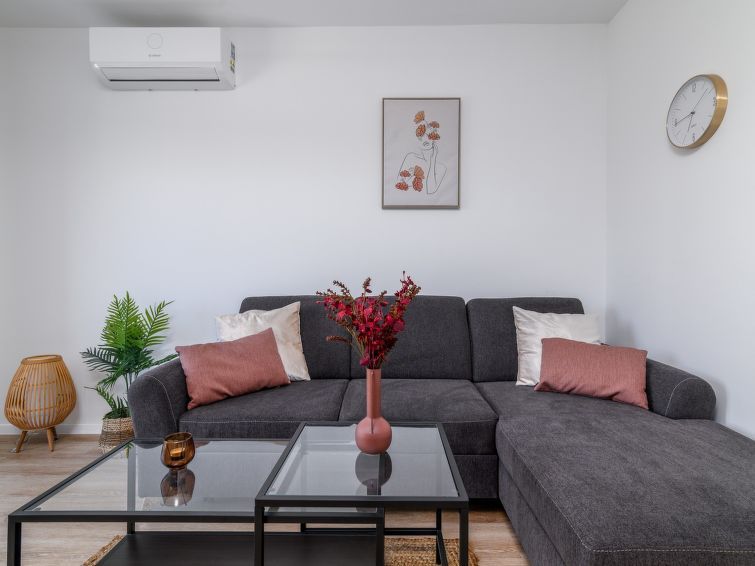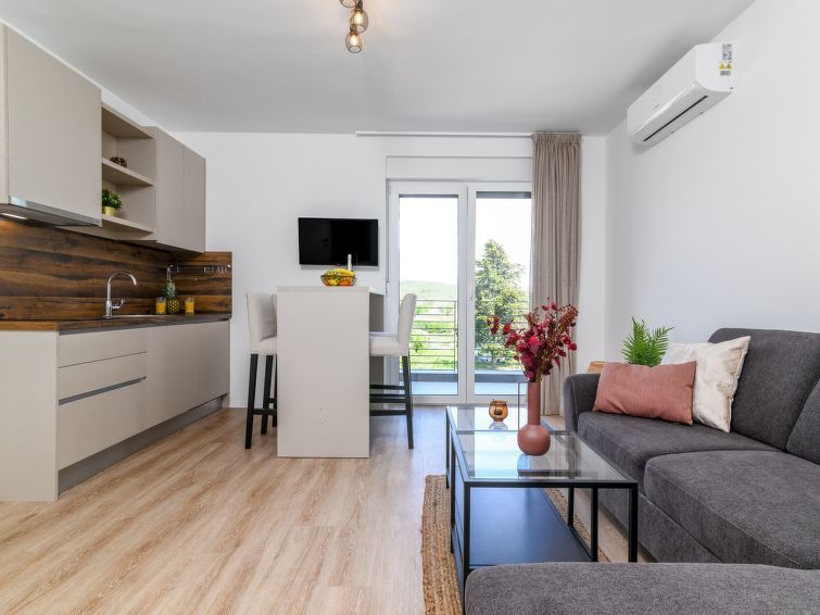 "Prinz", 2-room apartment 30 m2, on the upper floor. Simple and cosy furnishings: living/dining room 18 m2 with 1 double sofabed (160 cm, length 200 cm), satellite TV and air conditioning. Exit to the terrace. 1 room with 1 french bed (160 cm, length 200 cm). Small, open kitchen (2 ceramic glass hob hotplates, kettle, microwave).