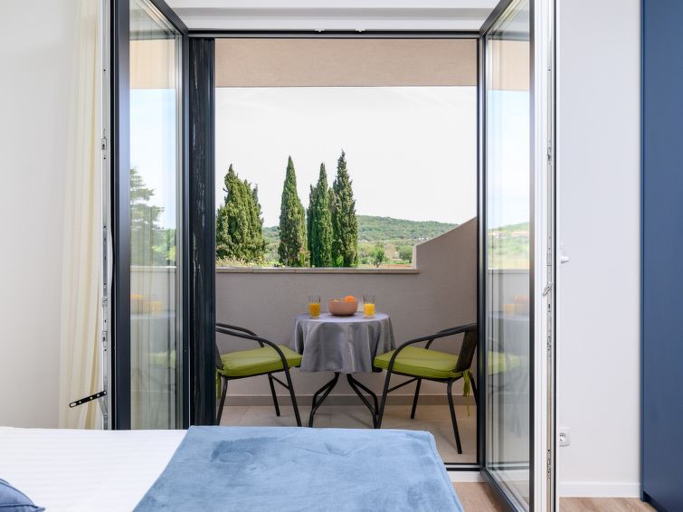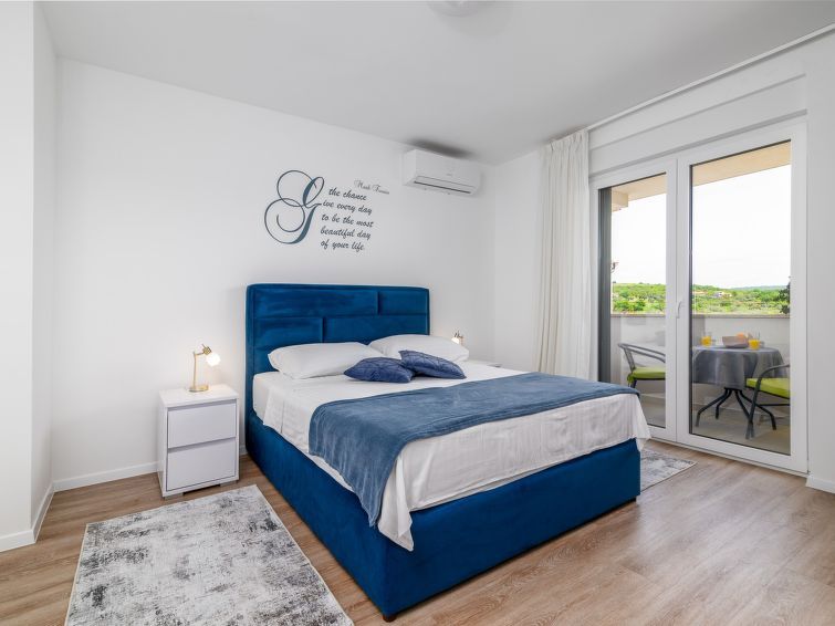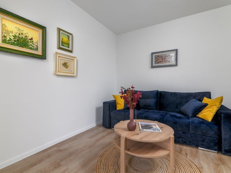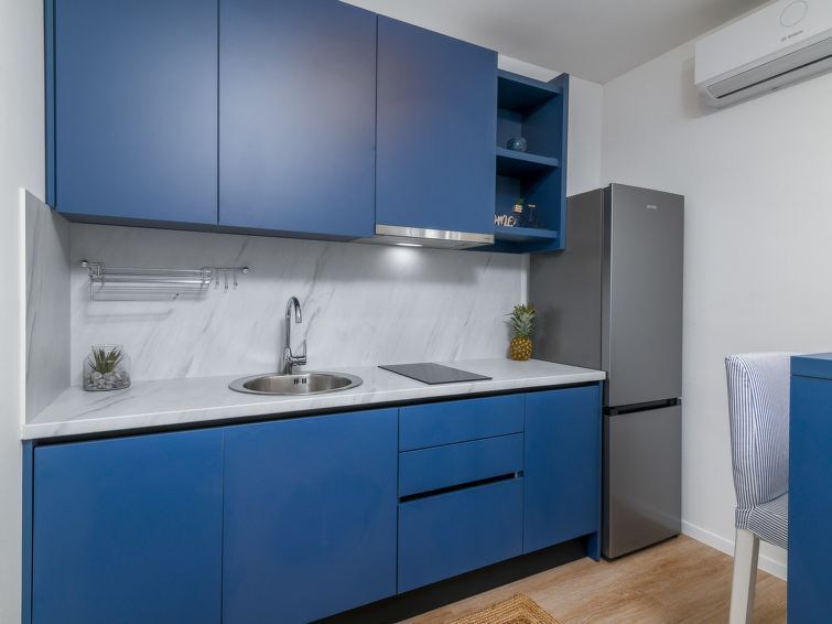 "Thalia", 2-room apartment 47 m2, on the upper floor. Simple and cosy furnishings: living/dining room 20 m2 with 1 double sofabed (160 cm, length 200 cm), satellite TV and air conditioning. 1 room with 1 french bed (160 cm, length 200 cm), air conditioning. Exit to the terrace. Small, open kitchen (2 ceramic glass hob hotplates, kettle, microwave).