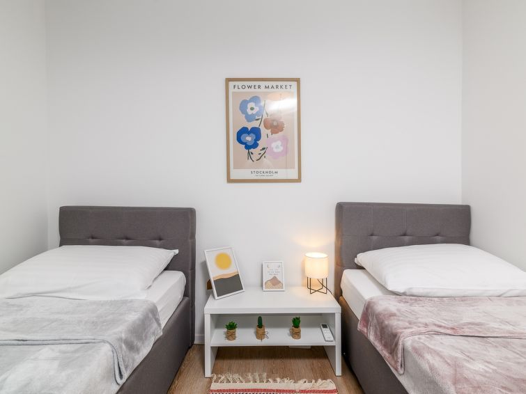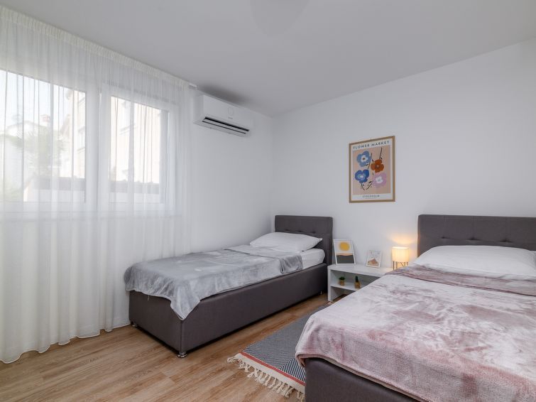 "Trieste", 3-room apartment 50 m2, on the ground floor. Simple and cosy furnishings: living/dining room 15 m2 with 1 double sofabed (140 cm, length 200 cm), satellite TV and air conditioning. Exit to the terrace. 1 room with 2 beds (90 cm, length 200 cm), air conditioning. 1 room with 1 french bed (160 cm, length 200 cm).