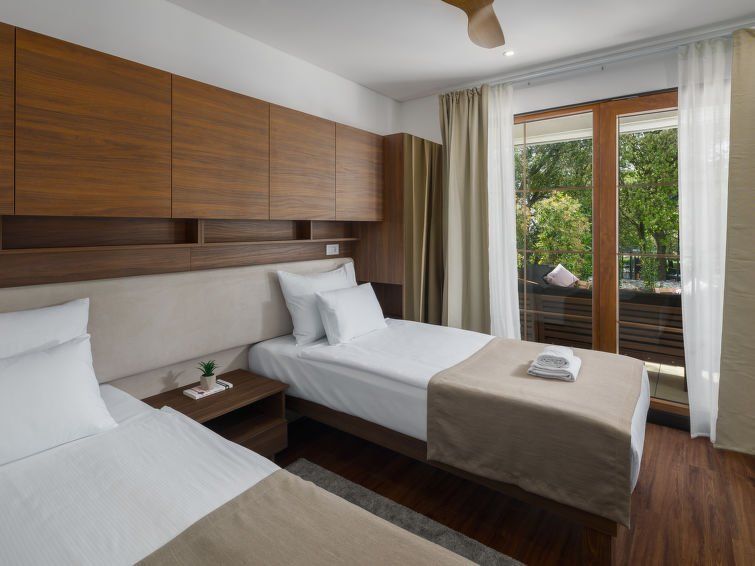 "Luxury Bay Villa with private hot tub", 3-room villa 67 m2. Beautiful and modern furnishings: living/dining room with 1 sofabed (88 cm, length 260 cm), satellite TV. Exit to the terrace. 1 room with 1 french bed (200 cm, length 220 cm), shower/WC. 1 room with 2 beds (100 cm, length 220 cm), shower/WC.