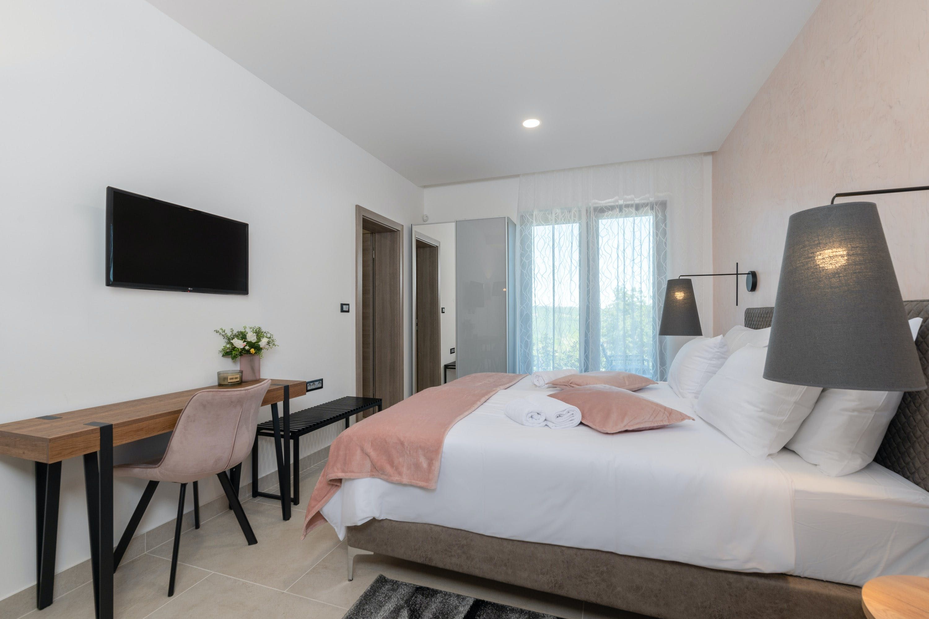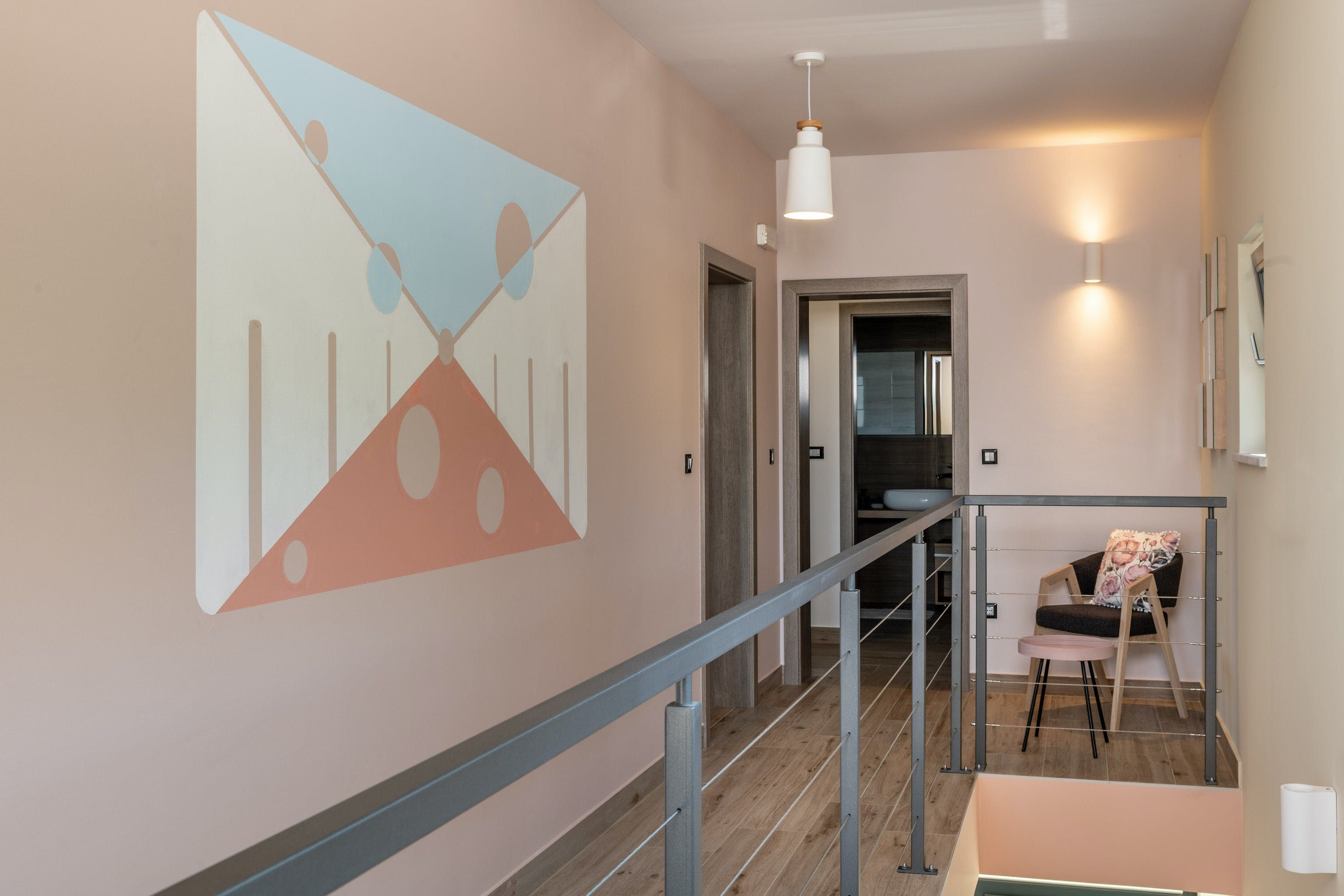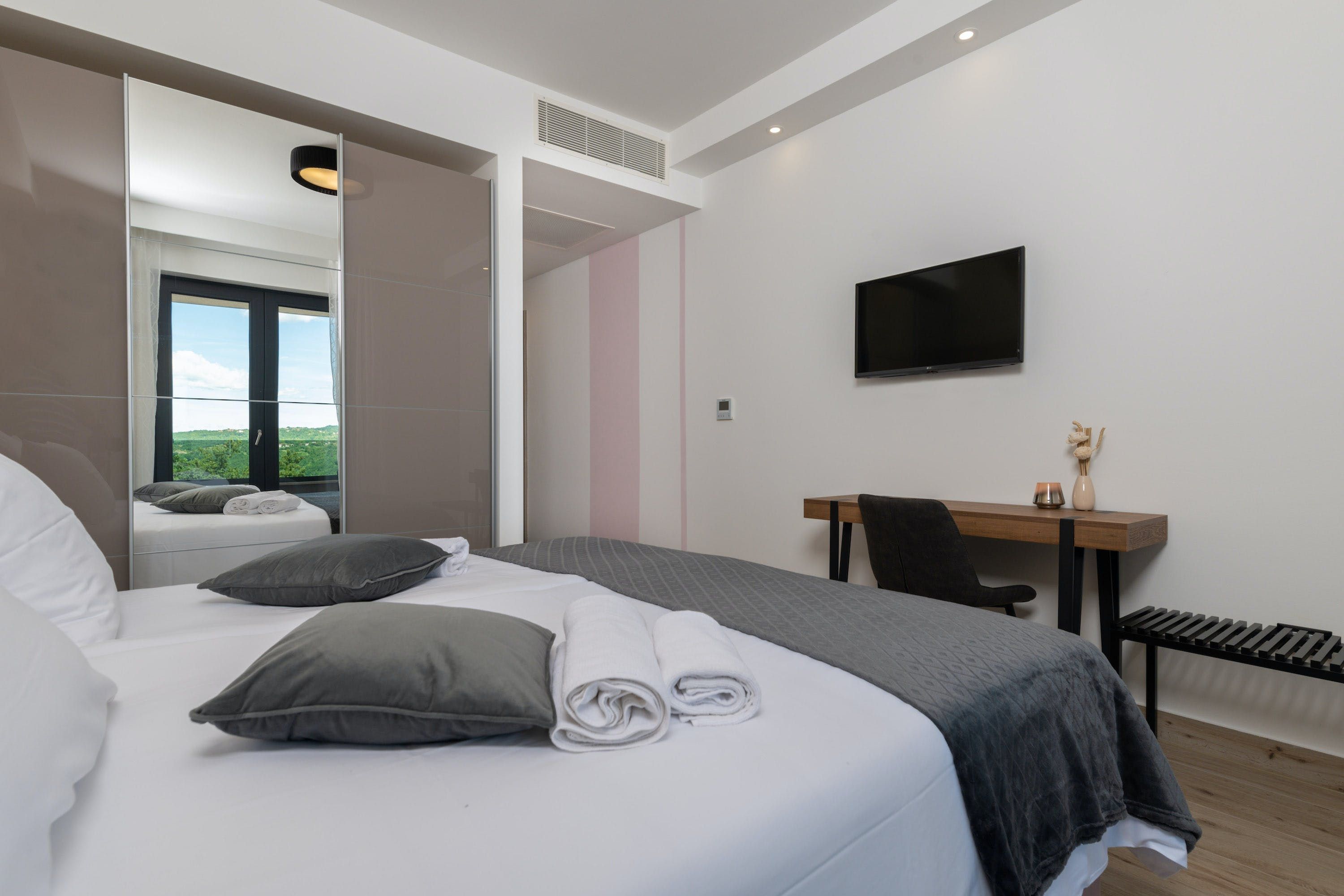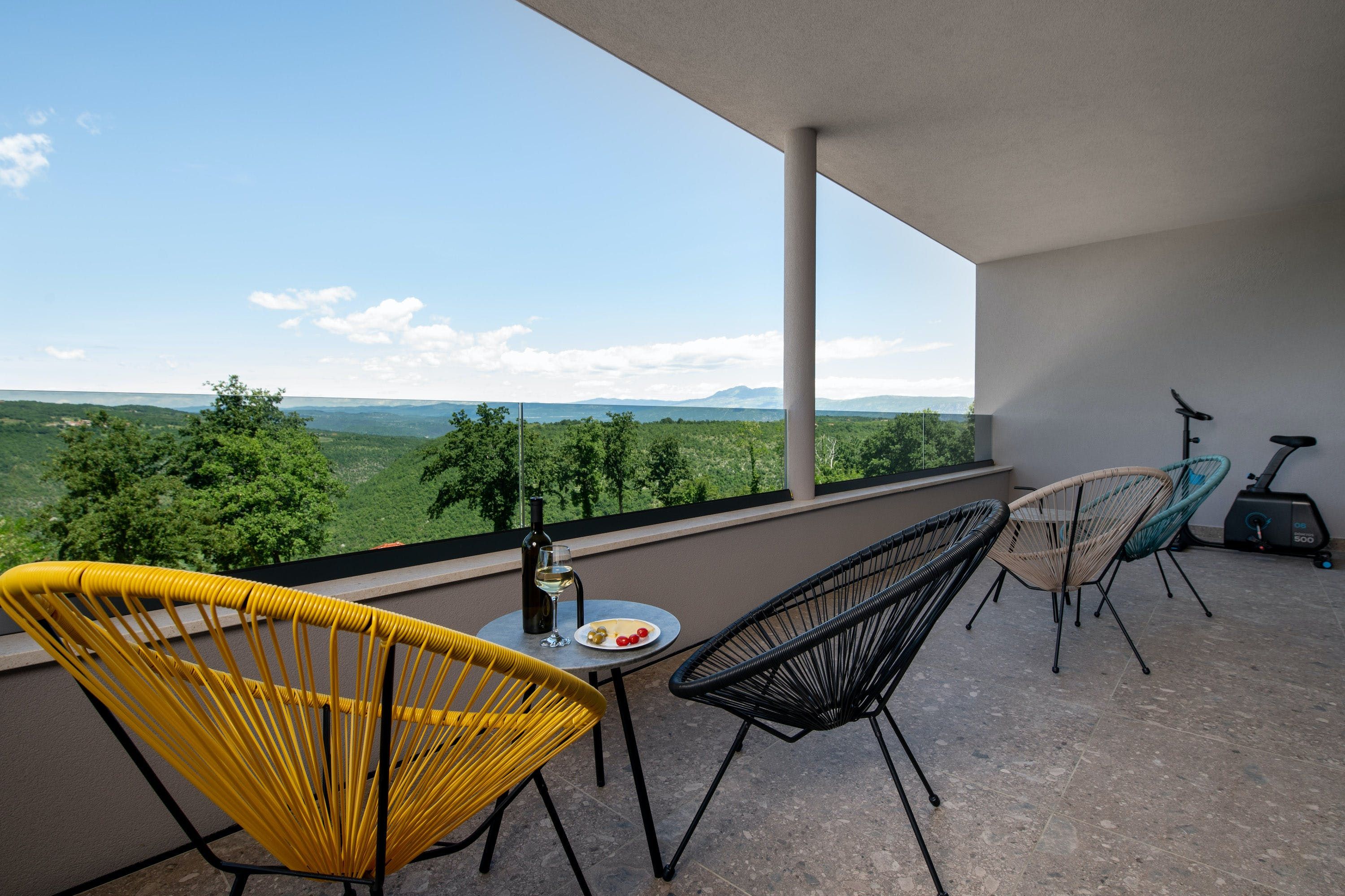 This home is a stunning upscale getaway located in a quiet rural environment. You'll find nearby beaches and a completely fenced private area here, including a basketball hoop. The villa features a covered terrace with comfortable outdoor furniture and an exclusive panoramic view of the Istrian Hills. The swimming pool can be heated by solar energy and a pump, and there are plenty of sunbeds and umbrellas on the adjacent sun terrace for all fellow vacationers. The villa also features ping pong tables, soccer goals, a hammock, and a hanging chair. The fully air-conditioned house has an open living/dining area, a fully equipped kitchen integrated into the space, four chic bedrooms with en-suite bathrooms and fitness equipment. With its beautiful location, facilities and style, the home is almost unbeatable.