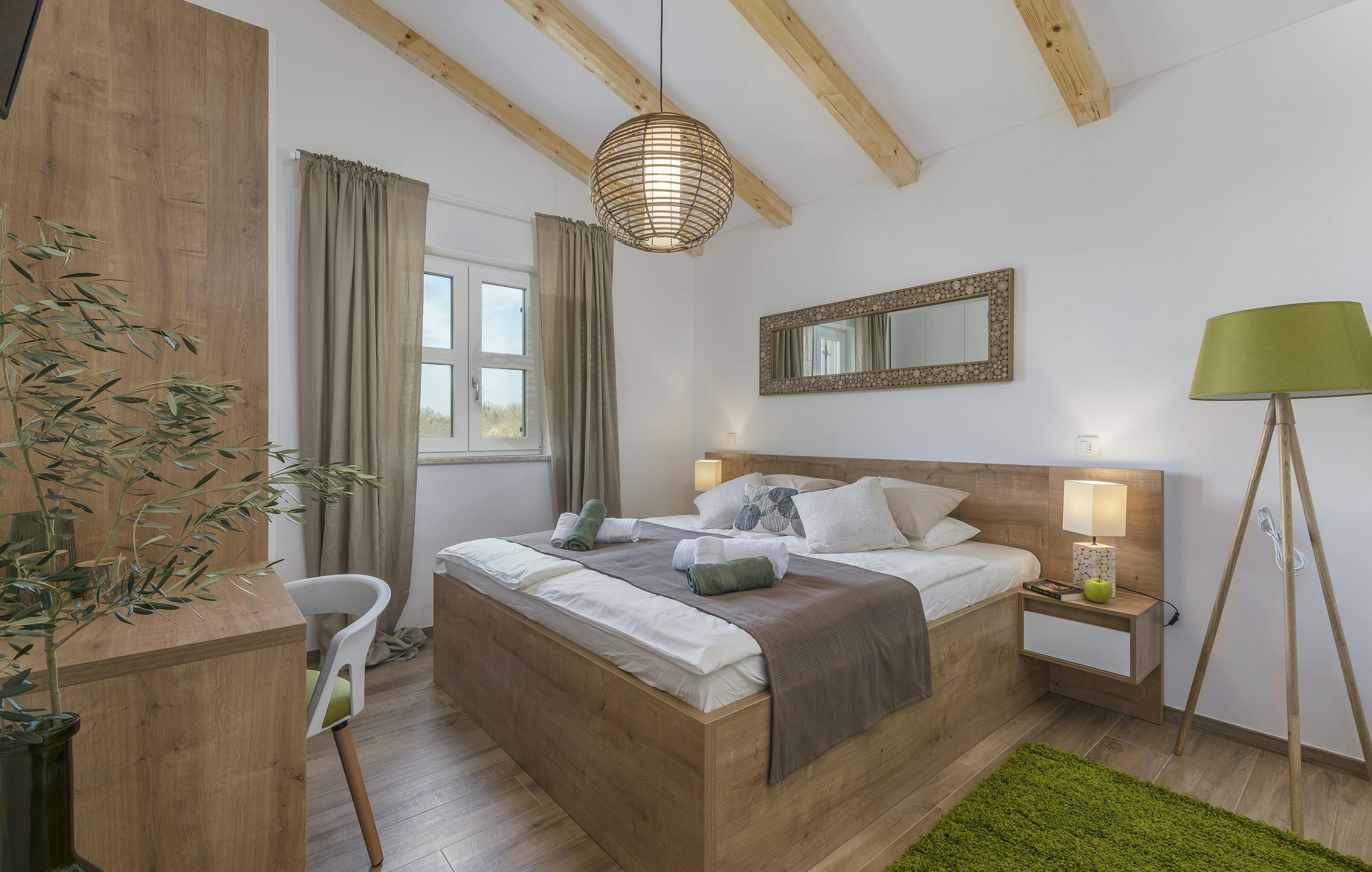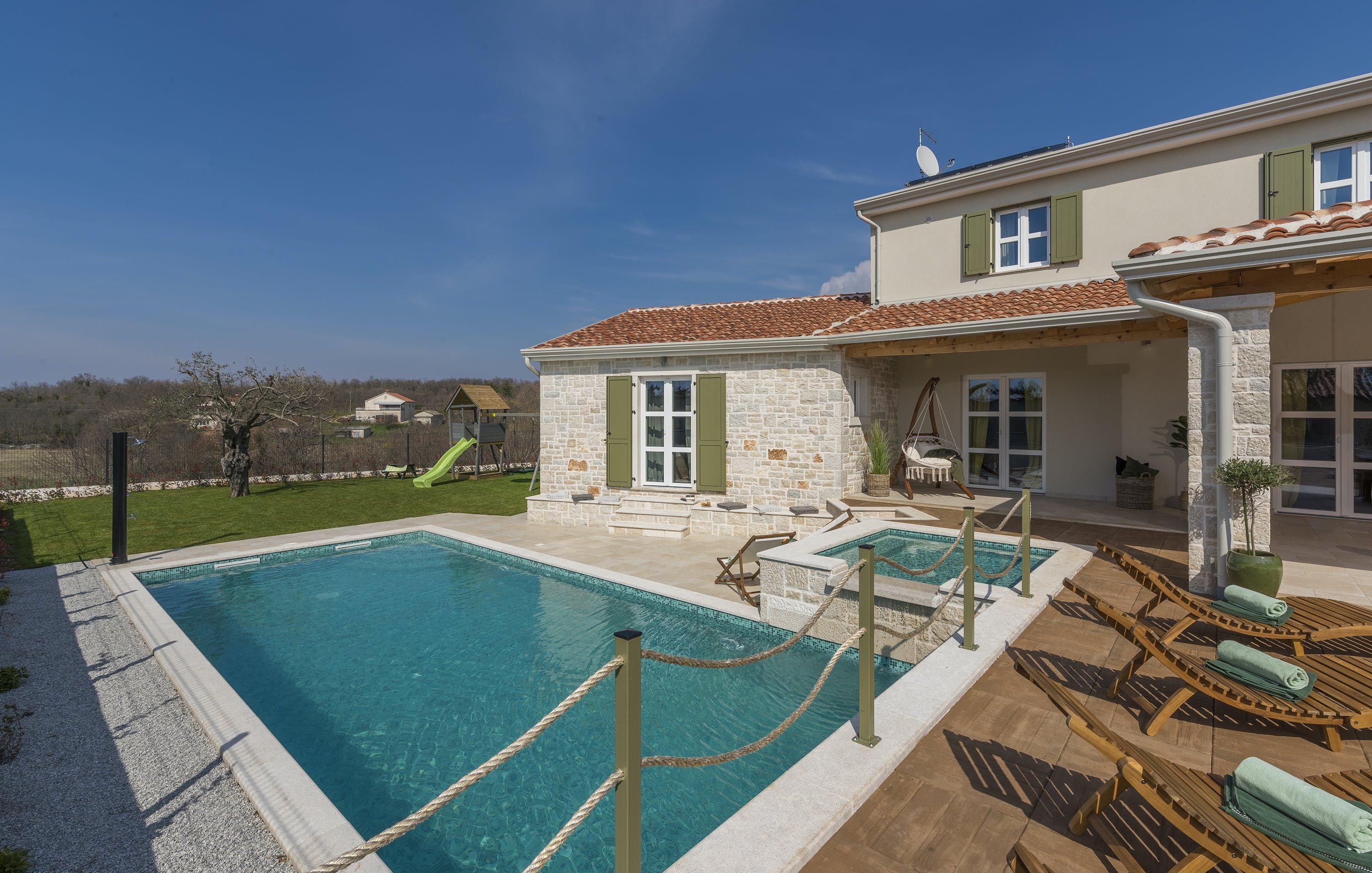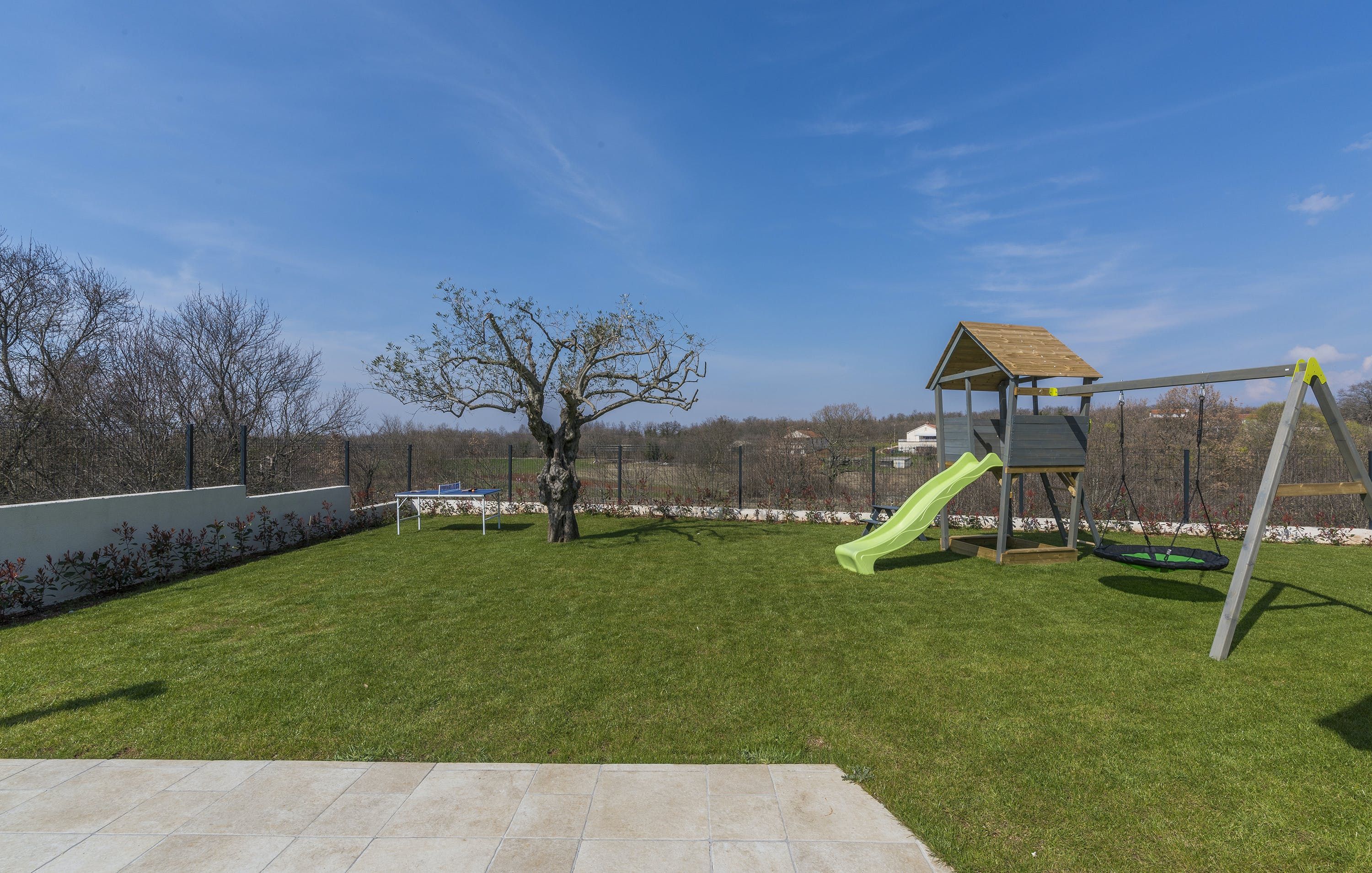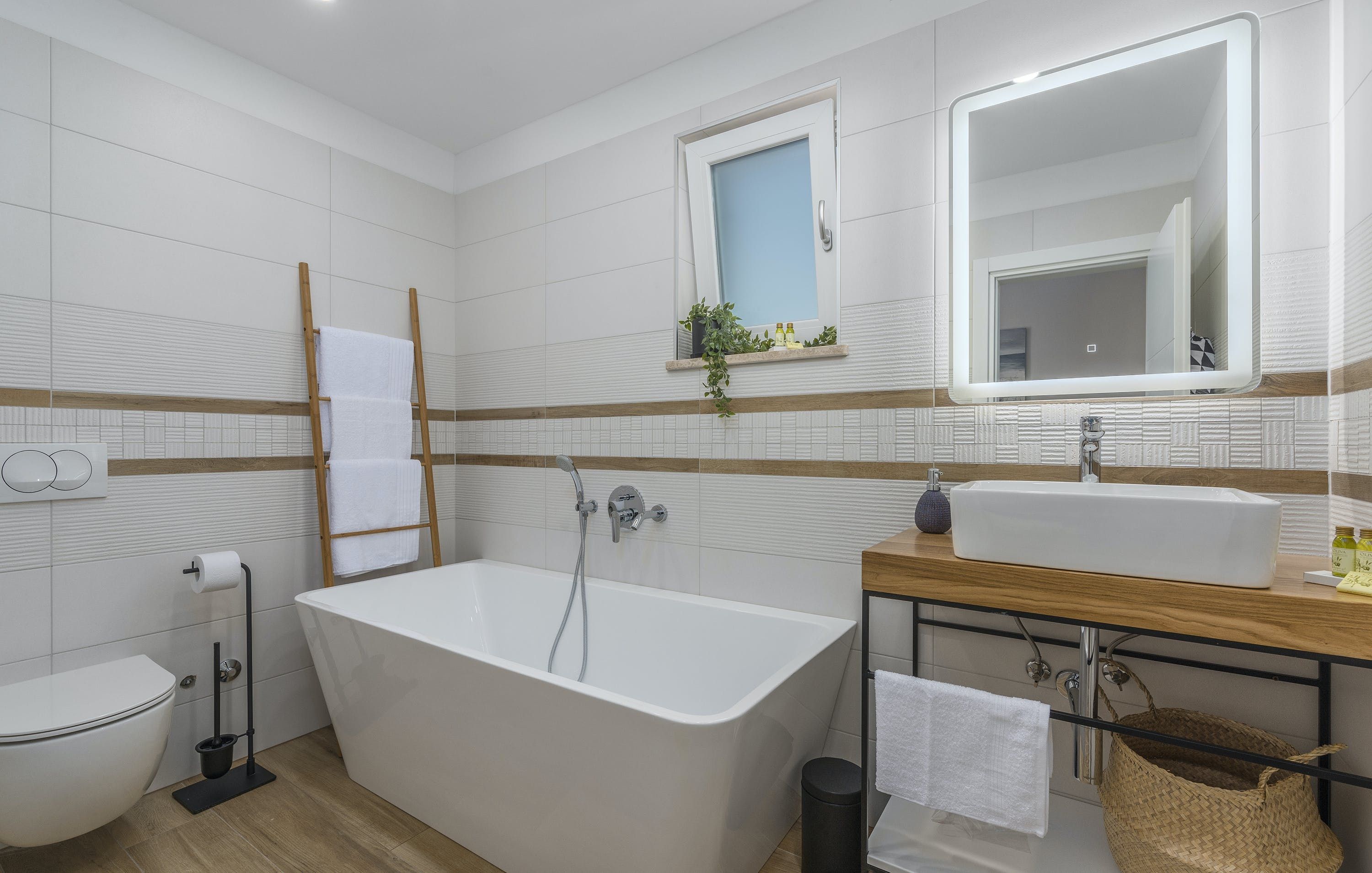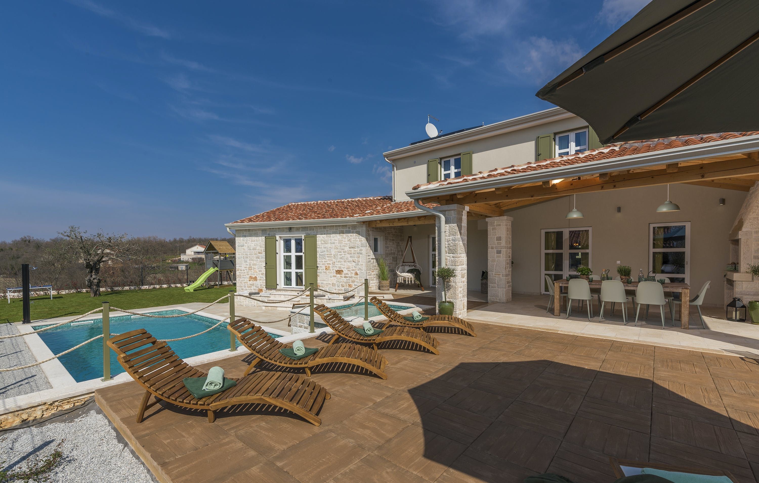 This charming villa boasts an impressive outdoor paradise that is completely fenced and well-maintained. Guests can enjoy covered and open seating areas, a charcoal grill, hanging relax chairs, deckchairs and loungers, a heatable 40m² mosaic-studded pool, and a whirlpool. Children can also enjoy the playground and ping-pong table on the beautiful lawn. Two bicycles are available for guests who want to explore the area. Inside, the trendy living-dining room has an integrated kitchen with a small children's corner, perfect for spending time together without having to coordinate. The three super comfortable bedrooms are designed with lots of wood, gray and brown tones to provide an extra cosy touch. The first floor has a double bedroom with en suite shower room and direct access to the pool, as well as a second bedroom for two plus en suite shower room with a practical guest toilet. The upper floor houses the other two bedrooms - one with access to the balcony, both with bath en suite. Overall, this charming villa is a great choice for those looking for a high feel-good factor.