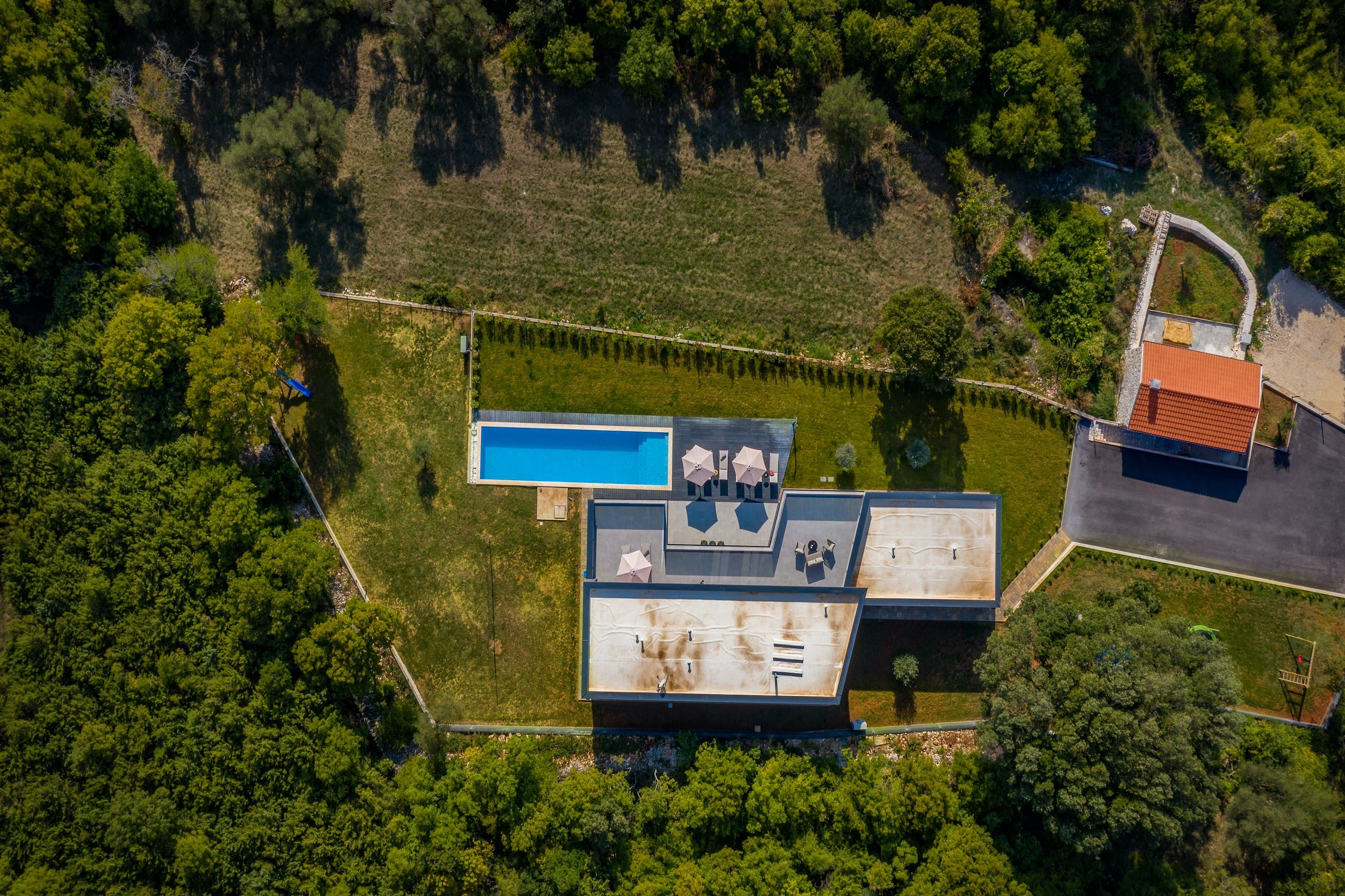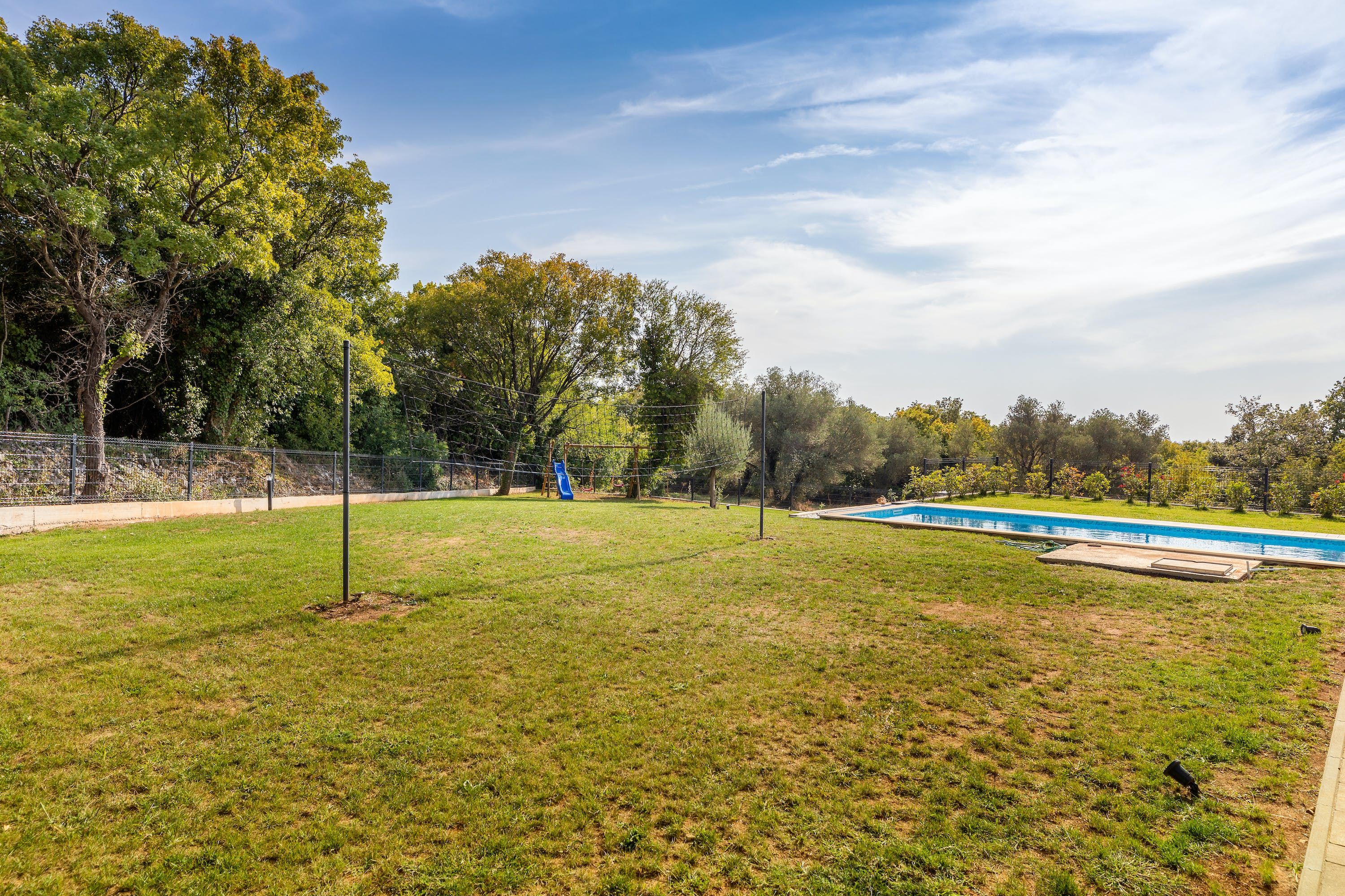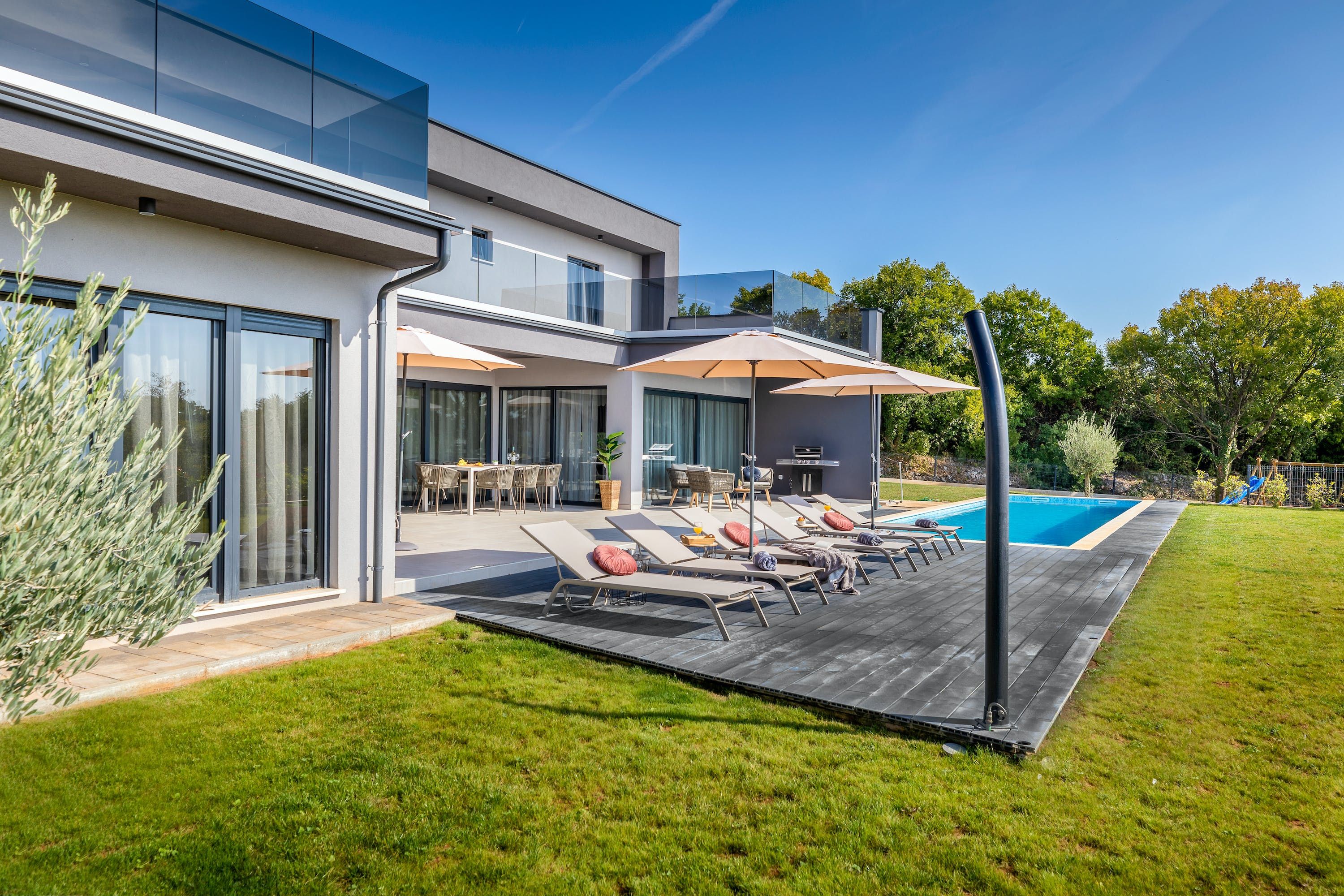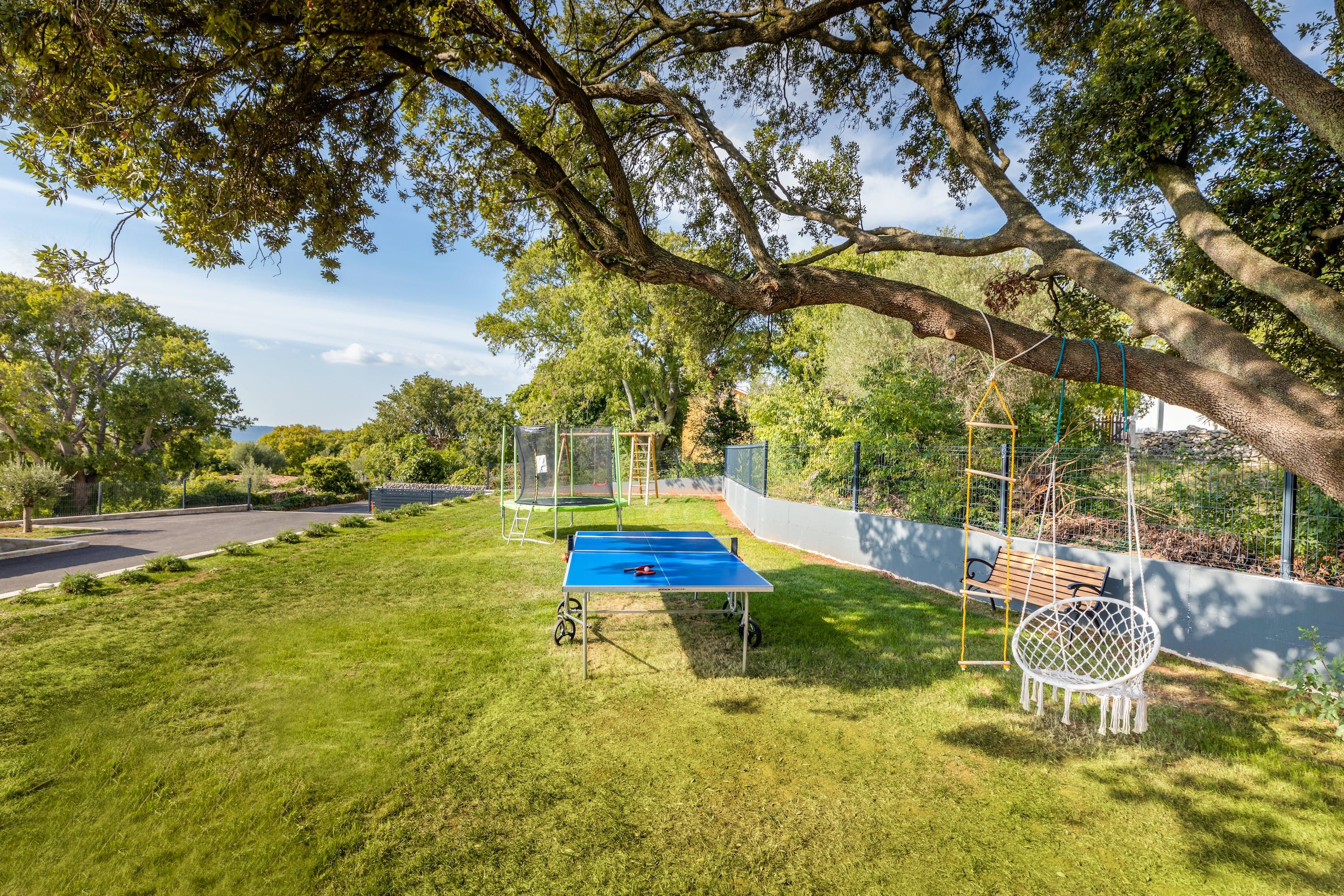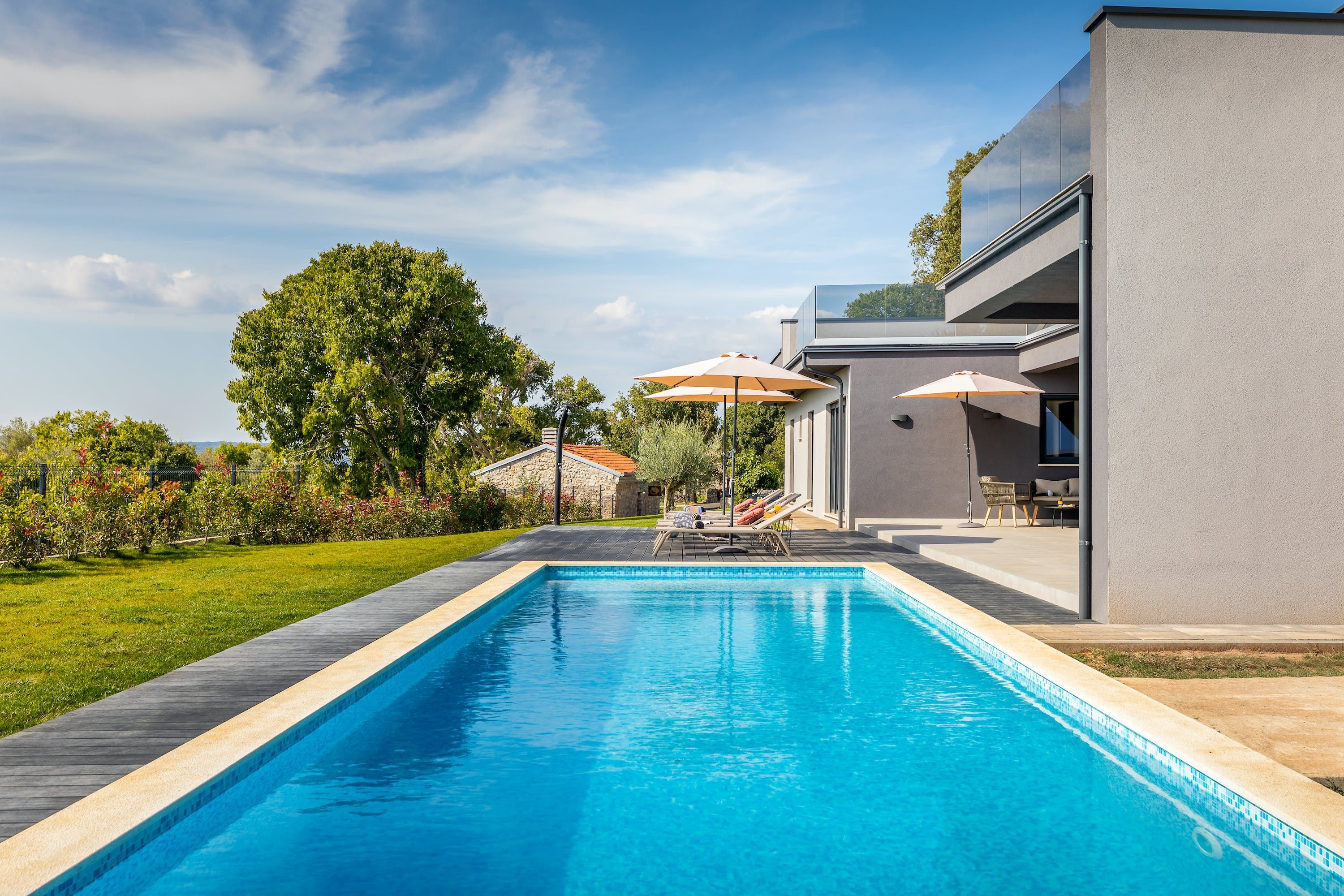 This luxurious villa is nestled on a hillside surrounded by lush greenery and old trees, offering stunning views of the surrounding landscape. The 15-meter pool, which can be heated upon request, is perfect for a refreshing swim or relaxing on the adjacent sun deck with comfortable sunbeds and shady umbrellas. The covered terrace features a dining table, two cosy lounges, and a gas grill, while the stone outhouse offers a seating area, brick barbecue, small tavern, and billiard table for an enjoyable end to the day. The open-plan living and dining area is elegantly designed with attention to detail and ample seating for all guests at the large dining table. The fully equipped kitchen leaves nothing to be desired. This six-bedroom villa on two floors is fully air-conditioned with each room having its own chic en suite bathroom and TV. Three bedrooms on the upper floor offer access to the balcony with a lounge area boasting magnificent views. Guests can also enjoy the wellness amenities of a sauna and Jacuzzi. This property is a glamorous complete package of not everyday amenities.