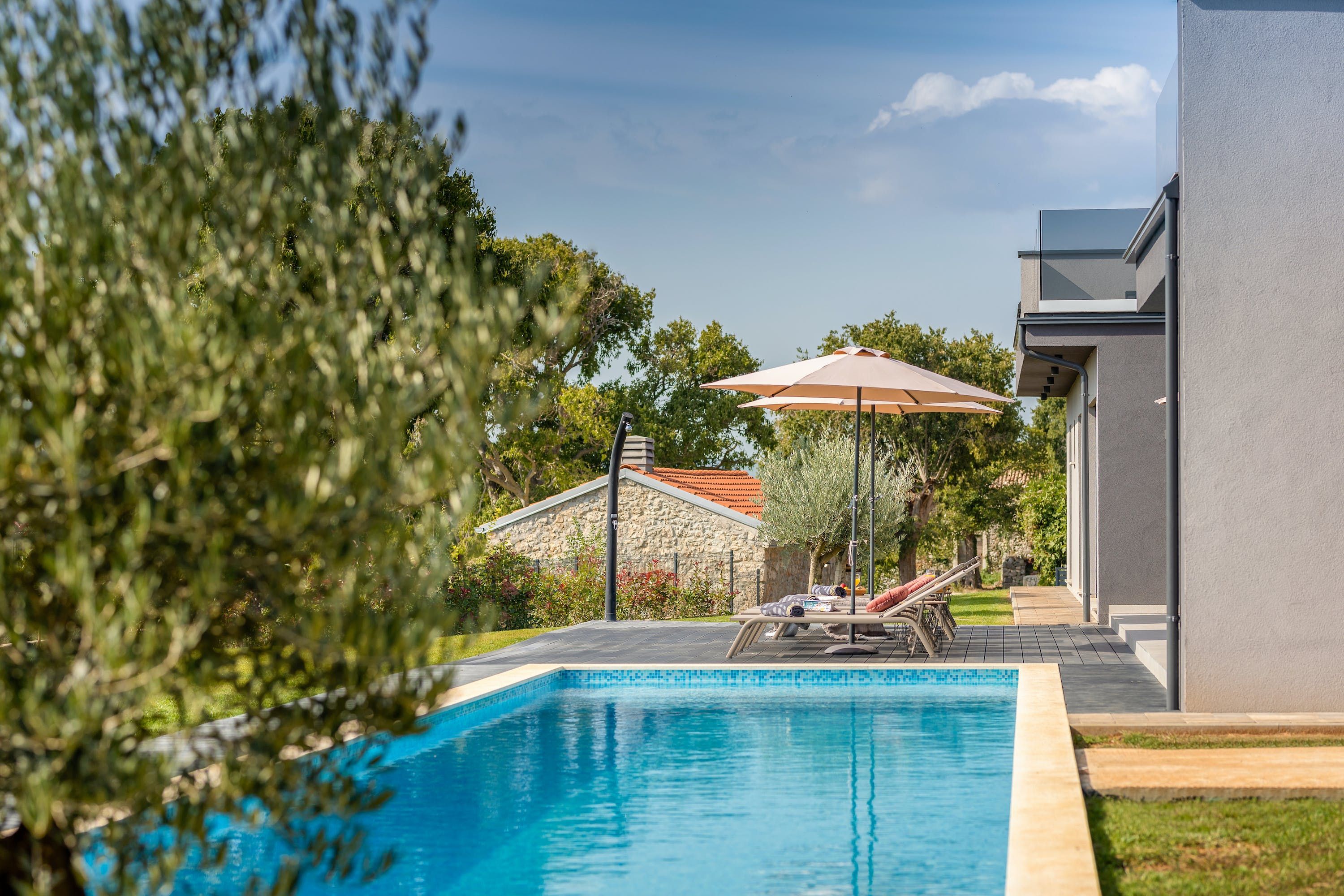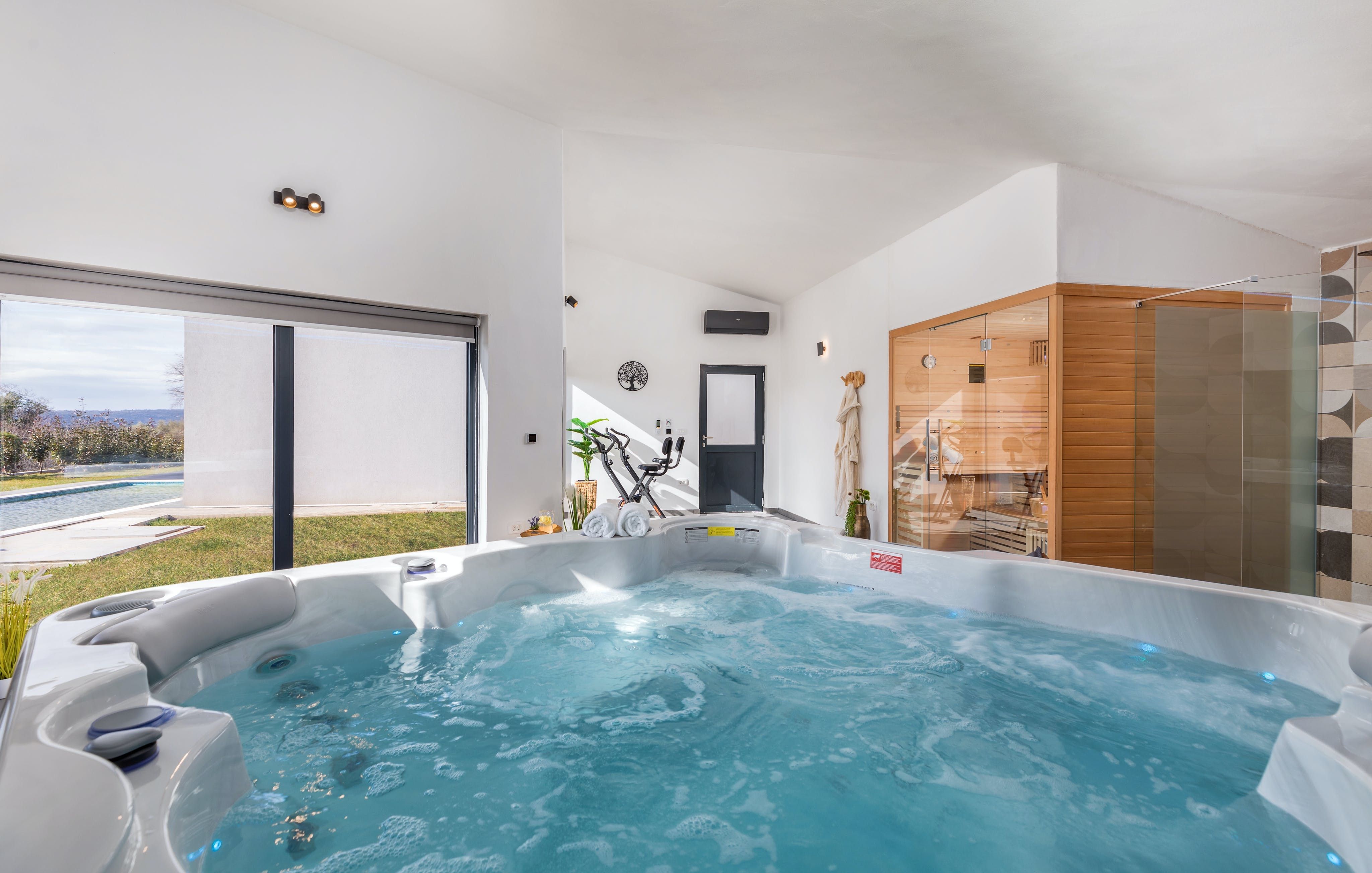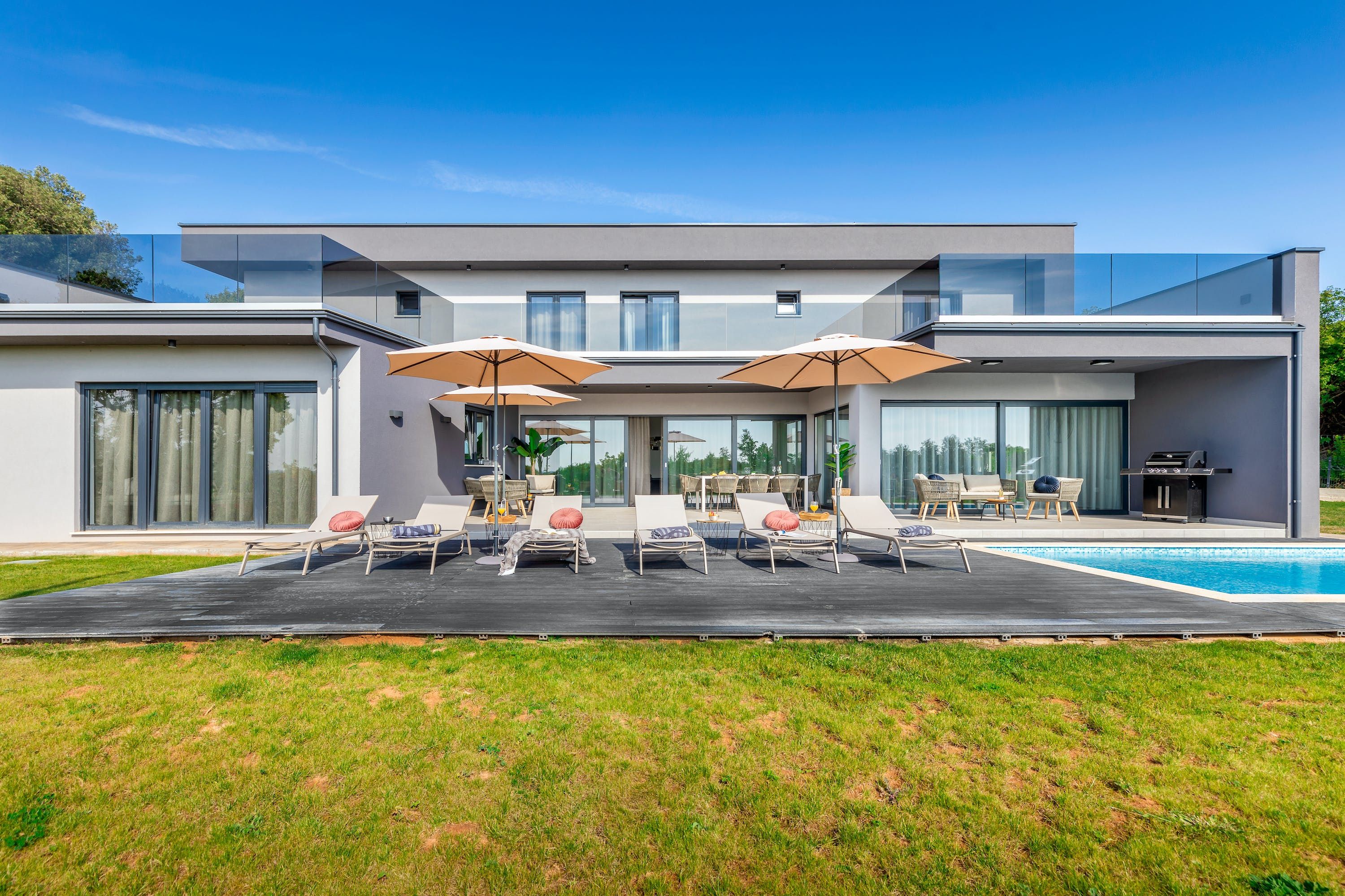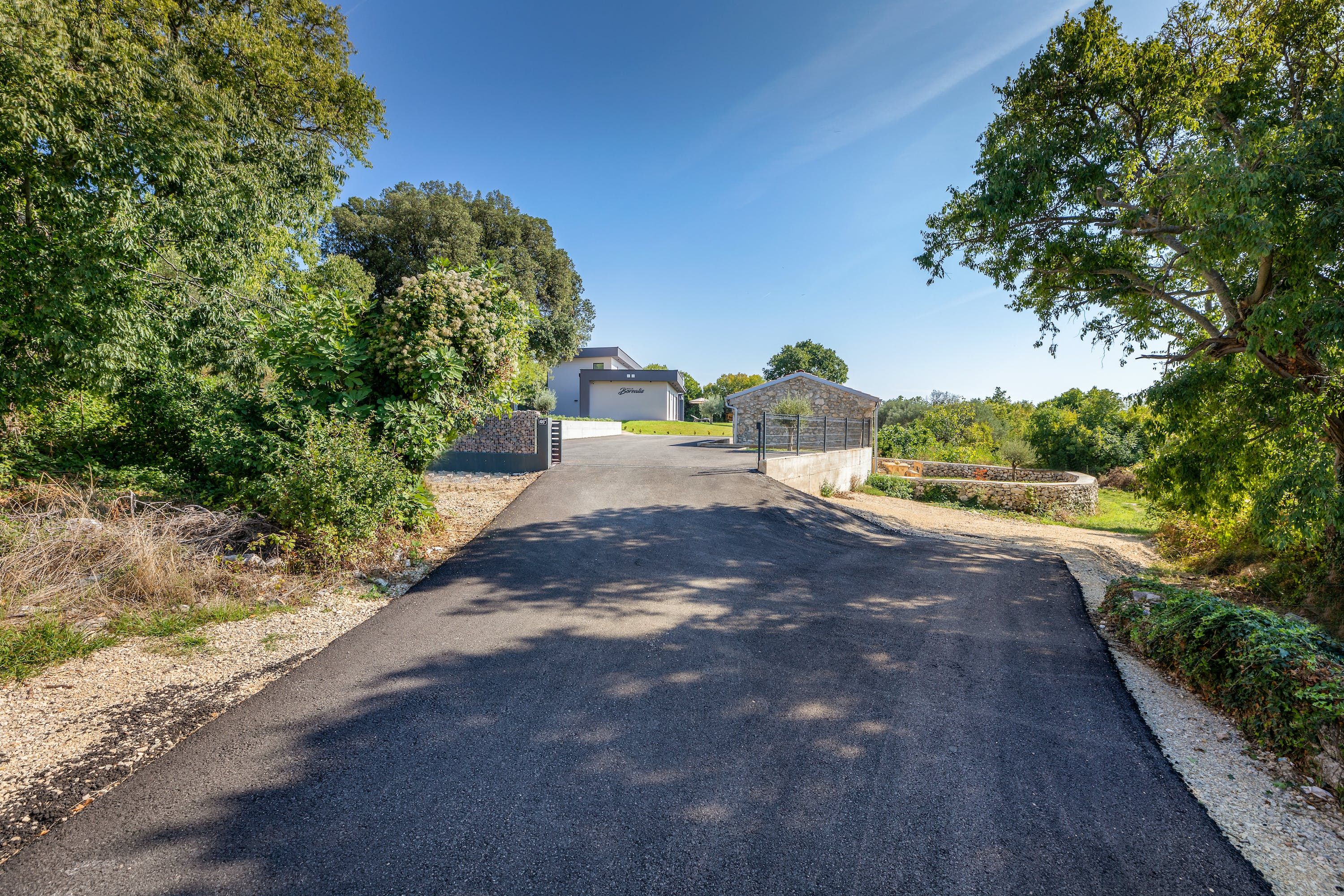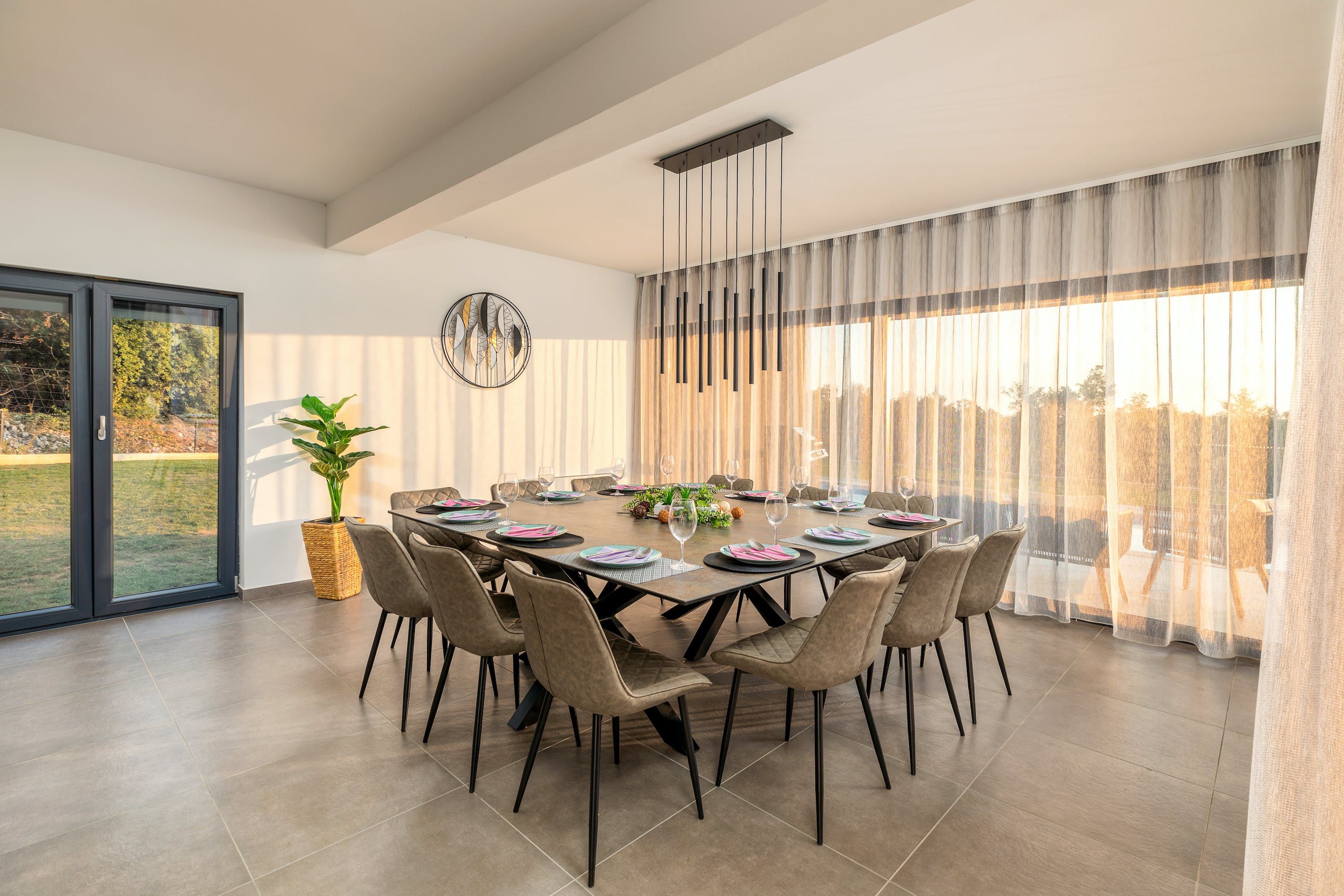 This luxurious villa is nestled on a hillside surrounded by lush greenery and old trees, offering stunning views of the surrounding landscape. The 15-meter pool, which can be heated upon request, is perfect for a refreshing swim or relaxing on the adjacent sun deck with comfortable sunbeds and shady umbrellas. The covered terrace features a dining table, two cosy lounges, and a gas grill, while the stone outhouse offers a seating area, brick barbecue, small tavern, and billiard table for an enjoyable end to the day. The open-plan living and dining area is elegantly designed with attention to detail and ample seating for all guests at the large dining table. The fully equipped kitchen leaves nothing to be desired. This six-bedroom villa on two floors is fully air-conditioned with each room having its own chic en suite bathroom and TV. Three bedrooms on the upper floor offer access to the balcony with a lounge area boasting magnificent views. Guests can also enjoy the wellness amenities of a sauna and Jacuzzi. This property is a glamorous complete package of not everyday amenities.