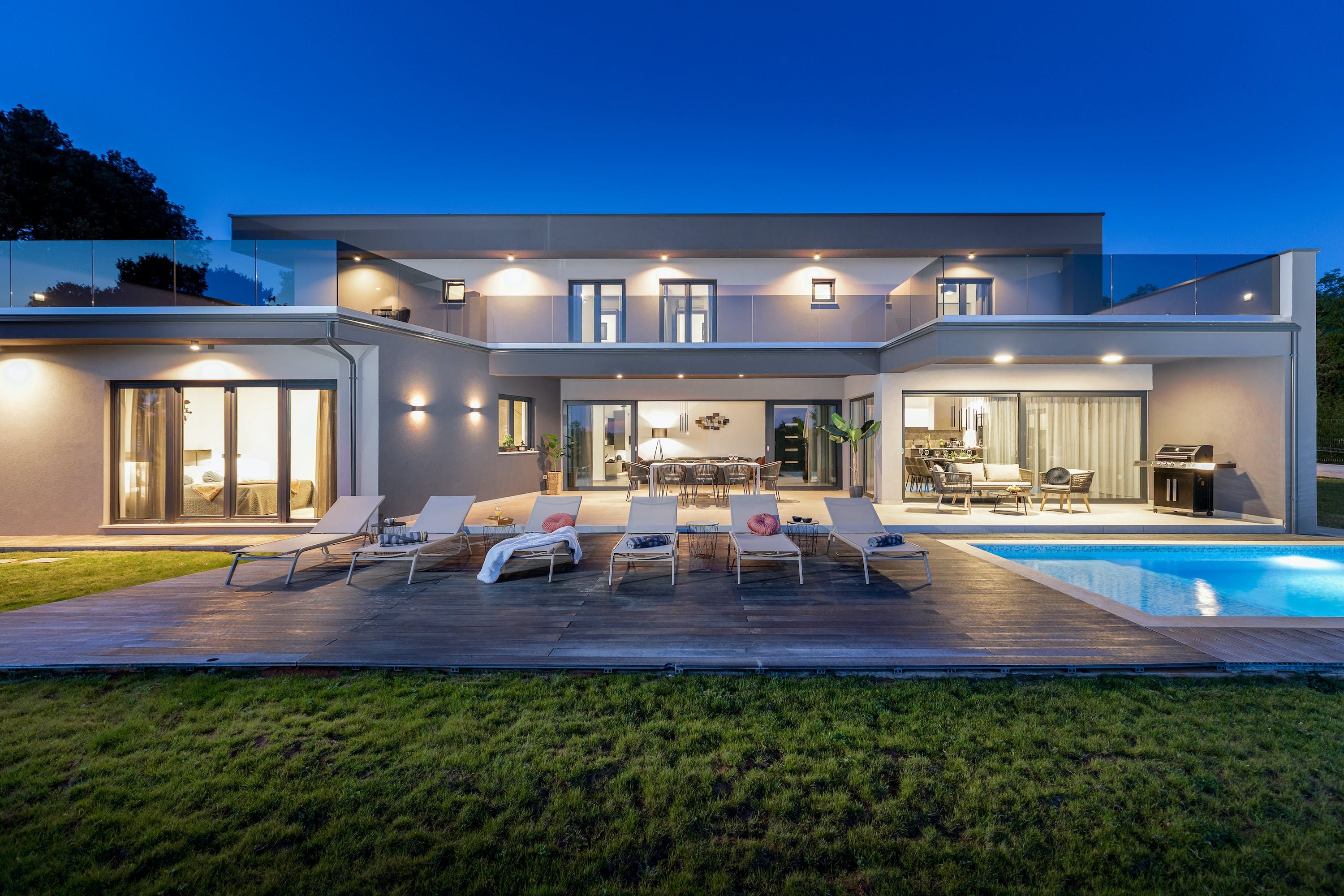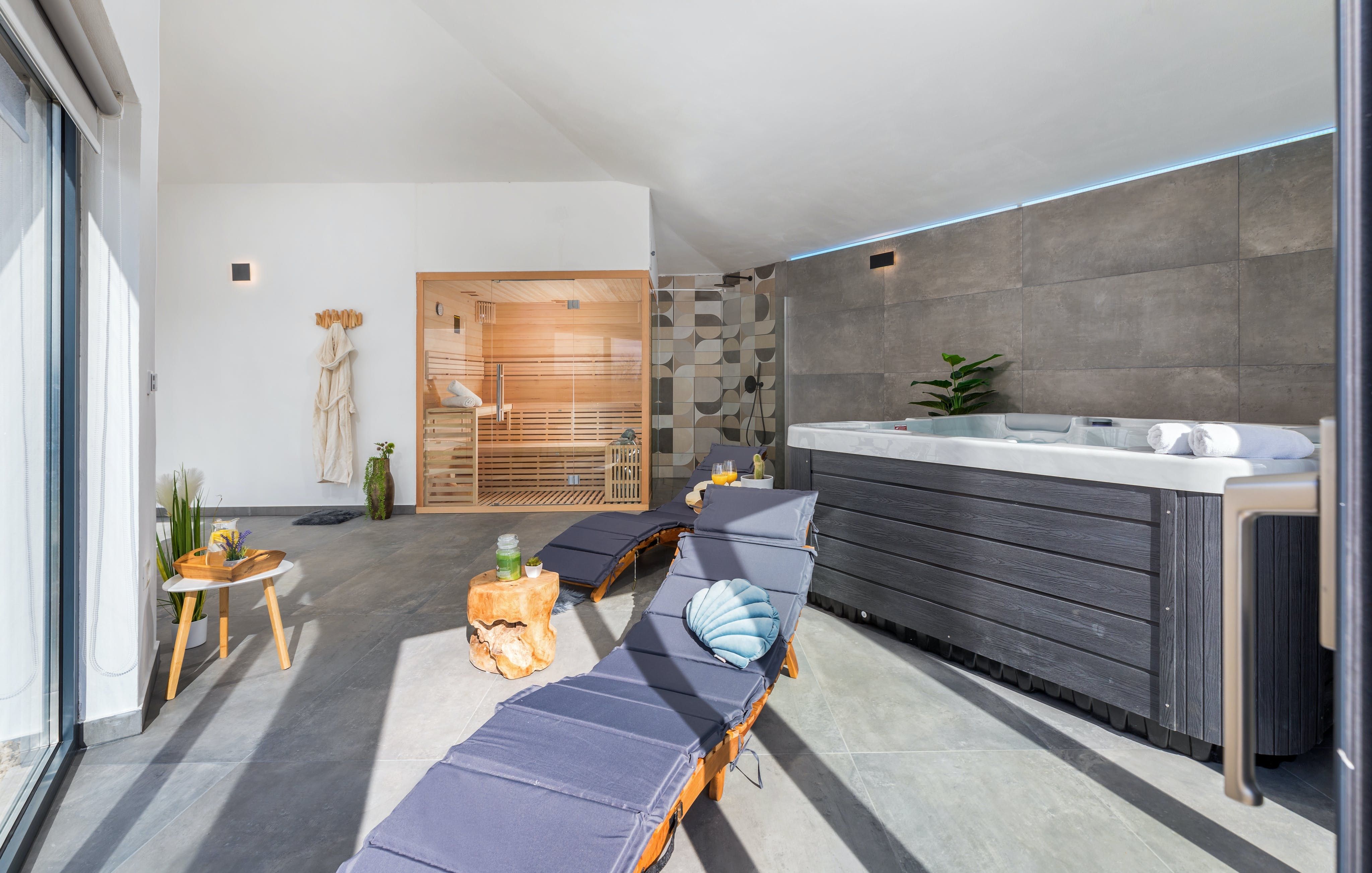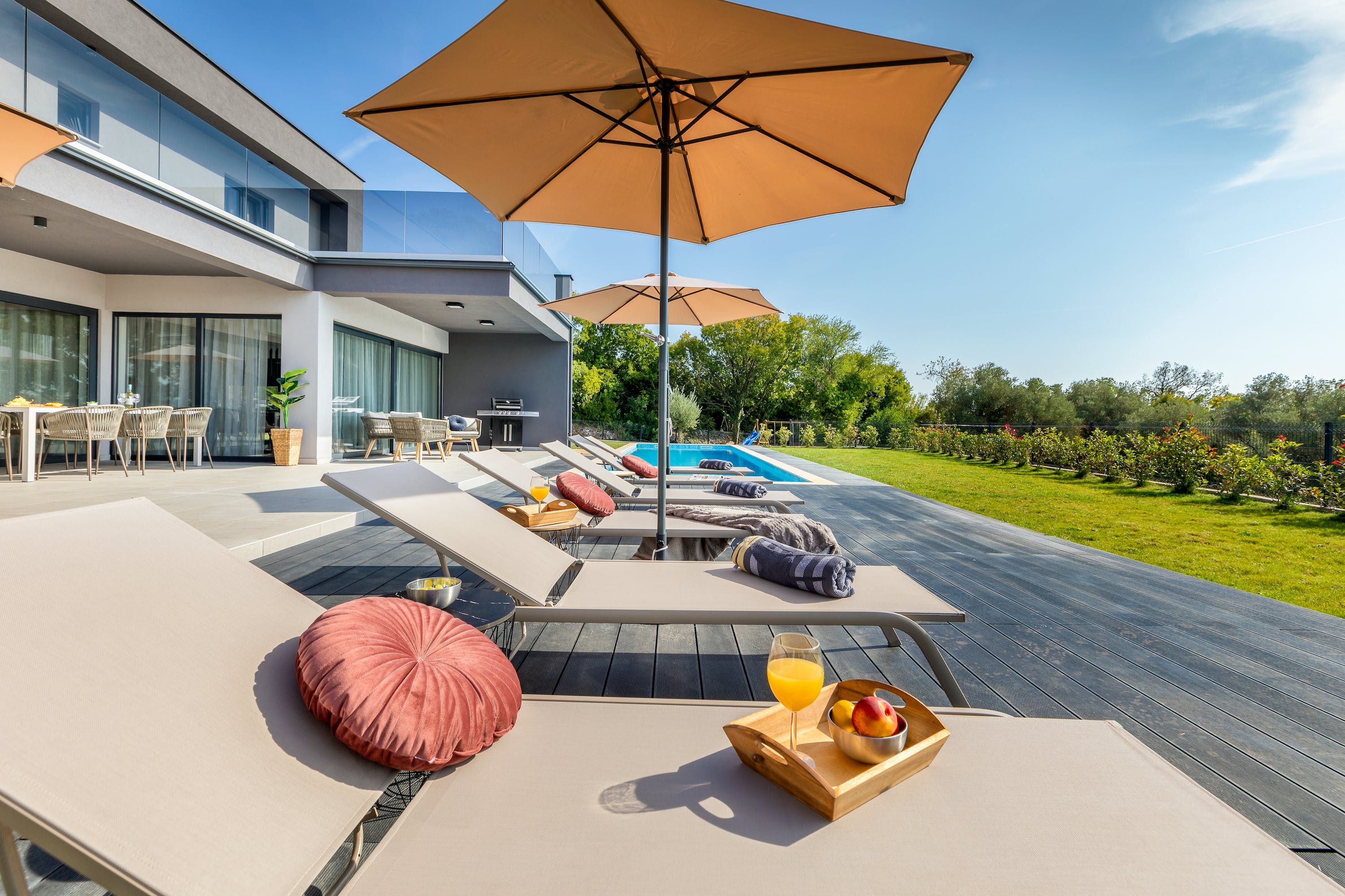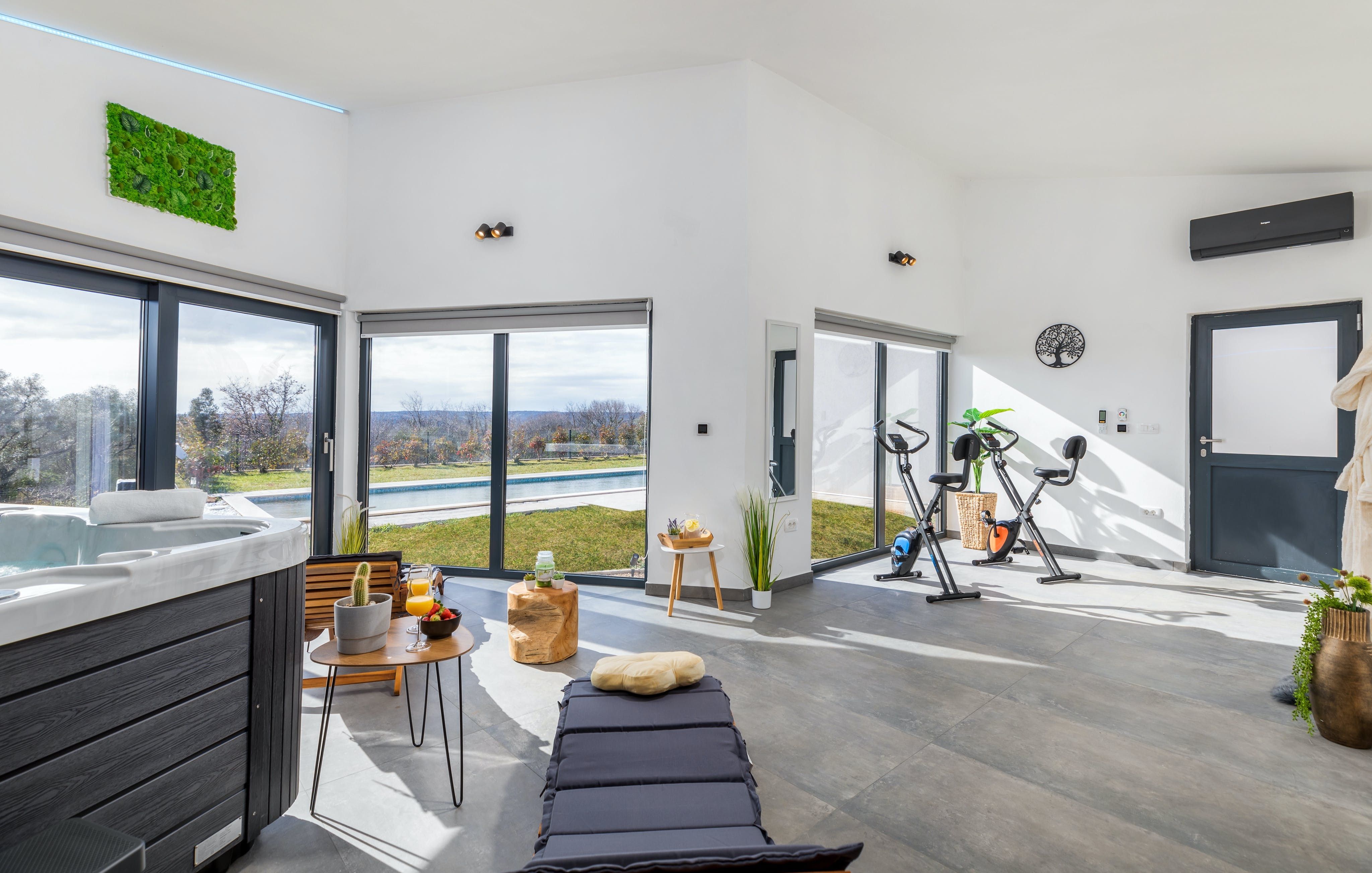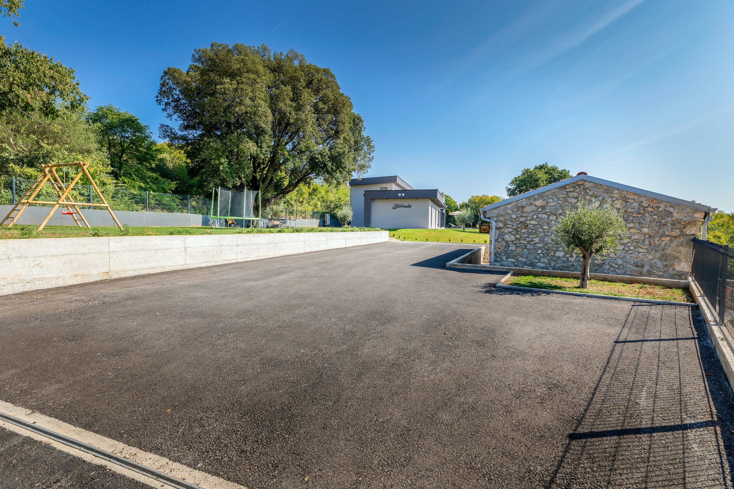 This luxurious villa is nestled on a hillside surrounded by lush greenery and old trees, offering stunning views of the surrounding landscape. The 15-meter pool, which can be heated upon request, is perfect for a refreshing swim or relaxing on the adjacent sun deck with comfortable sunbeds and shady umbrellas. The covered terrace features a dining table, two cosy lounges, and a gas grill, while the stone outhouse offers a seating area, brick barbecue, small tavern, and billiard table for an enjoyable end to the day. The open-plan living and dining area is elegantly designed with attention to detail and ample seating for all guests at the large dining table. The fully equipped kitchen leaves nothing to be desired. This six-bedroom villa on two floors is fully air-conditioned with each room having its own chic en suite bathroom and TV. Three bedrooms on the upper floor offer access to the balcony with a lounge area boasting magnificent views. Guests can also enjoy the wellness amenities of a sauna and Jacuzzi. This property is a glamorous complete package of not everyday amenities.