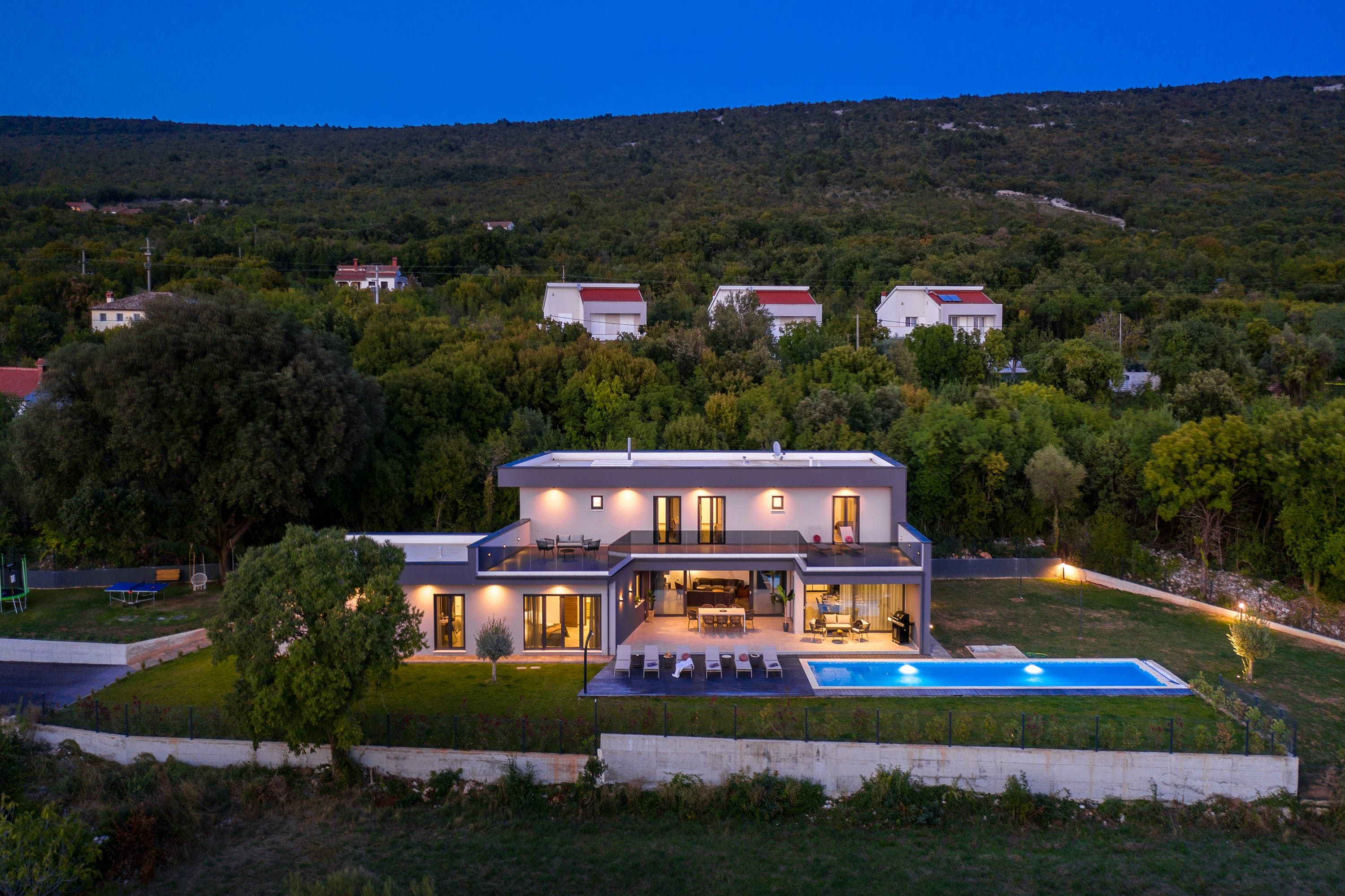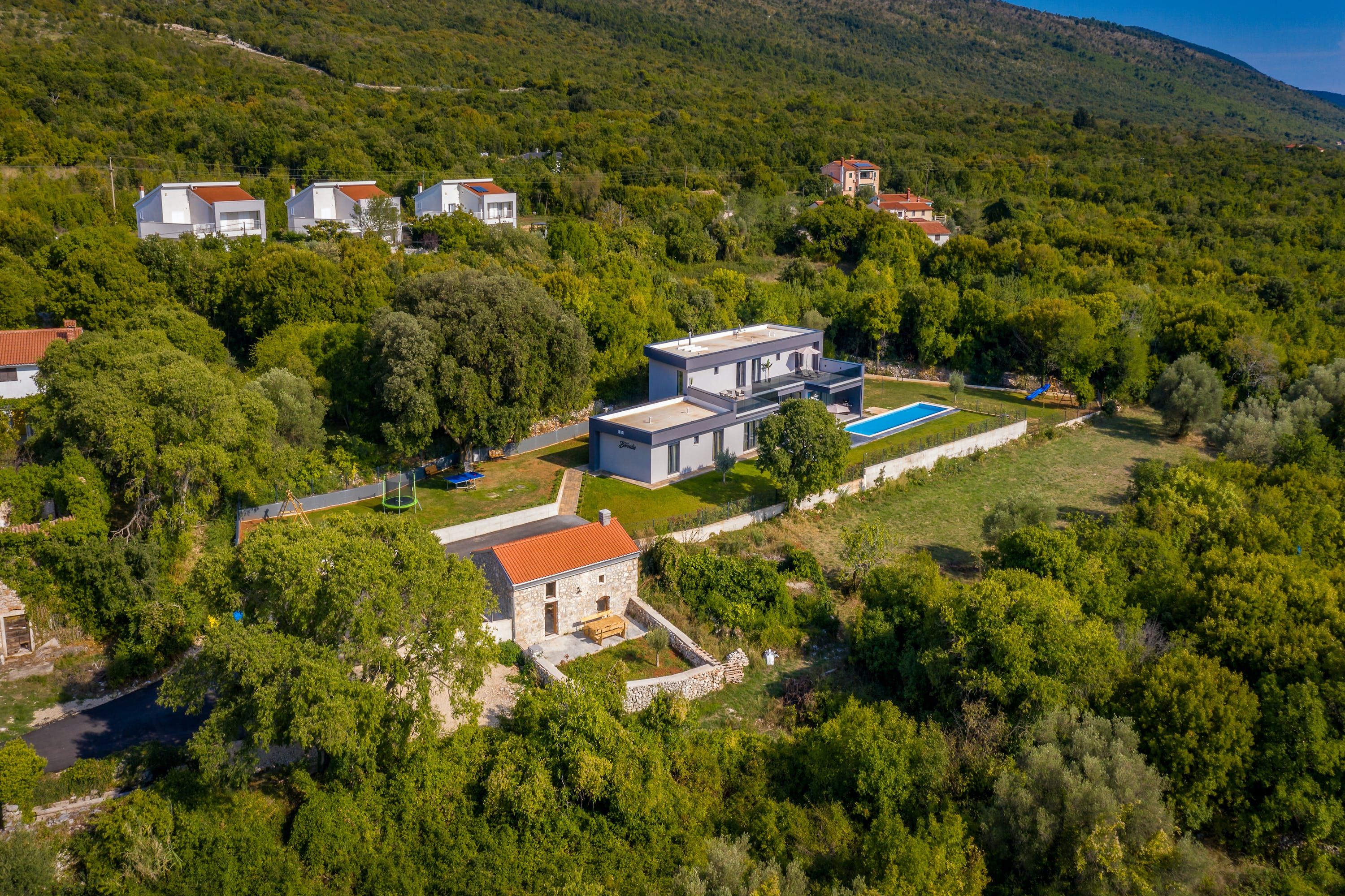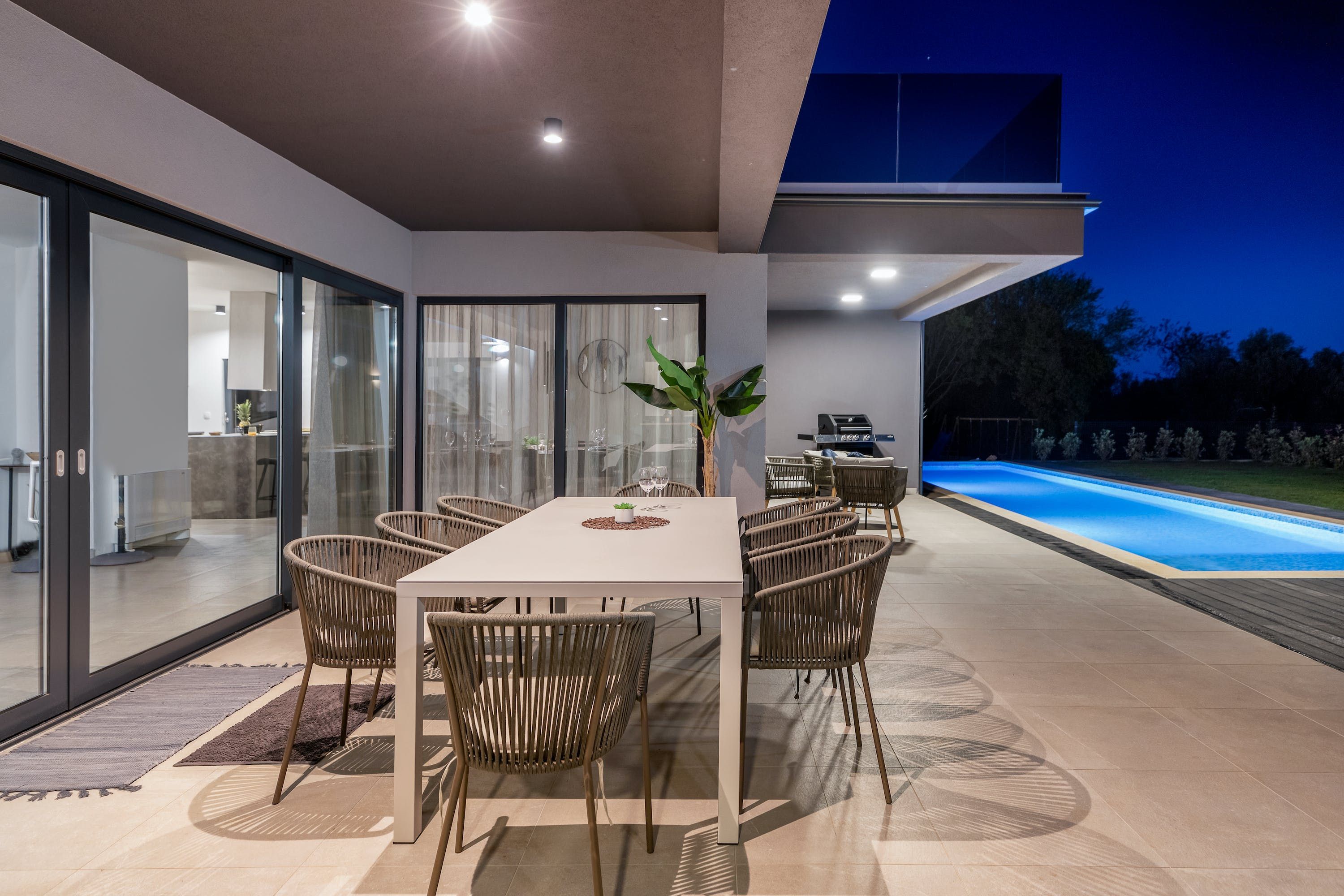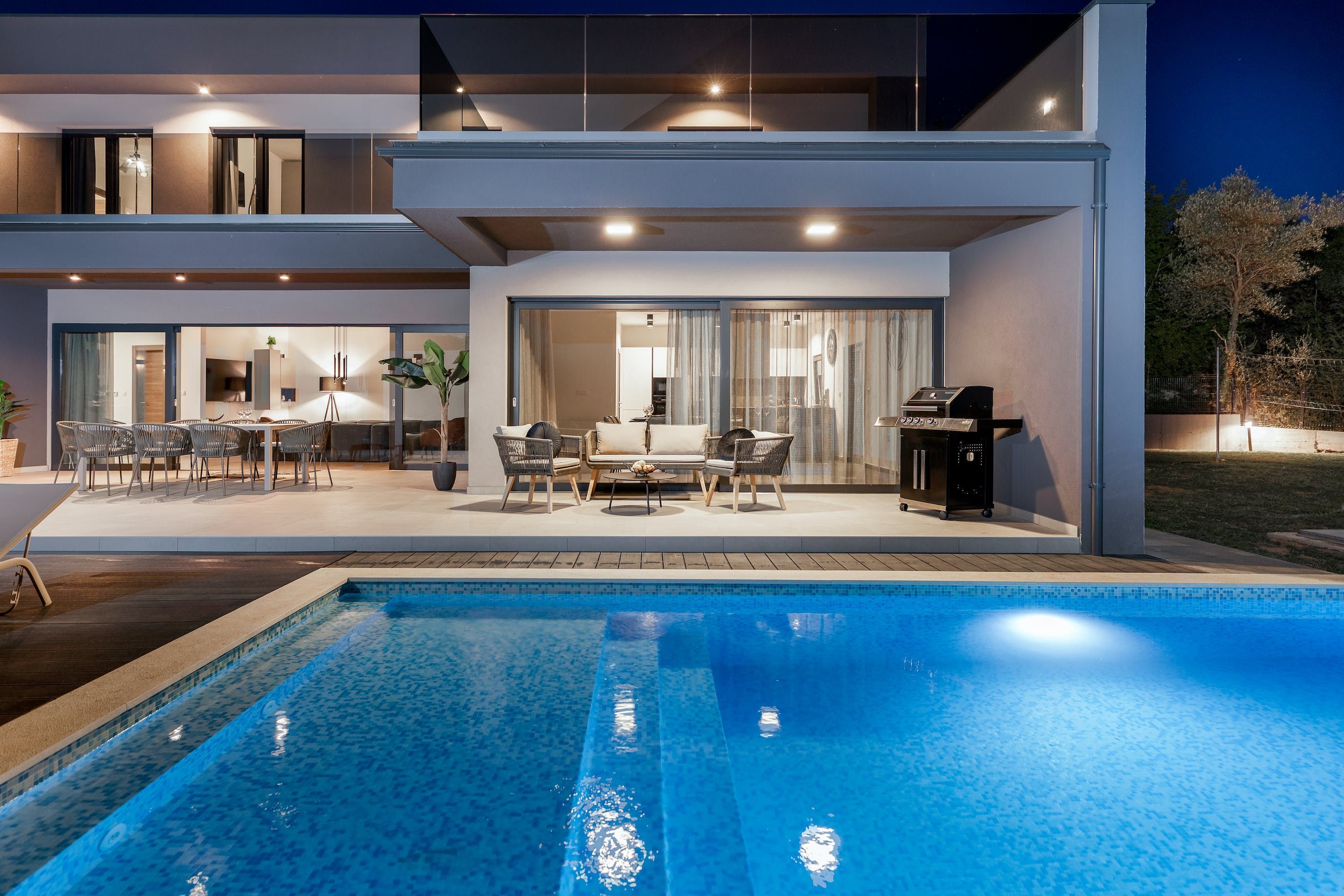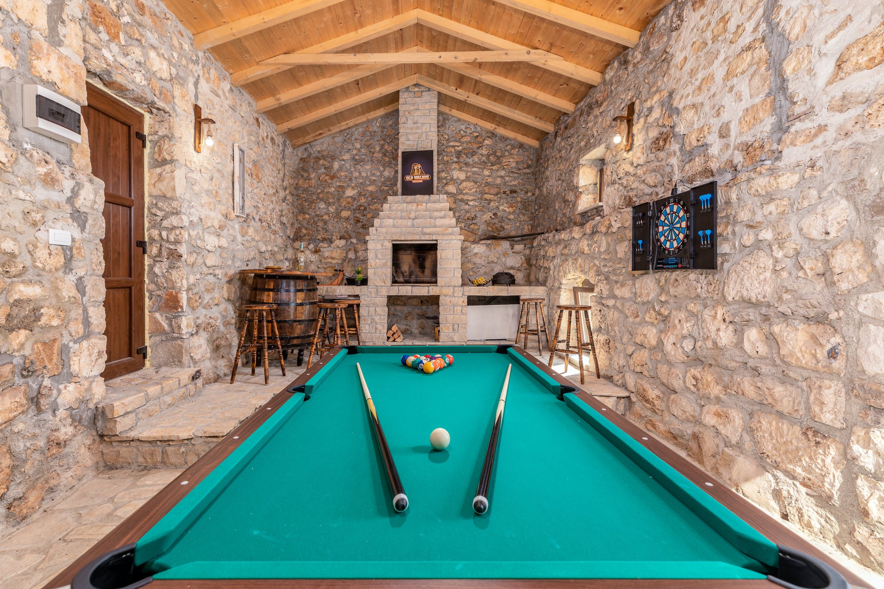 This luxurious villa is nestled on a hillside surrounded by lush greenery and old trees, offering stunning views of the surrounding landscape. The 15-meter pool, which can be heated upon request, is perfect for a refreshing swim or relaxing on the adjacent sun deck with comfortable sunbeds and shady umbrellas. The covered terrace features a dining table, two cosy lounges, and a gas grill, while the stone outhouse offers a seating area, brick barbecue, small tavern, and billiard table for an enjoyable end to the day. The open-plan living and dining area is elegantly designed with attention to detail and ample seating for all guests at the large dining table. The fully equipped kitchen leaves nothing to be desired. This six-bedroom villa on two floors is fully air-conditioned with each room having its own chic en suite bathroom and TV. Three bedrooms on the upper floor offer access to the balcony with a lounge area boasting magnificent views. Guests can also enjoy the wellness amenities of a sauna and Jacuzzi. This property is a glamorous complete package of not everyday amenities.