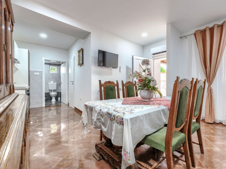 2-room semi-detached house on the ground floor. Living/dining room with satellite TV (flat screen), air conditioning. Exit to the terrace. 1 room with 1 french bed (180 cm, length 200 cm). Open kitchen (oven, 4 ceramic glass hob hotplates, freezer, electric coffee machine). Shower/WC.