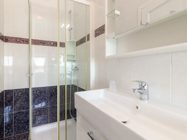 1-room apartment 33 m2 on 3rd floor. Studio. Open kitchen (4 hot plates, dishwasher, microwave, freezer, electric coffee machine) with 1 bed (80 cm, length 200 cm), 1 double bed, dining table, satellite TV and air conditioning. Shower/WC. No heating option. View of the sea and the town.