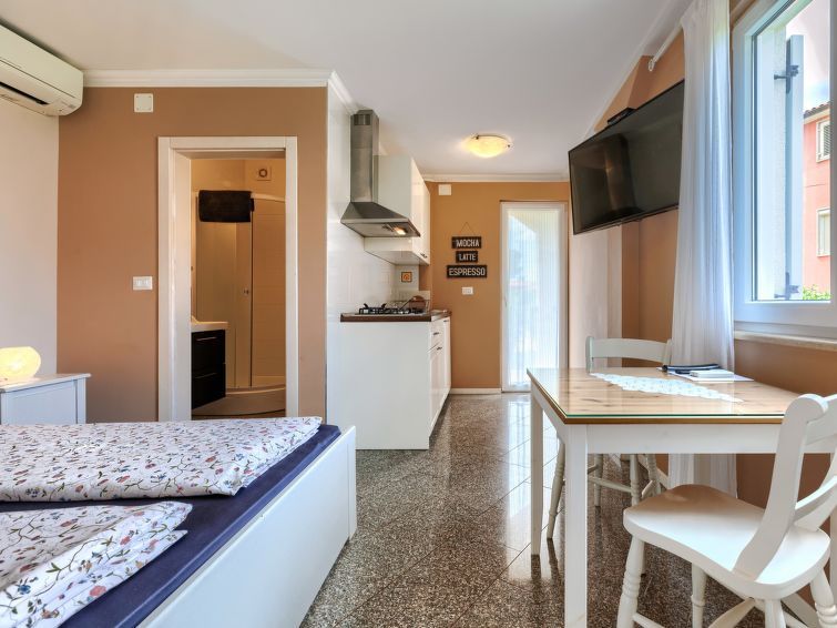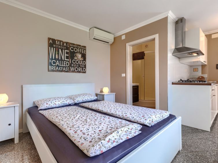 "Ćakule", 1-room apartment 23 m2, on the ground floor. Tasteful furnishings: Studio with 1 french bed (160 cm, length 200 cm), satellite TV and air conditioning. Exit to the terrace, to the swimming pool. Open kitchen (2 ceramic glass hob hotplates, freezer) with dining table. Shower/WC.