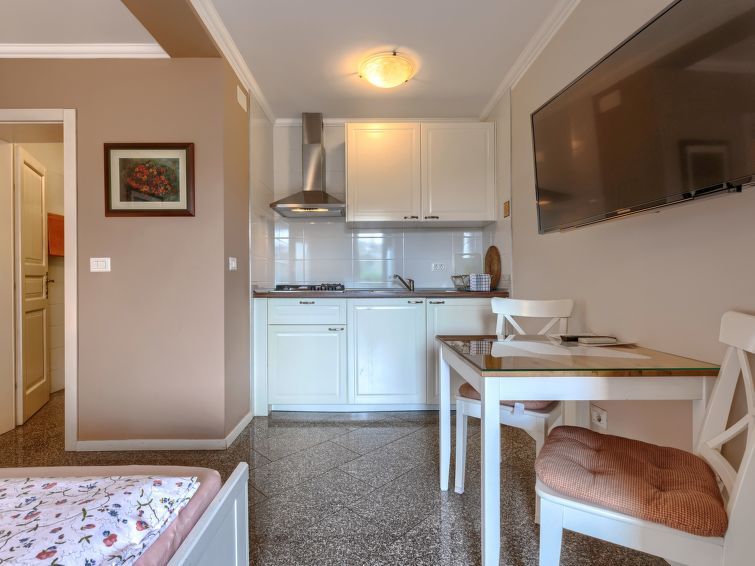 "Tiola", 1-room apartment 23 m2, on the ground floor. Tasteful furnishings: Studio with 1 french bed (160 cm, length 200 cm), satellite TV and air conditioning. Exit to the terrace, to the swimming pool. Open kitchen (2 ceramic glass hob hotplates, freezer) with dining table. Shower/WC.