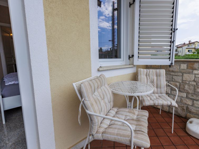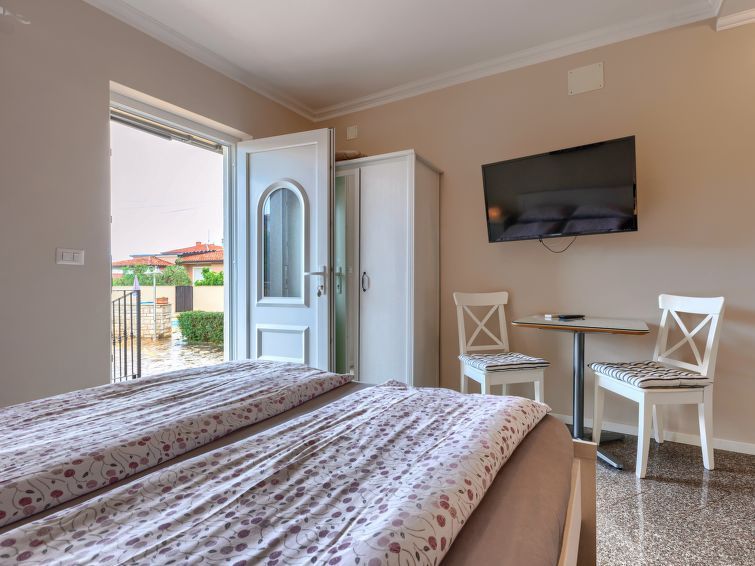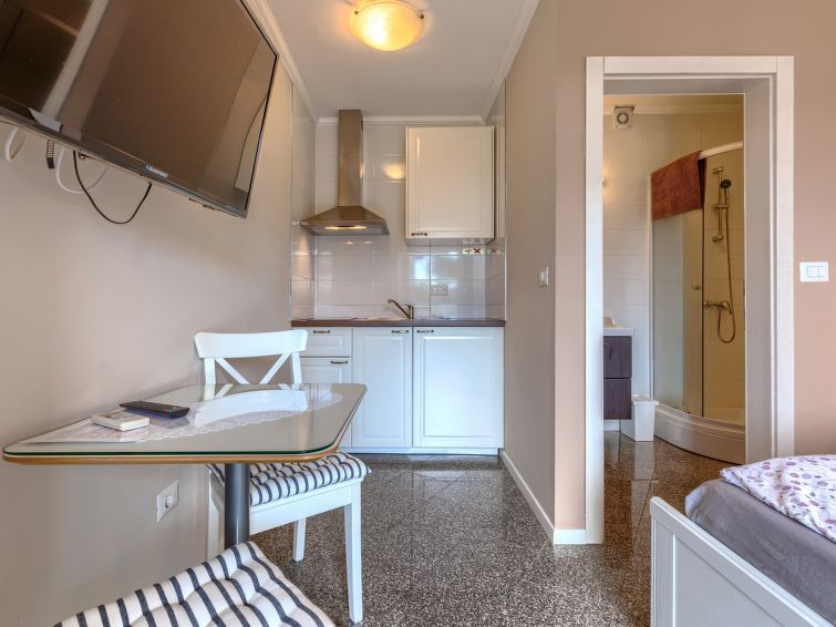 "Veccio", 1-room apartment 18 m2, on the ground floor. Tasteful furnishings: Studio with 1 french bed (160 cm, length 200 cm), satellite TV and air conditioning. Exit to the terrace, to the swimming pool. Open kitchen (2 ceramic glass hob hotplates, freezer) with dining table. Shower/WC.