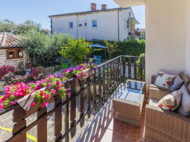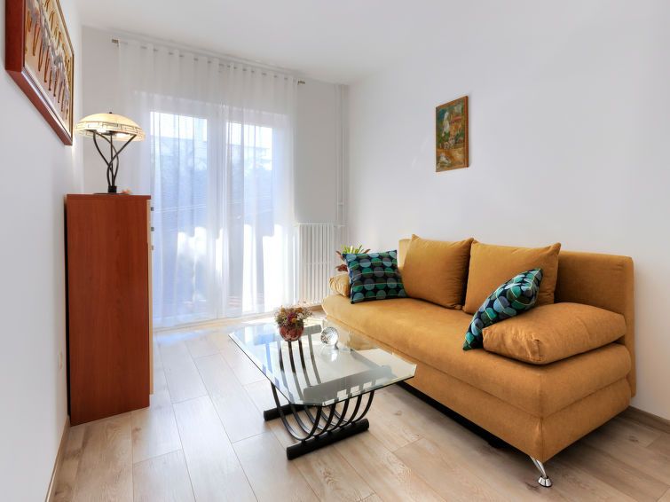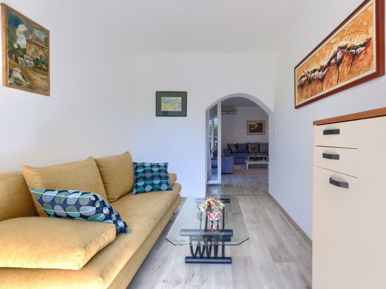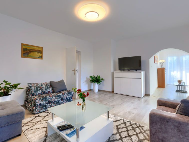 3-room apartment 100 m2, on the upper ground floor. Living room with satellite TV and air conditioning. Exit to the terrace. 1 room with 1 french bed (160 cm, length 200 cm). Exit to the balcony. 1 room with 2 beds (90 cm, length 200 cm). Exit to the balcony. Kitchen (oven, dishwasher, 4 ceramic glass hob hotplates, toaster, kettle, microwave, electric coffee machine) with dining table.