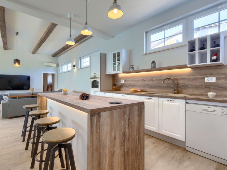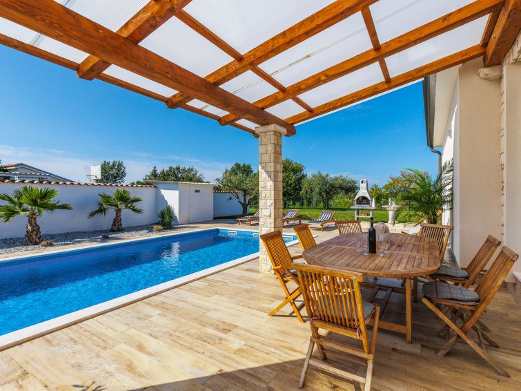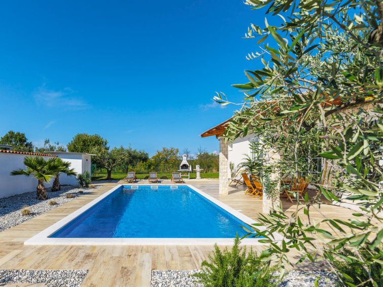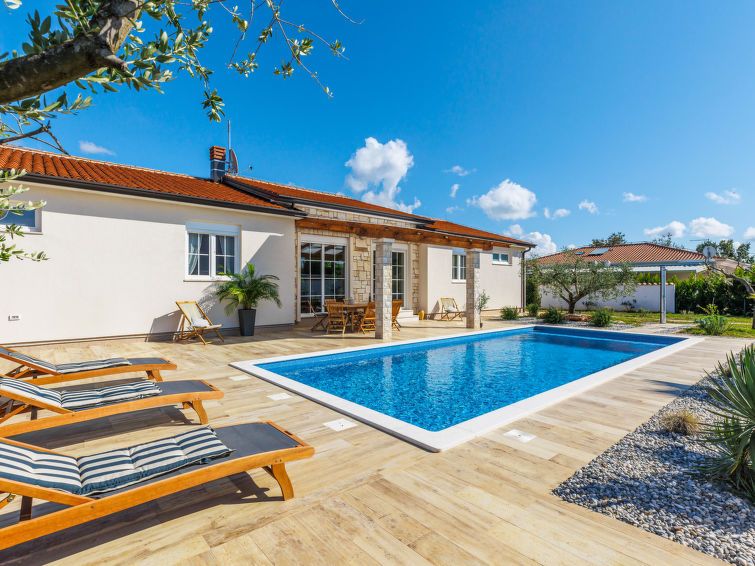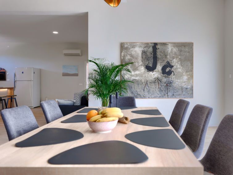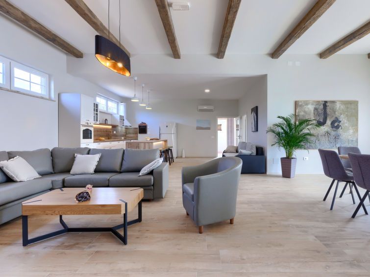 5-room villa 210 m2. Modern and tasteful furnishings: living/dining room 75 m2 with satellite TV (flat screen), air conditioning. Exit to the terrace, to the swimming pool. 2 rooms, each room with 1 french bed (180 cm, length 200 cm), shower/bidet/WC and air conditioning. 2 rooms, each room with 1 french bed (160 cm, length 200 cm), air conditioning.