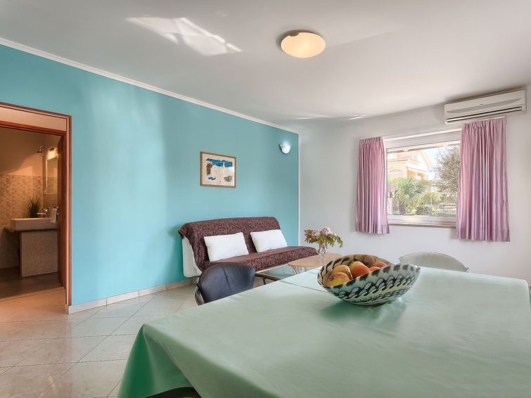 2-room apartment 40 m2, on the ground floor. Living/dining room with 1 double sofabed and satellite TV (flat screen), air conditioning. Exit to the terrace. 1 room with 1 double bed (2 x 80 cm, length 200 cm). Open kitchen (4 hot plates). Shower/WC. Terrace 15 m2. Terrace furniture.