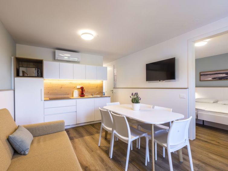 "Salinera A4+1", 3-room apartment 42 m2. Comfortable and tasteful furnishings: living/sleeping room with 1 sofabed, flat screen and air conditioning. Exit to the terrace. 1 room with 1 double bed (160 cm, length 200 cm). 1 room with 2 beds (90 cm, length 200 cm). Kitchenette (2 hot plates, dishwasher, microwave) with dining nook.