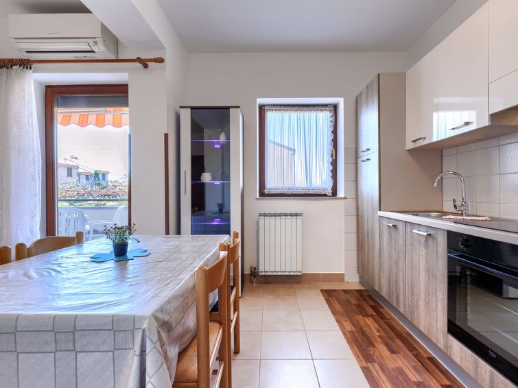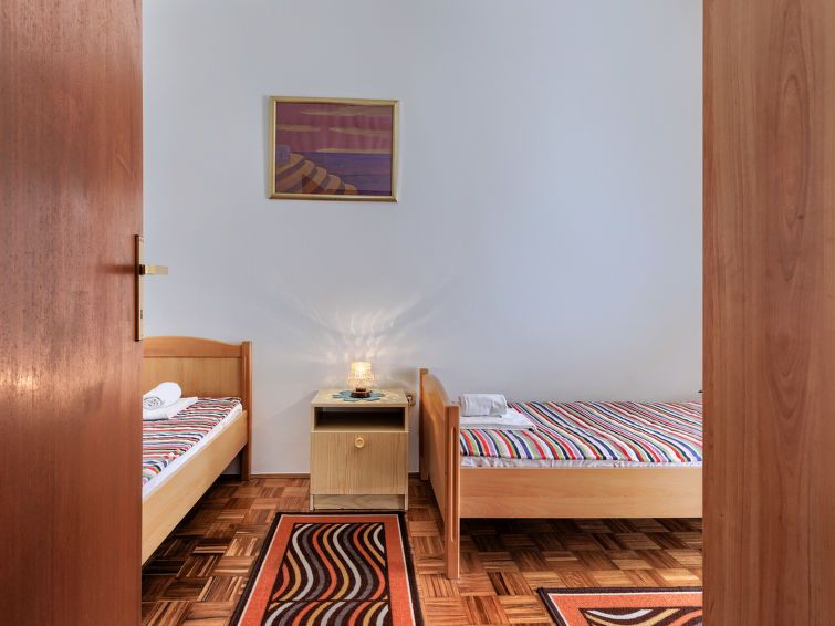 "Zoki 2", 3-room apartment 55 m2, on the upper ground floor. 1 room with 1 french bed (160 cm, length 200 cm), satellite TV. Exit to the balcony. 1 room with 2 beds (80 cm, length 200 cm). Exit to the balcony. Kitchen (oven, 4 ceramic glass hob hotplates, kettle, microwave, freezer) with dining table and air conditioning.