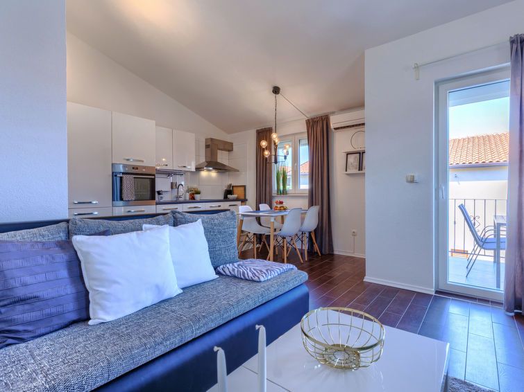 "Vanessa", 2-room apartment 52 m2 on 2nd floor. Object suitable for 2 adults + 2 children. Tasteful furnishings: open living/dining room with 1 bed (90 cm, length 190 cm), 1 sofabed, satellite TV and air conditioning. Exit to the terrace. 1 room with 1 french bed (160 cm, length 200 cm).