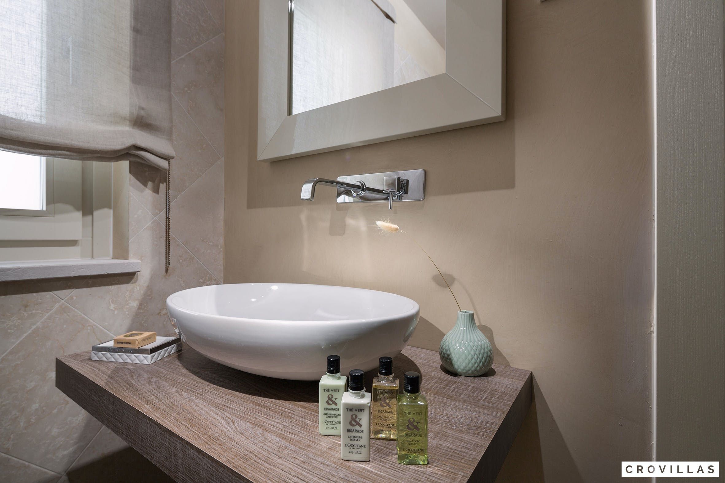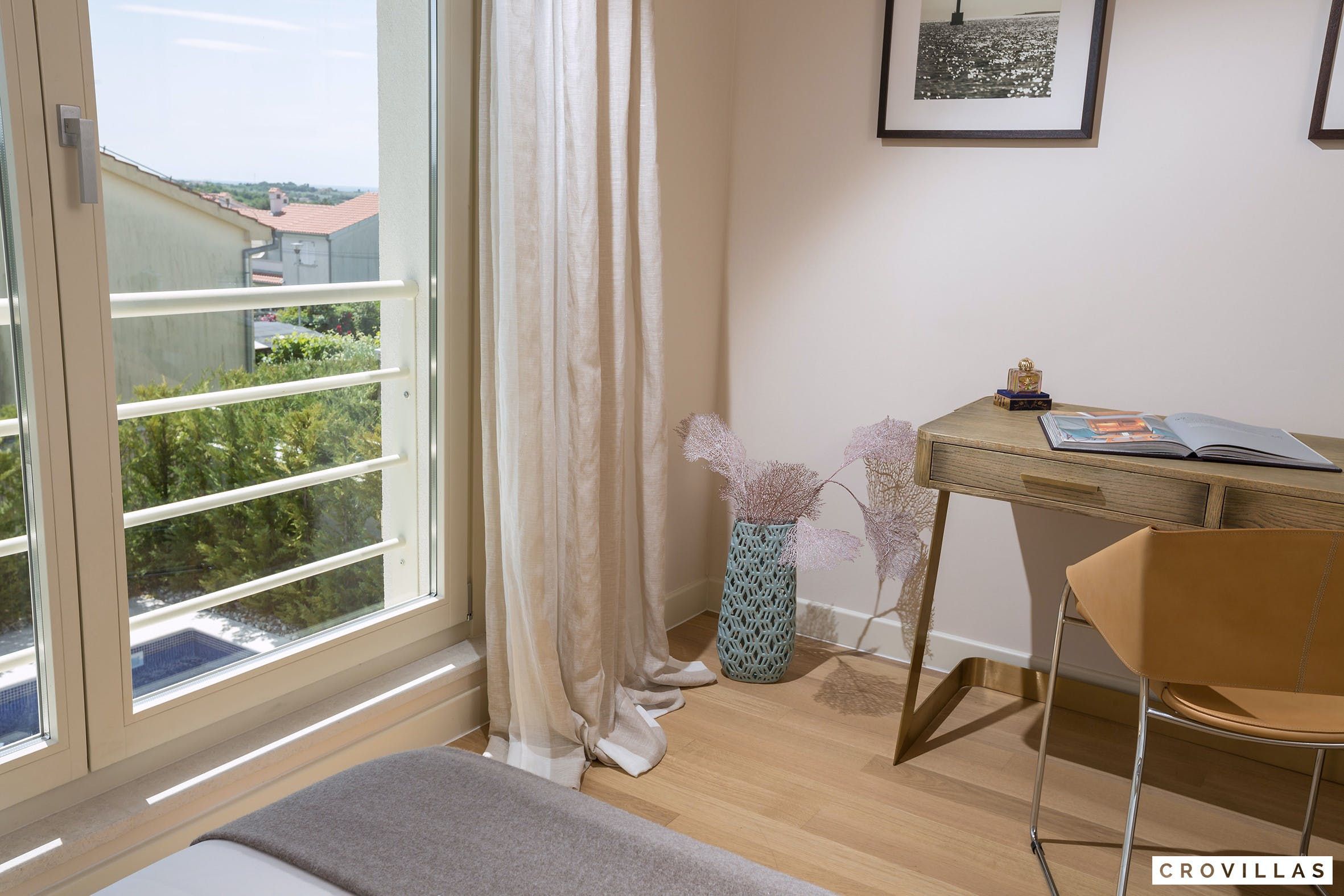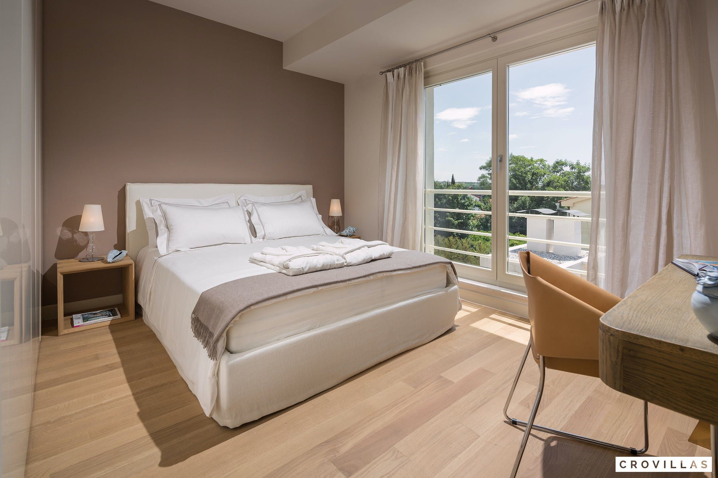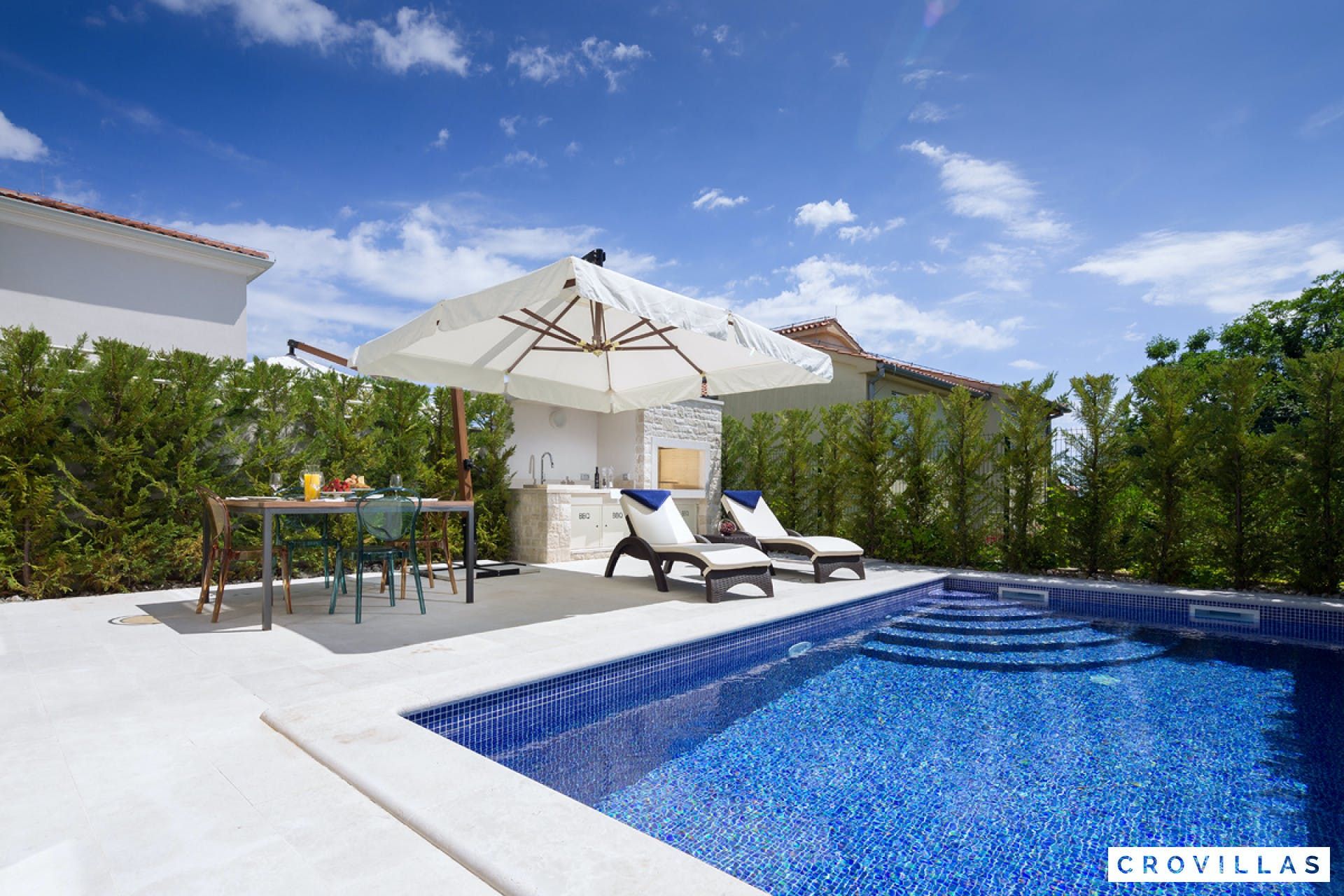 This resort villa is a must-see for those who want a classy and comfortable stay. The building, which stretches towards the Mediterranean sky, is surrounded by an exclusive area that is architecturally pleasing to the eye. Large window fronts make the villa bright and cosy while a terrace elegantly nestles in front of the magnificent building. The chic 18m² pool is accessed via a wide staircase and daybeds invite guests to relax and enjoy themselves. A covered outdoor kitchen and barbecue are available for evening dinners, and a beautiful large table is located in the outdoor dining room. The interior of the spacious villa is distinguished, exclusive, and uncompromisingly luxurious with modern lighting and decoration. The open kitchen offers high-quality equipment for self-catering days. The upper floor houses two double bedrooms, one with an en-suite bathroom. Another separate bathroom with a bathtub is also on this level. This five-star villa comes highly recommended for a luxurious stay.