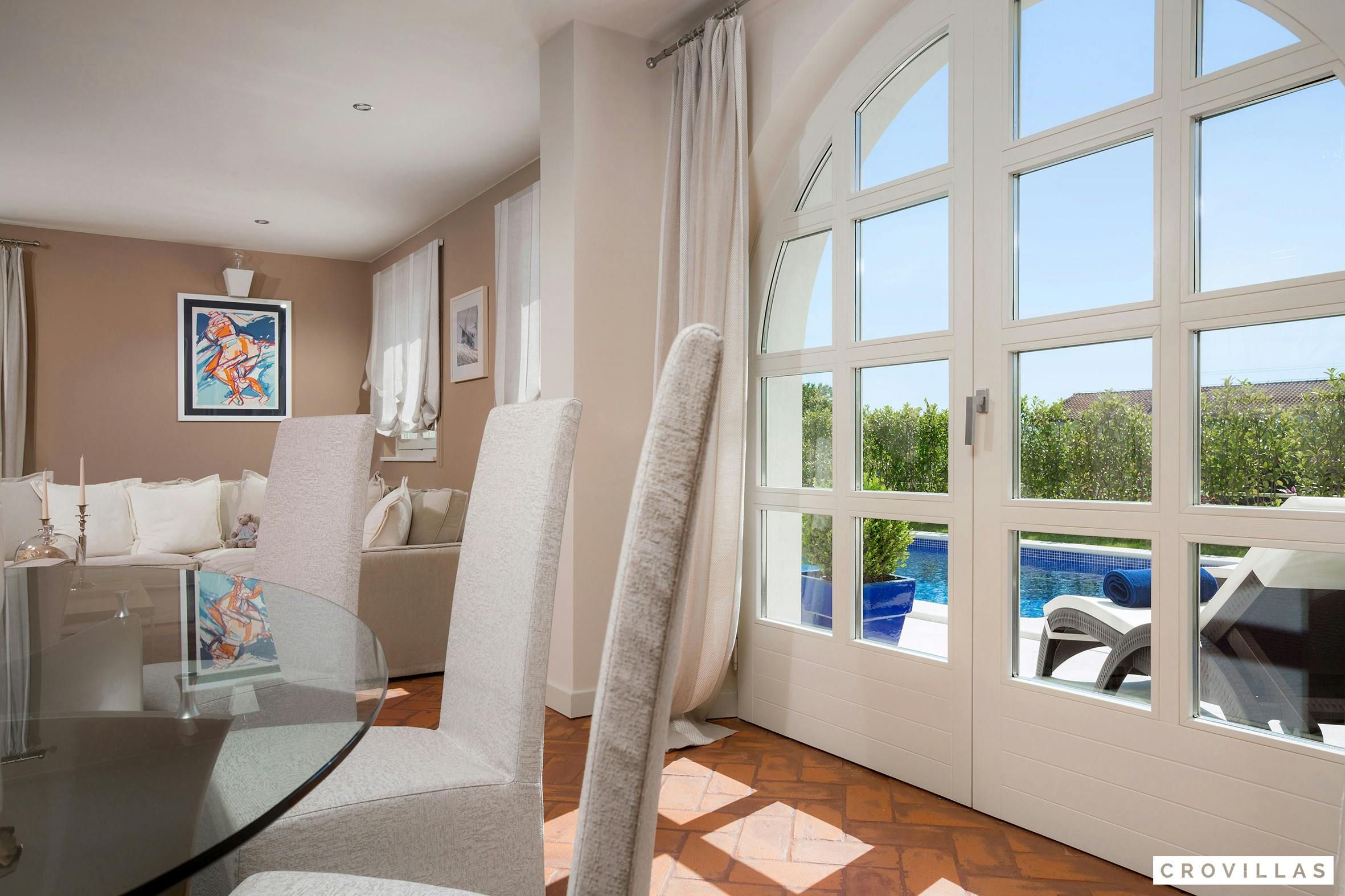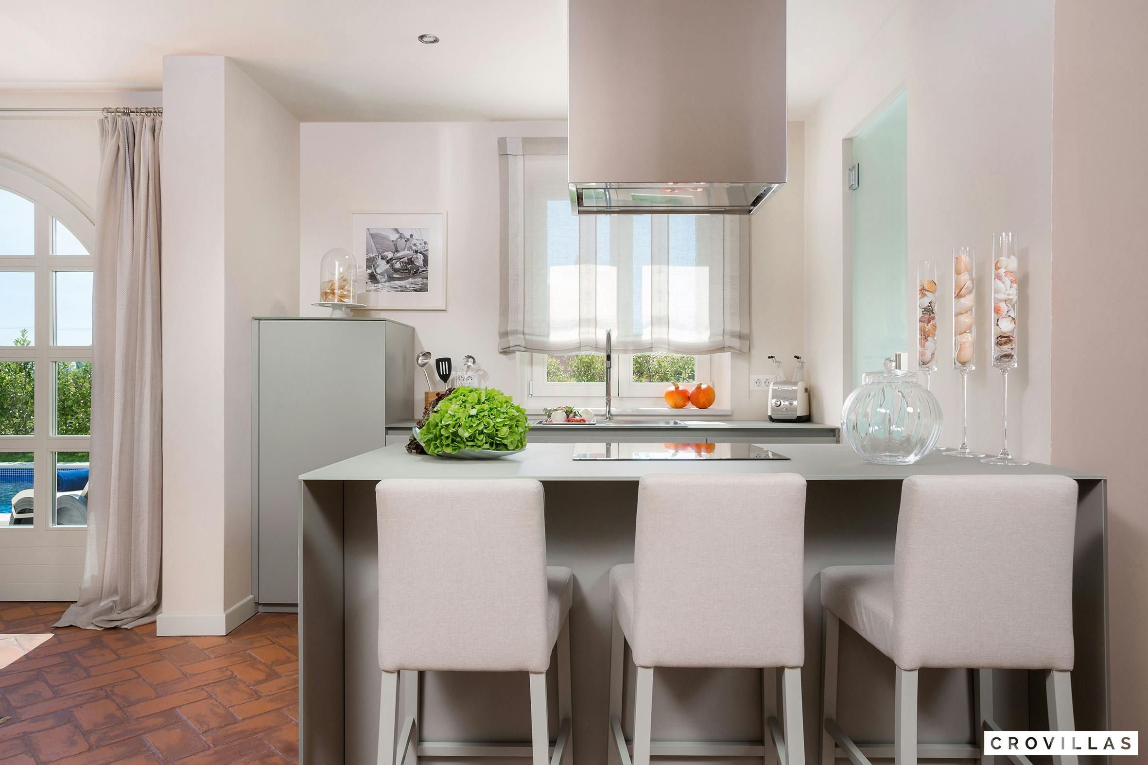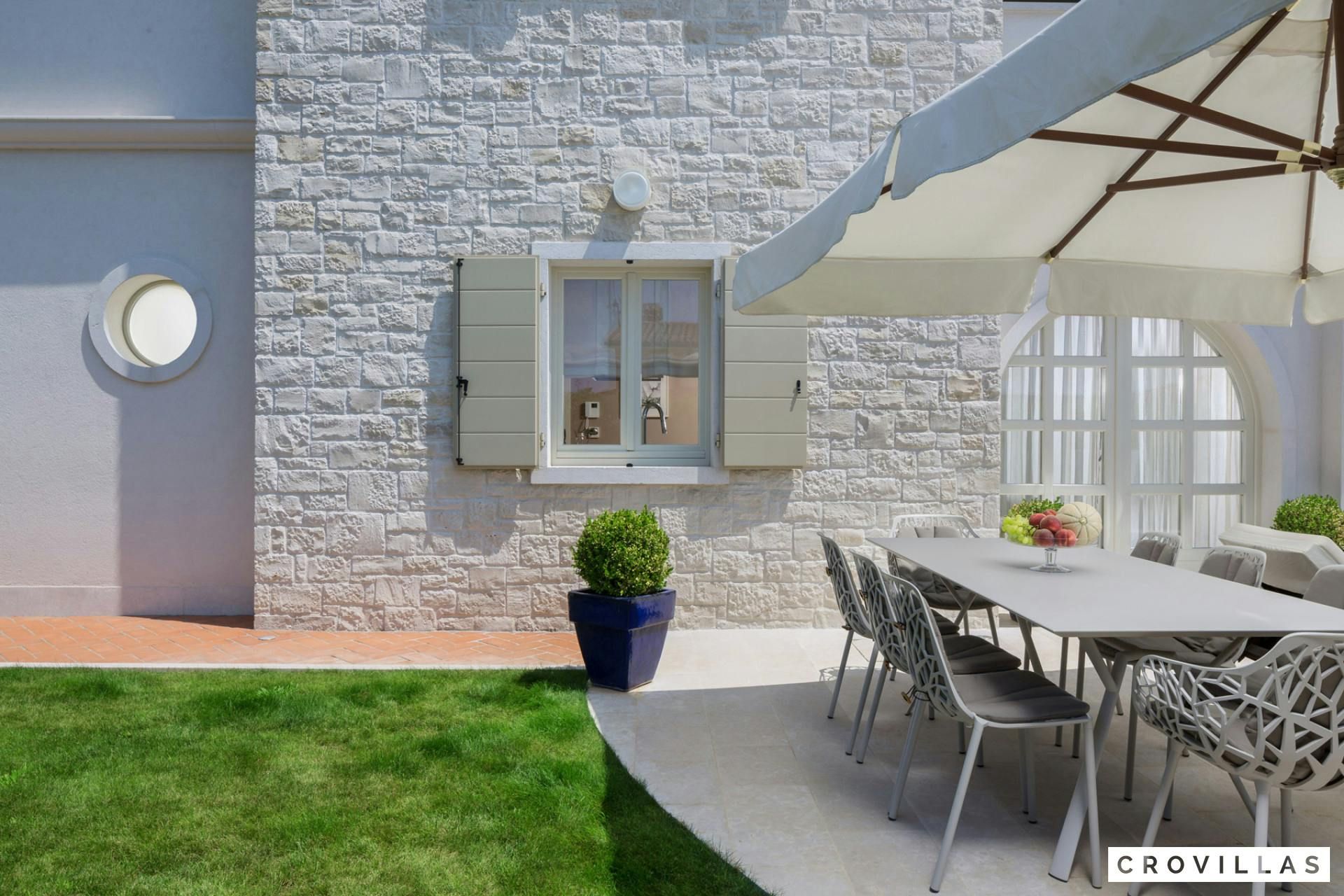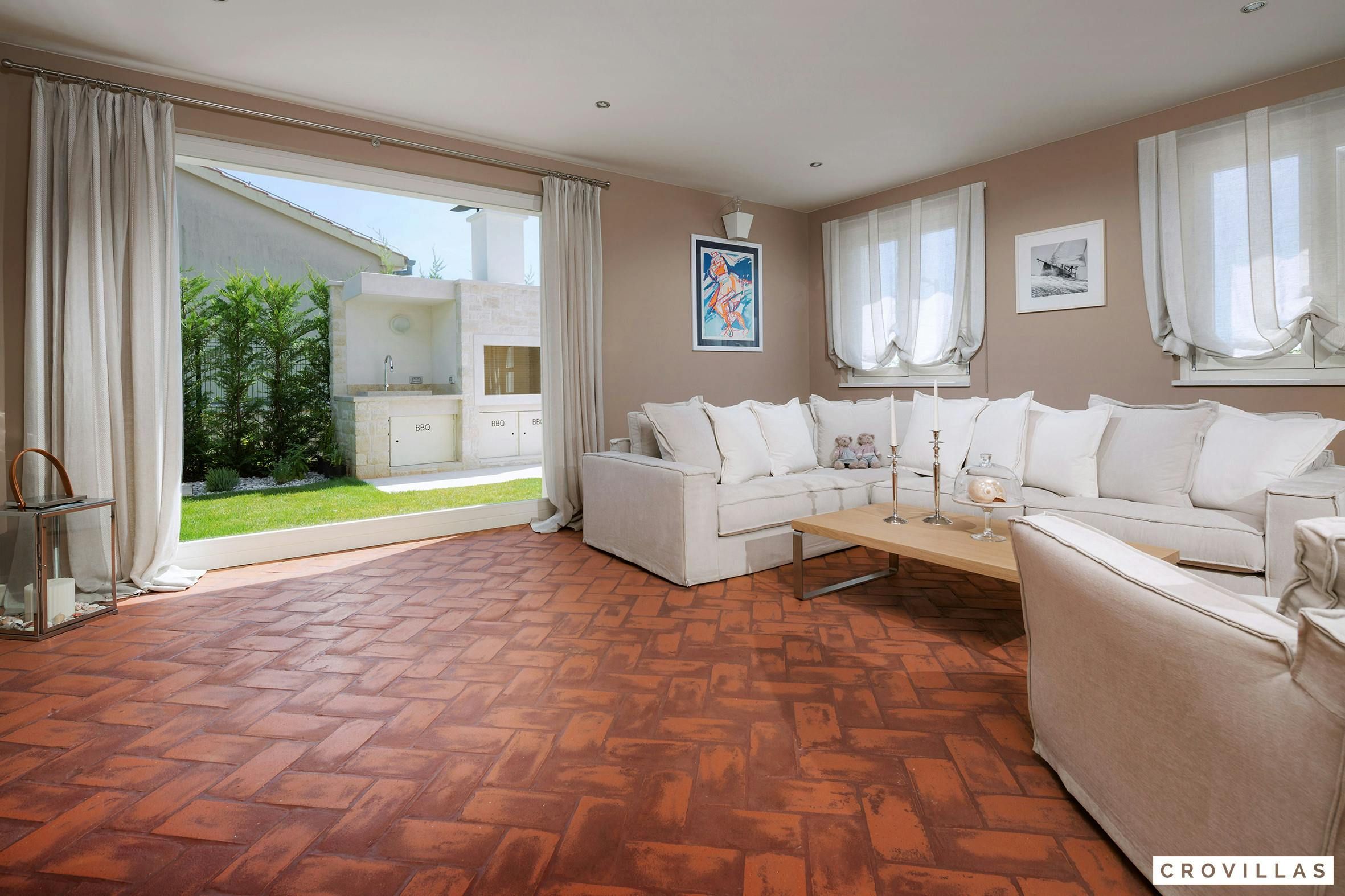 This resort villa is a perfect blend of luxury and comfort. The building, surrounded by a beautifully designed area, features large window fronts that make the villa appear cosy and bright. The terrace elegantly nestles in front of the magnificent building and frames the chic, 28m² pool, which can be accessed via a wide staircase for sporty laps as well as for shallow gliding in the refreshing water. Very comfortable daybeds invite you to extended relaxation hours. The barbecue and covered outdoor kitchen guarantee an enjoyable evening dinner at the beautiful large table located in the outdoor dining room. The interior of the very spacious villa is distinguished and uncompromisingly exclusive with modern lighting and decoration that underline the upscale ambience. The upper floor houses two double bedrooms, each with an en suite bathroom, one of which also has access to the balcony with comfortable seating.